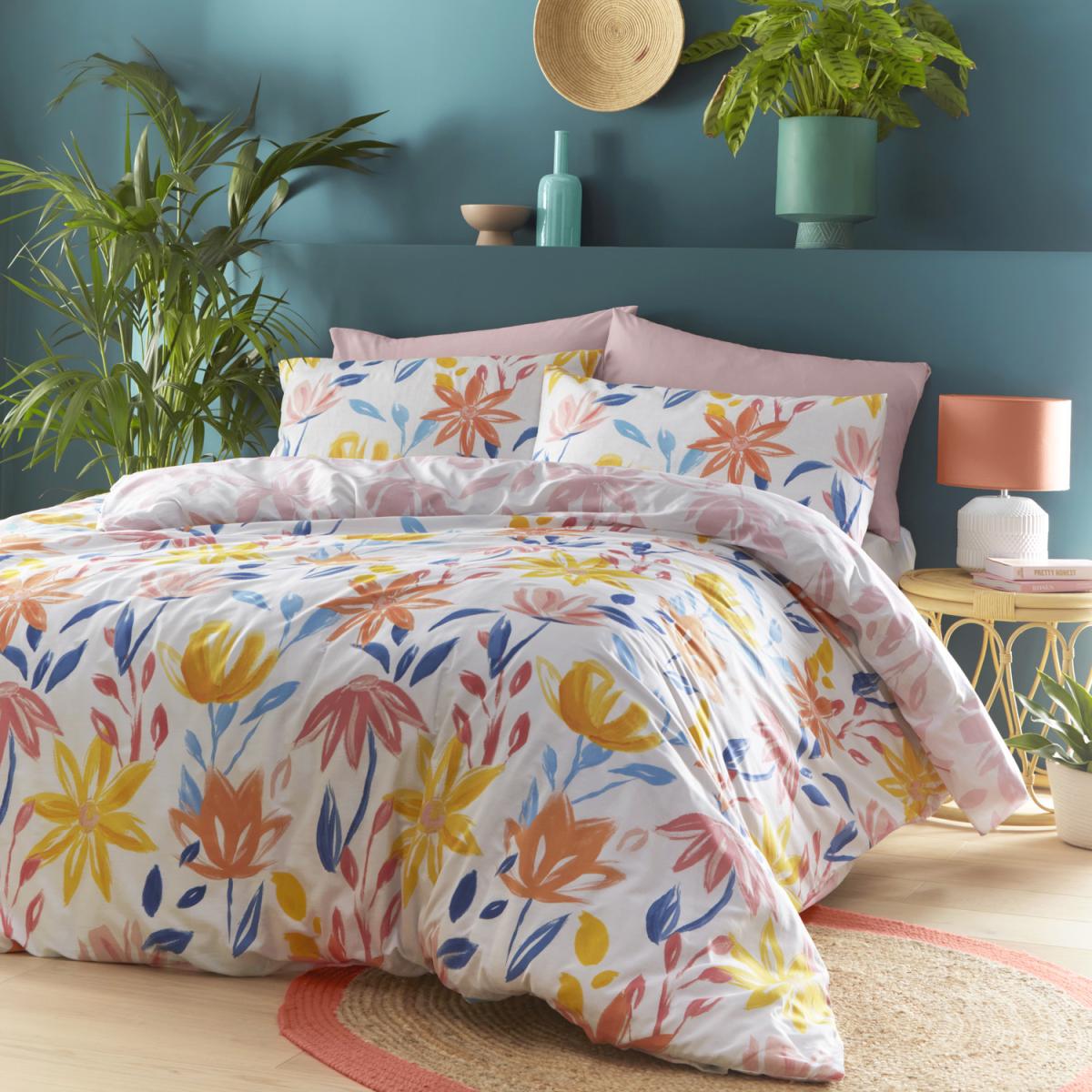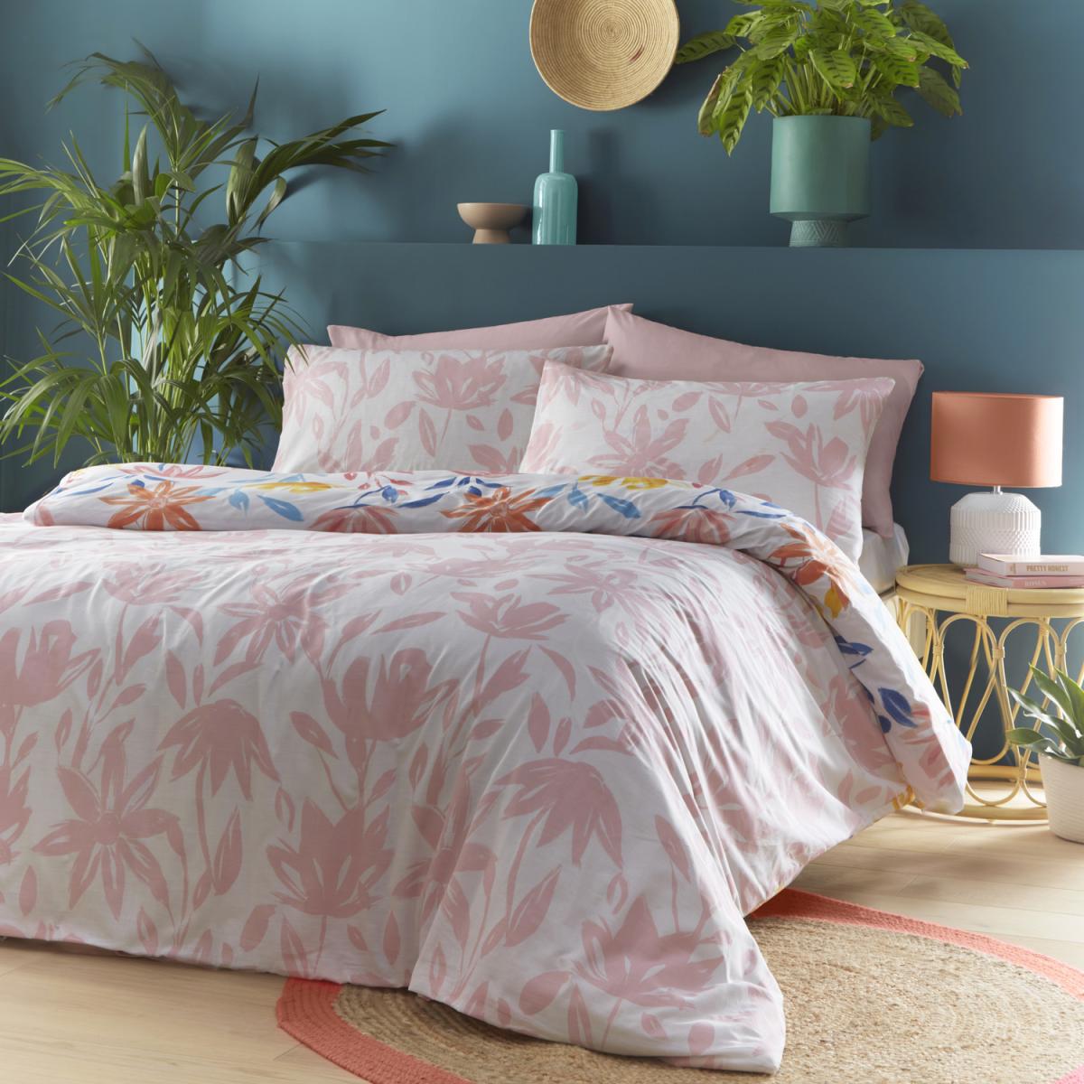 Escape into the vibrant bunches of summer florals. With statement bright watercolour flowers, be divinely guided into this warm summery duvet. A pastel pink version is contrast on the reverse, available in Single to Super King Size.