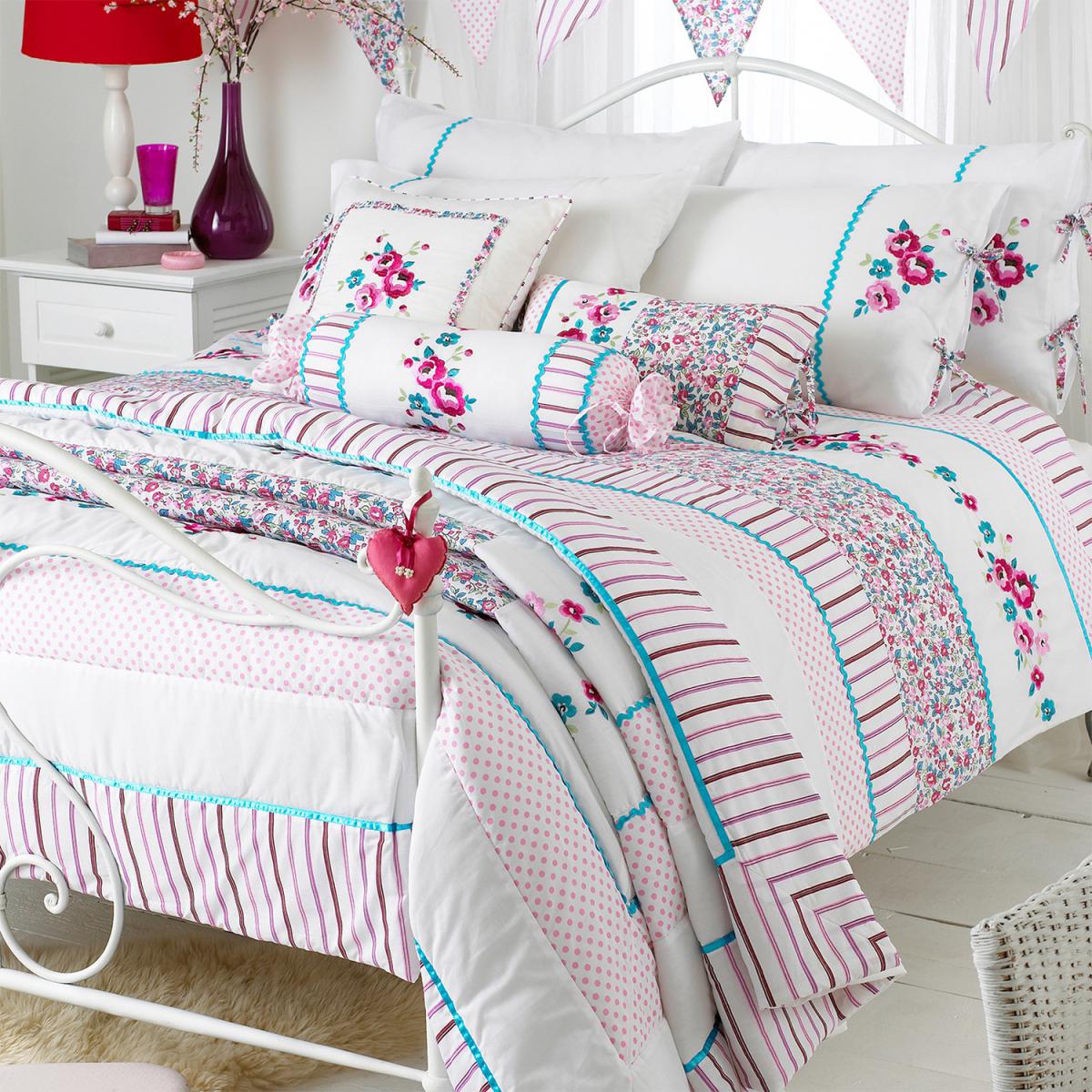This bedspread features a whimsical, bright floral pattern on a crisp white base that will elevate the most basic of rooms. With a plethora of different textures from embroidered flowers to a decorative blue ribbon separating the striped border it'll be an instant statement piece to any bedroom. This feminine bedspread is filled with 100% polyester to keep you warm and snug all year round.