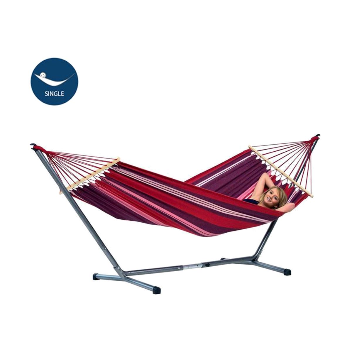 As its name suggests, this hammock is supplied complete with its own stand which is so easy to put together (and take apart for simple storage). This single hammock is bright and cheerful yet strong and sturdy, whilst the black powder-coated stand complements it perfectly. It will hold up to 100 kg in weight and has plenty of room for you to relax.