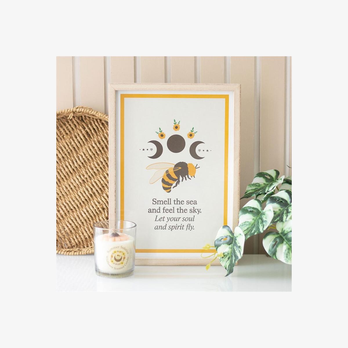 This framed print features a Summer Solstice-inspired design of a bee, sunflowers, and moon phases, and an inspirational text "Smell the sea and feel the sky. Let your soul and spirit fly." The wooden frame adds a rustic touch, perfect for displaying in a bedroom, living room or office space as a gentle reminder to embrace the season's vibrant energy. Sawtooth hangers on reverse.