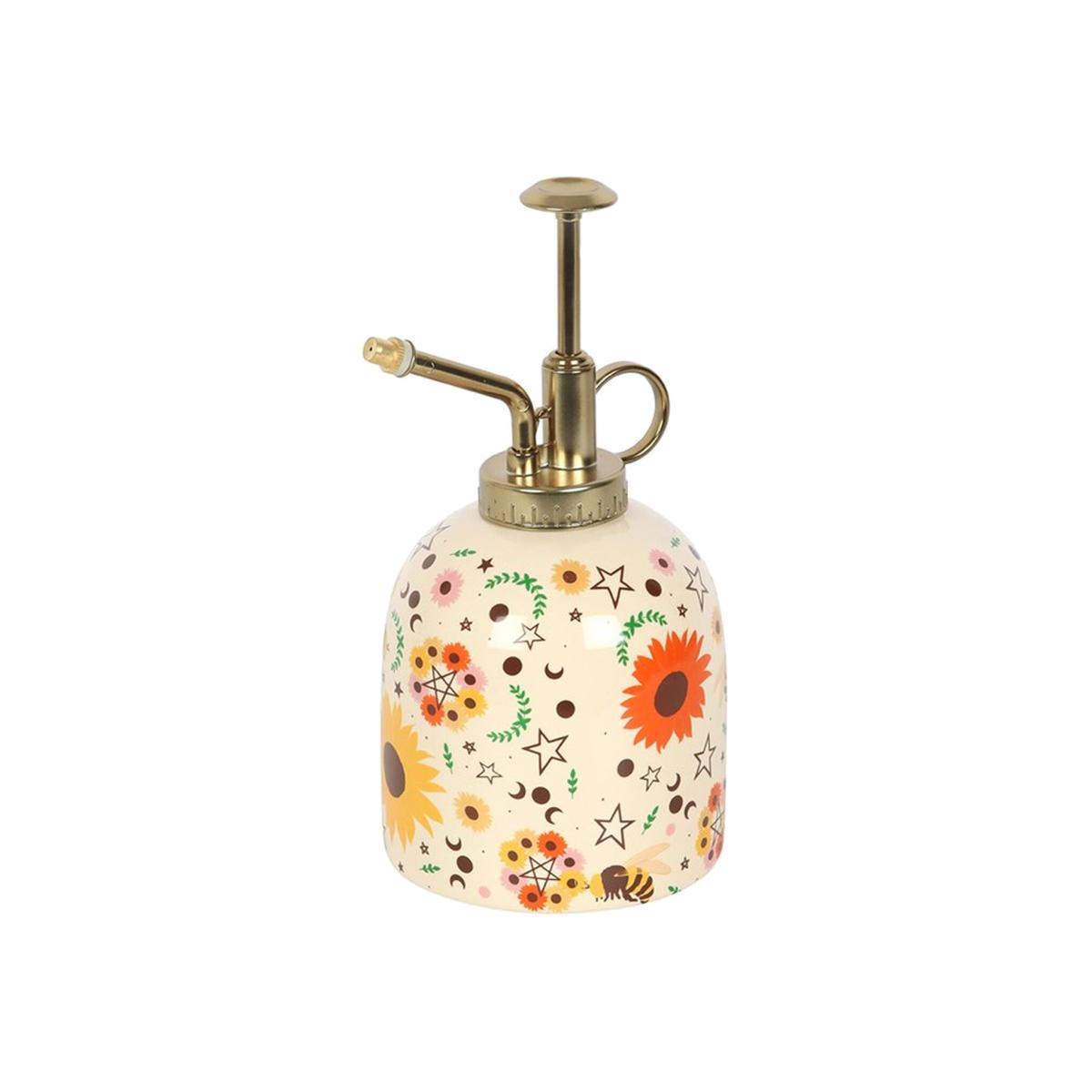 Keep indoor plants hydrated during the summer with this ceramic plant mister, adorned with a Summer Solstice inspired print with bees, sunflowers, pentagrams and moon phases. Featuring gold detailing for a premium look, this plant mister is perfect for nurturing plants and to display as a unique decor piece. Simply fill with water and mist plants until ideal hydration is achieved.
