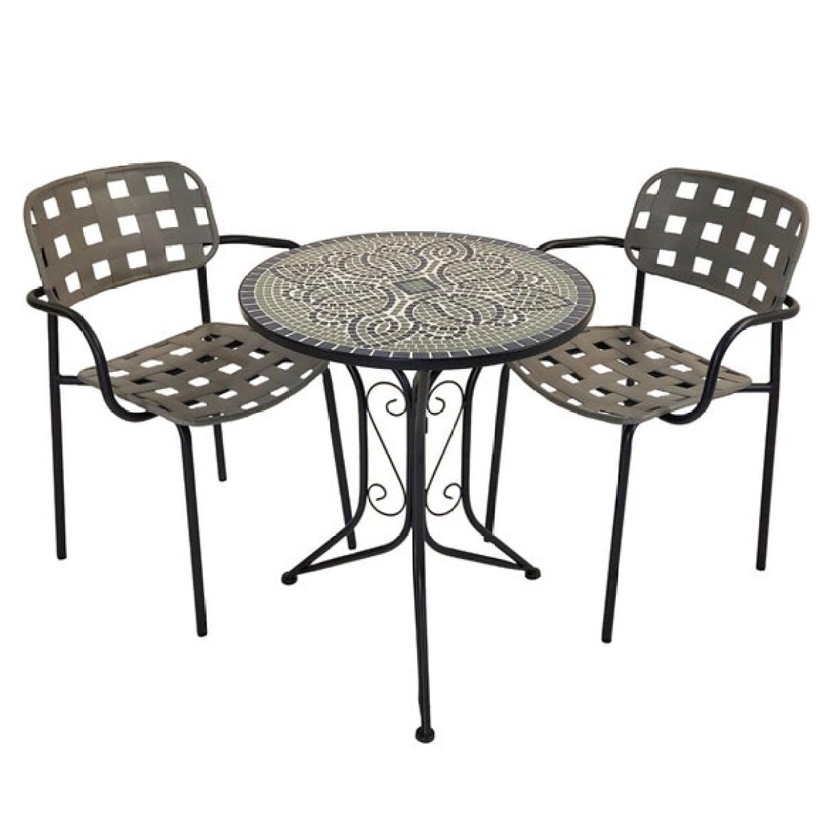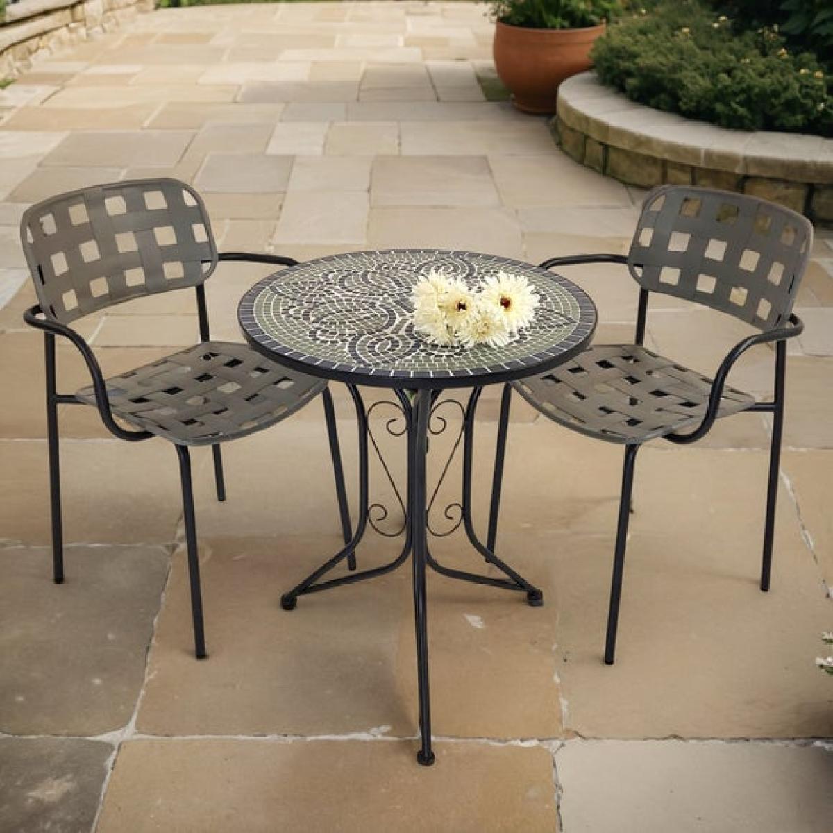 * Mosaic ceramic tile table * 70cm diameter * Decorative steel base * Perfect for two * 2 Karin chairs * Stackable The Summer Terrace Atlanta Round Bistro Table features a geometric design with grey tiles and crisp white grout, adding modern style to any setting. Perfectly sized for two, it’s ideal for cosy outdoor dining or smaller spaces. The lightweight Karin chairs are easy to move and built to last, combining comfort with practicality. Designed for both indoors and outdoors, this set requires minimal maintenance. Stylish and functional, it’s a great choice for relaxed meals or quiet moments.