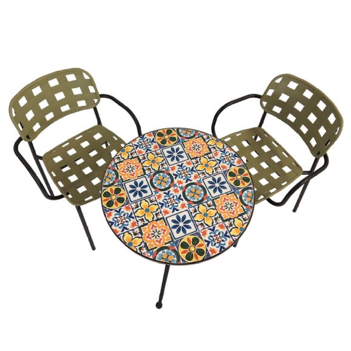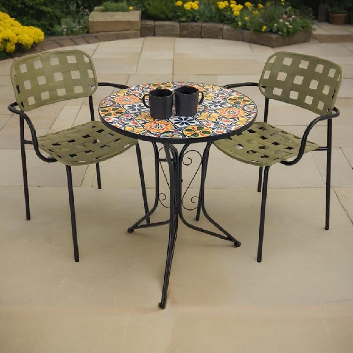 * Multicoloured mosaic table * Ceramic tiles * Sturdy steel frame * Lightweight Karin chairs * Stackable for easy storage The Summer Terrace Charlotte Round Bistro Table showcases a stunning mosaic design that brings a burst of colour to any garden or patio. Built for both indoor and outdoor use, the table features a smooth ceramic top and a durable black powder-coated steel frame, ensuring lasting strength against the elements. Paired with the sleek and lightweight Karin chairs, this set combines style and resilience effortlessly. Minimal assembly means you can enjoy your new dining space in no time. Perfect for intimate meals or relaxing moments, this compact set is a vibrant addition to your outdoor living.