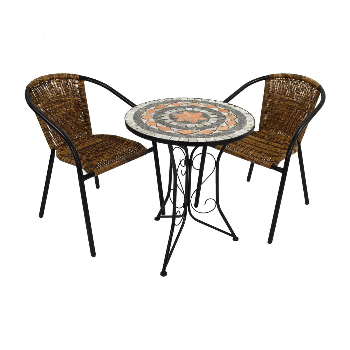 The Nova mosaic bistro set is large enough at 60cm to sit 2 diners comfortably. The top is made from ceramic tiles that have a riven finish to mimic natural stone, the table legs are made from steel and are powder coated black. The San Luca chairs are stacking, are also made from steel and the weather resistant wicker is synthetic and has a brown twisted finish. Please note, unfortunately we cannot deliver this item to the Channel Islands.