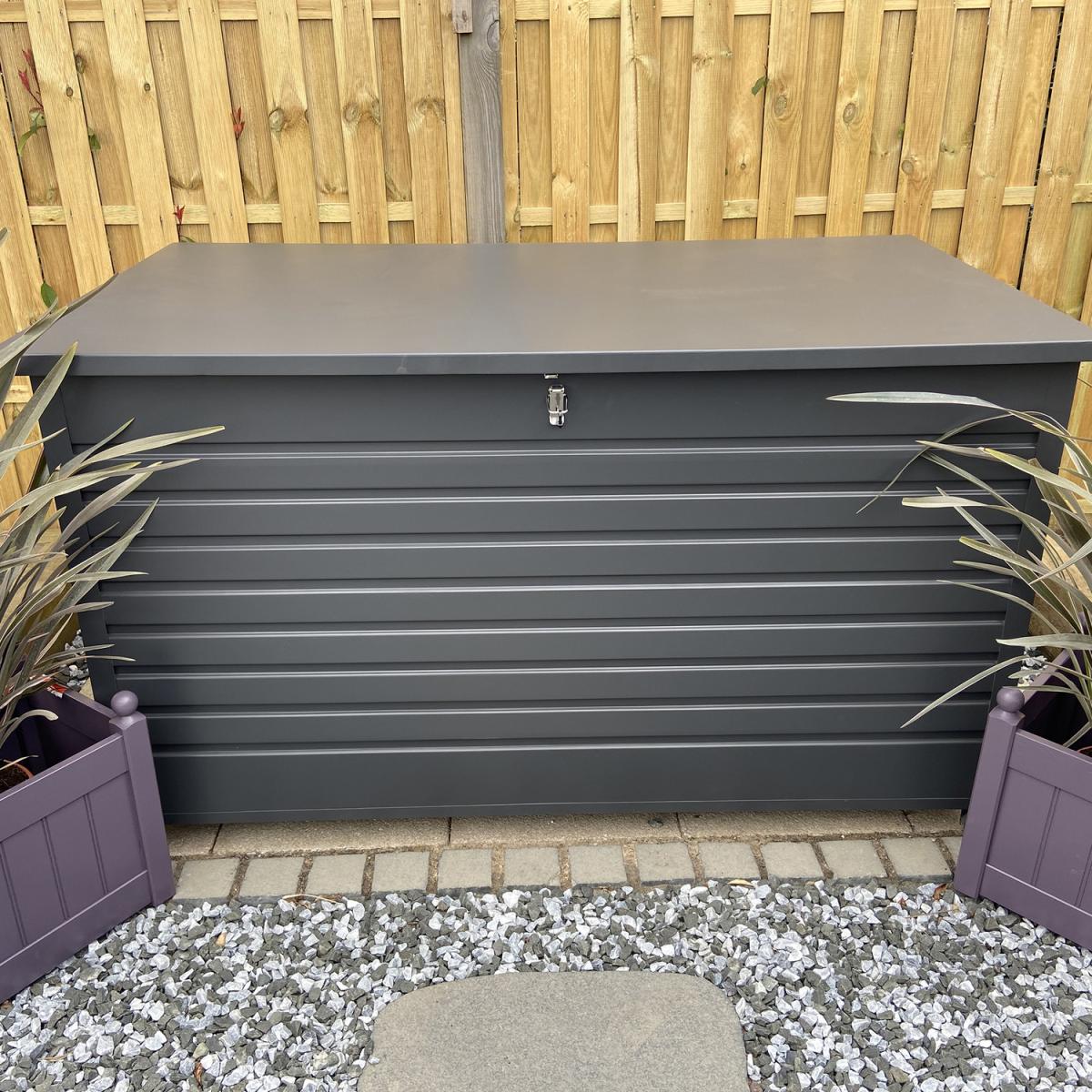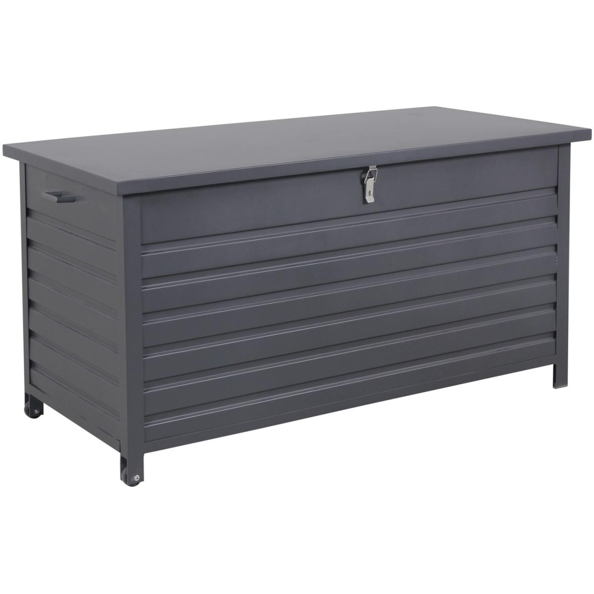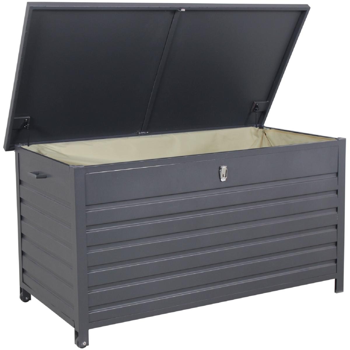Safely store your outdoor furniture cushions or other garden essentials in the versatile Robert Charles Sumo Large Metal Garden Cushion and Storage Box. Constructed with a powder-coated Aluminium frame and body, this metal box has a handle and wheels on one end, allowing it to be easily moved around the garden and patio. There is a zip-up, removable lining inside the box to protect your contents from the elements. The lid is fitted with two hydraulic hinges that open and close the lid with ease. The silver closing hatch secures the lid shut and has a small hole, which can be padlocked if extra security is required.