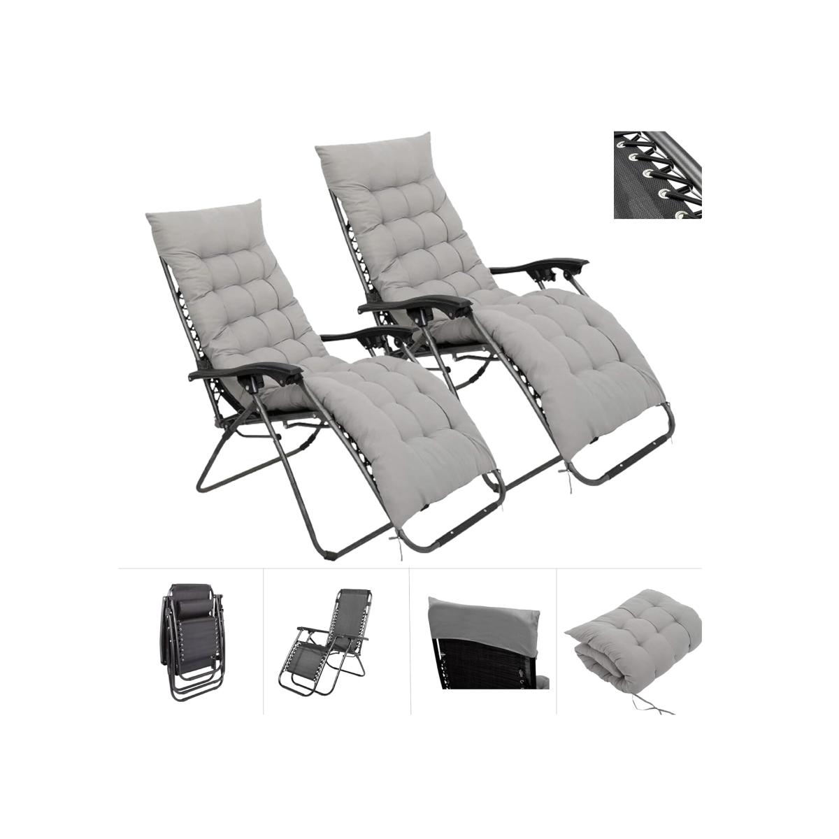 Relax in luxurious comfort with this set of 2 zero gravity sun loungers featuring 8 cm thick padded cushions. Designed to evenly distribute body weight, they reduce pressure on joints and spine. With adjustable reclining from 90 to 170 degrees, foldable portability, and a durable alloy steel frame, these chairs are ideal for gardens, patios, or camping. Enjoy true weightless relaxation. Sun Lounger Chairs Set - Grey
