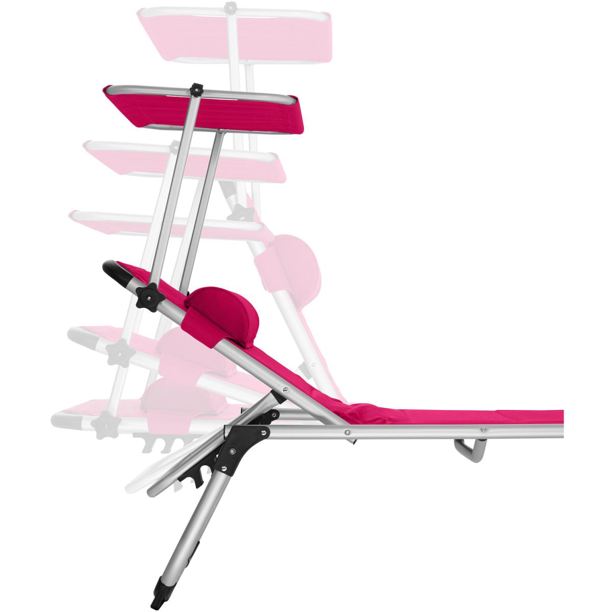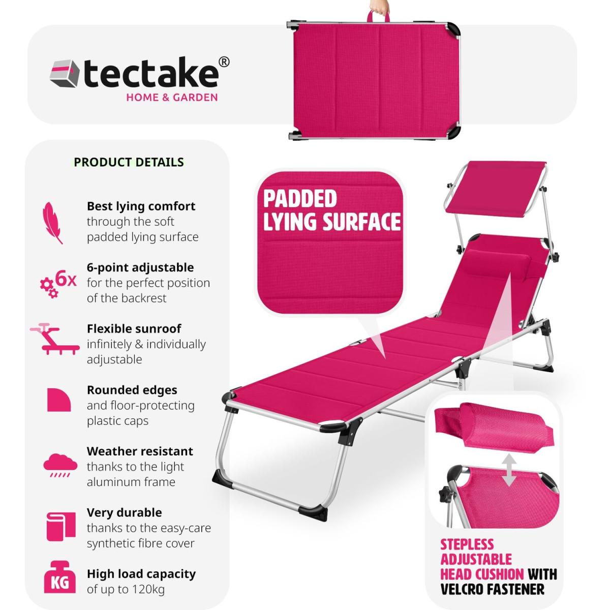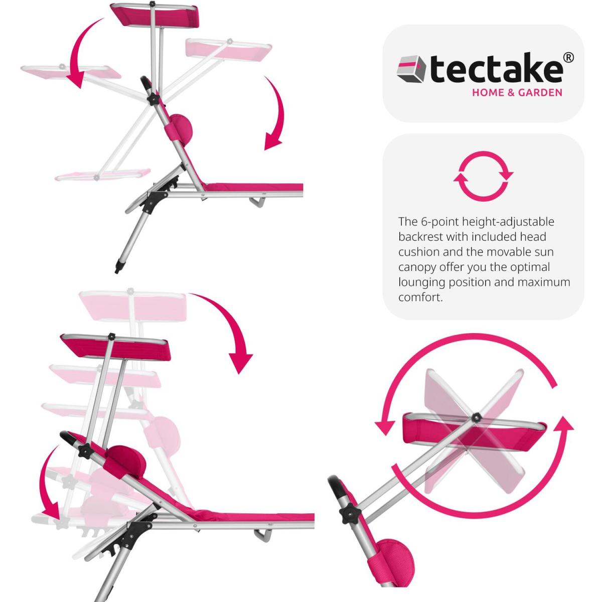 Make sure you get the best spot in the garden with this functional sun lounger Lorella from tectake. The secure aluminium frame and robust cover of the chair guarantee stability and exceptional durability. Thanks to a clever folding mechanism and lightweight design, these outdoor loungers can be easily transported using the practical carry handles or simply stored in a space-saving way. With six different adjustable positions, the backrest features a comfortable pillow as well as a sun shade, providing perfect holiday vibes from the privacy of your home garden and patio. The recliner is perfect for catching the rays in your garden sun trap, or at the beach on a long summer day. Get the sun lounger Lorella from tectake and enjoy everything summer has to offer.
