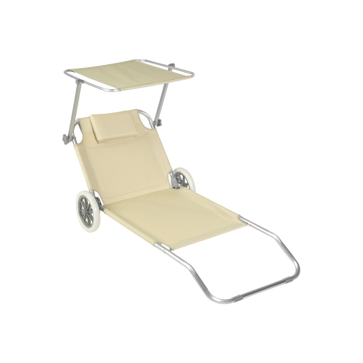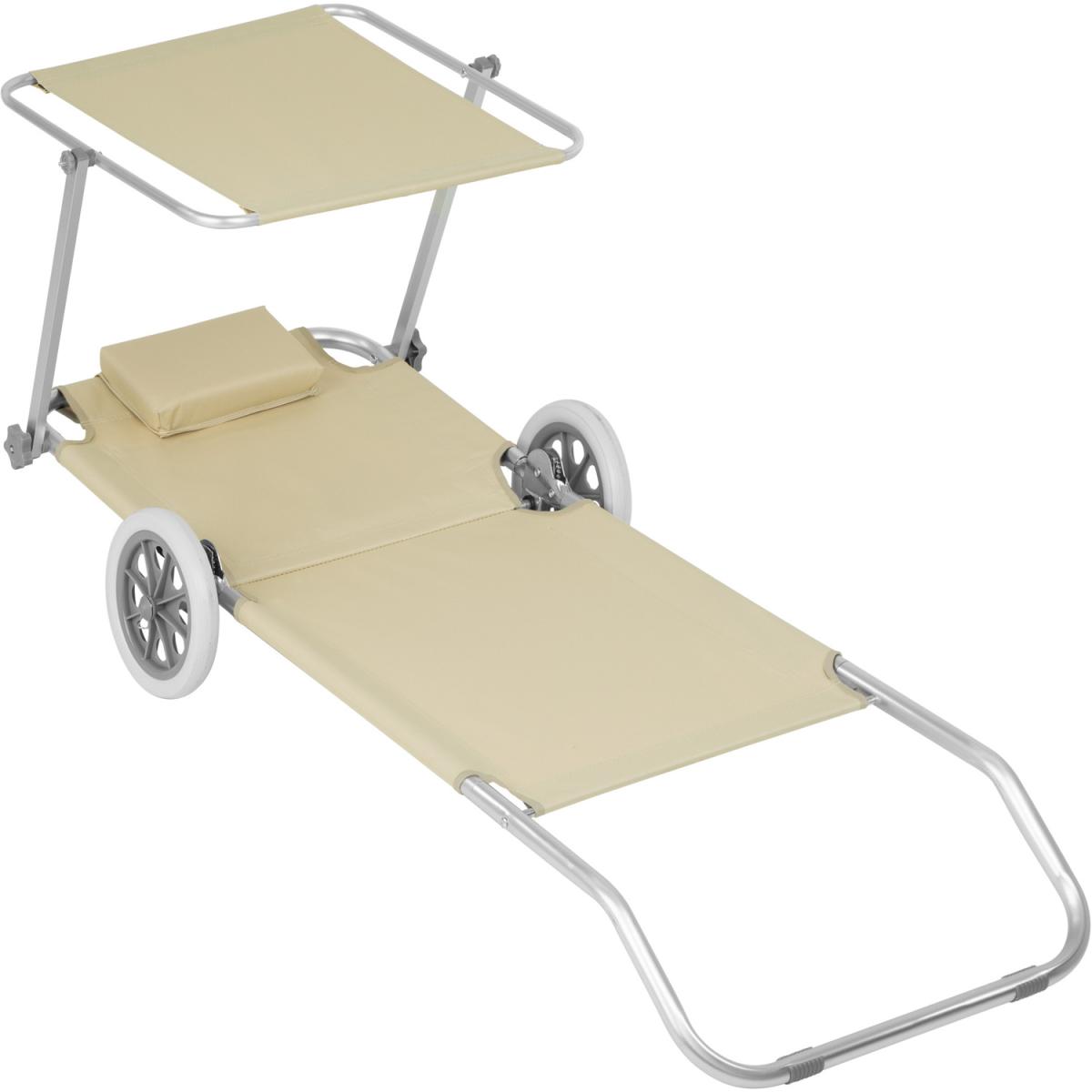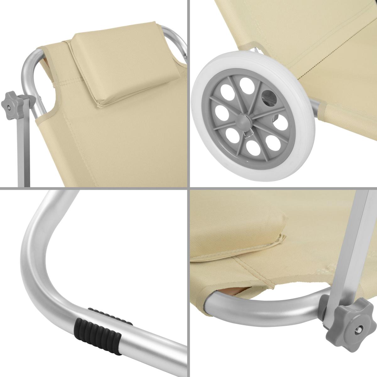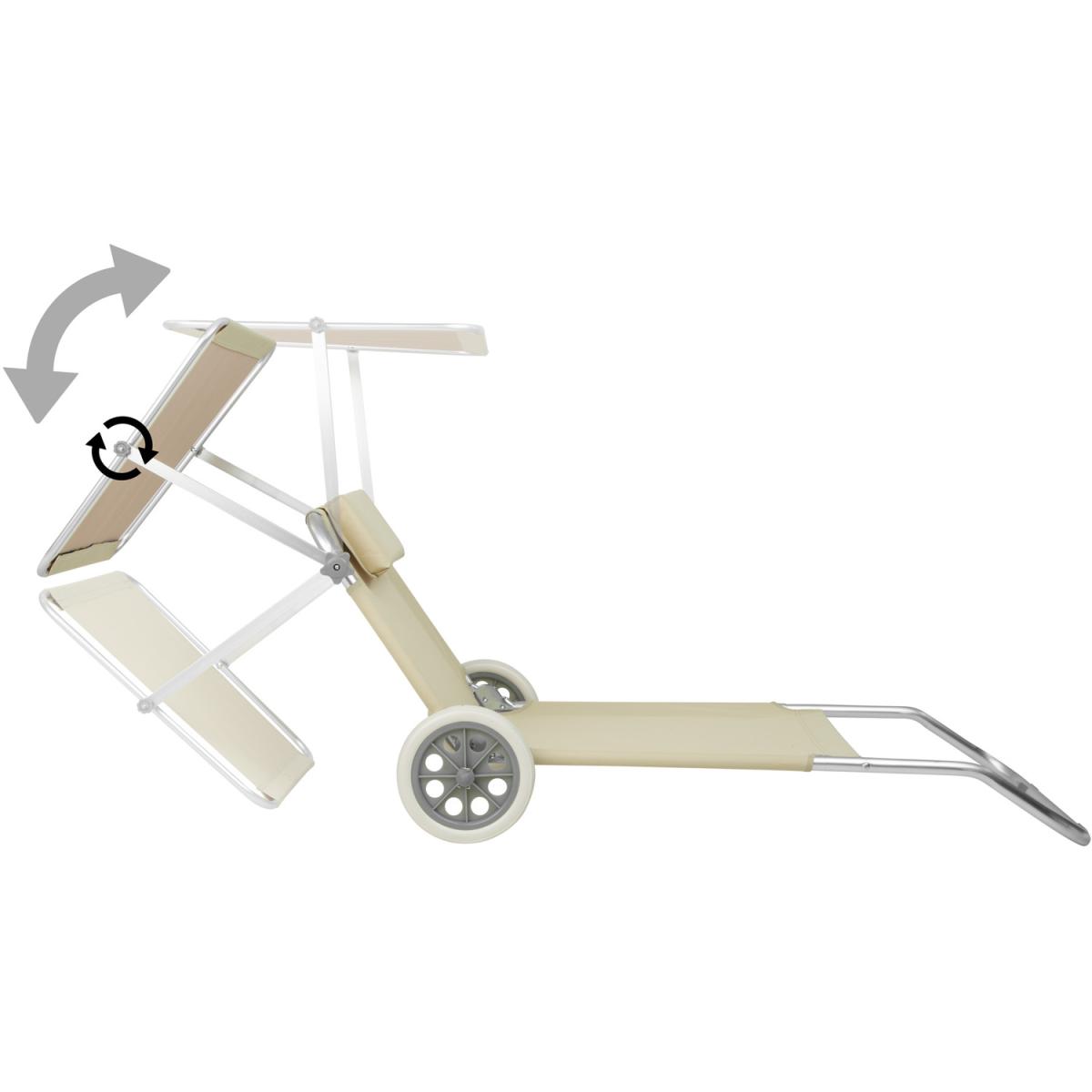 No more available sun loungers on the beach or the pool You won't care with this portable aluminium sun lounger from tectake. This super lightweight folding sun lounger on wheels is easy to pull and won't sink into the sand thanks to its large rubber wheels. The durable upholstery and soft headrest guarantee hours of comfortable sunbathing. The lying position and sun shade can be flexibly adjusted, guaranteeing a relaxing experience in the sun. Once folded, the lounger becomes a transport trolley for towels, flip flops and other bathing essentials. With this folding sun lounger from tectake, you'll always have the best spot at the beach, in your home garden or on an outdoor camping holiday.