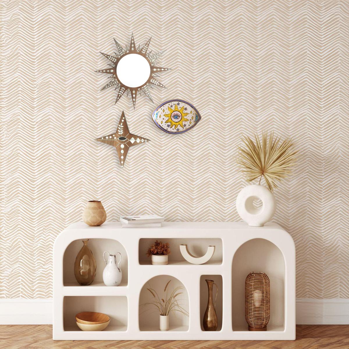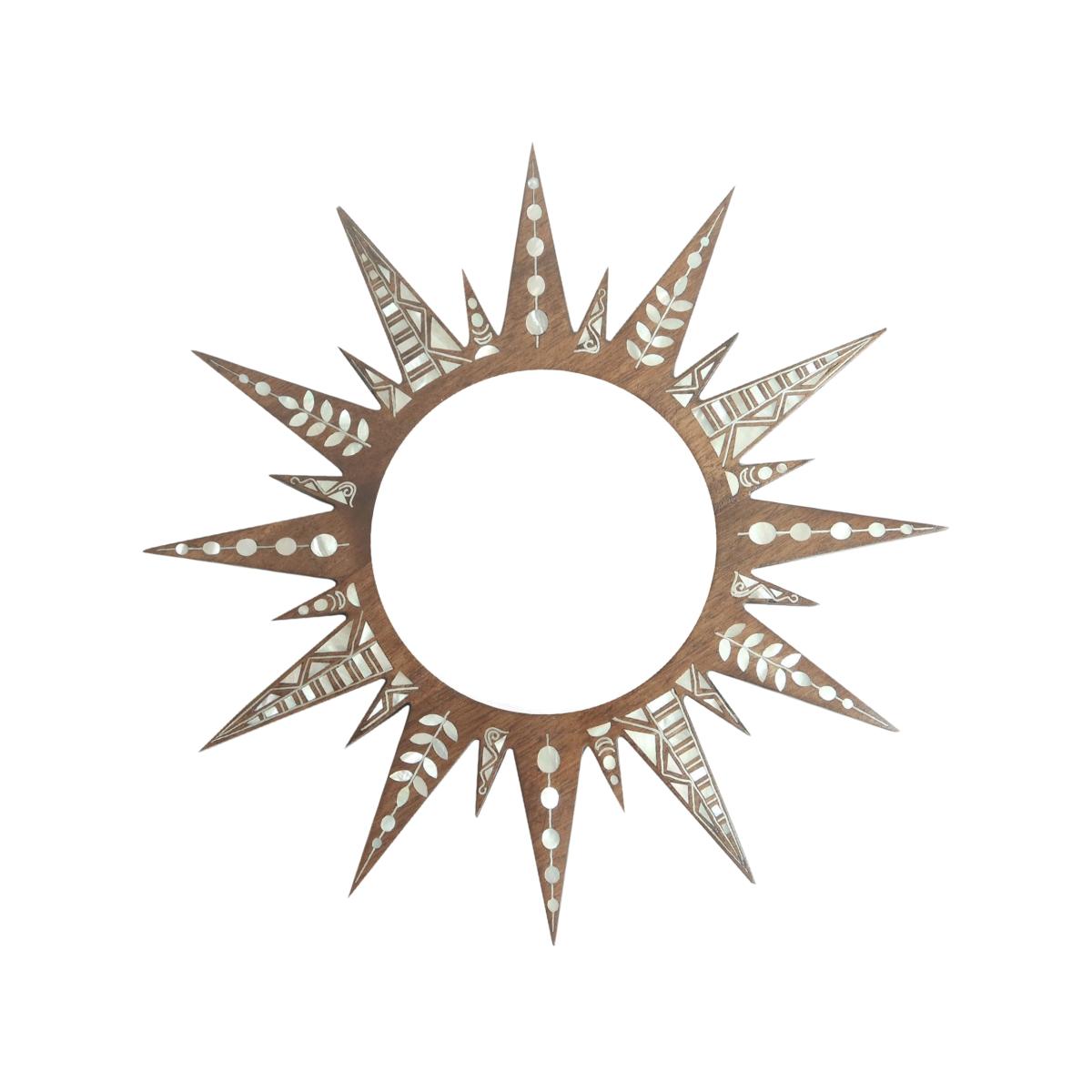 Handmade with love, the Sun Mother of pearl Marquetry Mirror is an exquisite blend of natural materials and craftsmanship. Featuring a radiant sun design, this wall decor is meticulously crafted from Mother of Pearl and walnut wood, creating a striking contrast and a luxurious finish. The reflective mirror at the center beautifully complements the intricate marquetry, making this piece a perfect focal point for any room. Details: Materials: Mother of Pearl + Walnut Wood Dimensions: Radius 34.5 cm Handcrafted with meticulous marquetry techniques. This mirror brings a touch of elegance and natural beauty to your home, ideal for living rooms, entryways, or bedrooms.