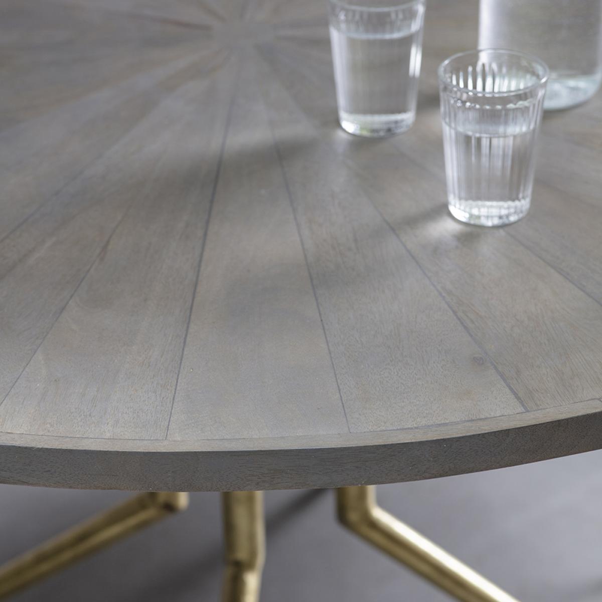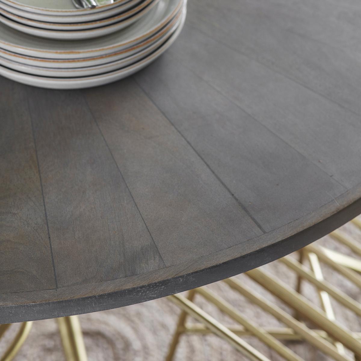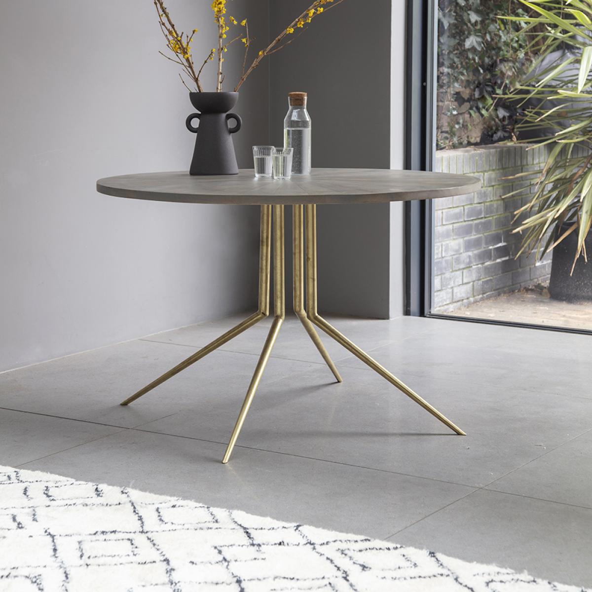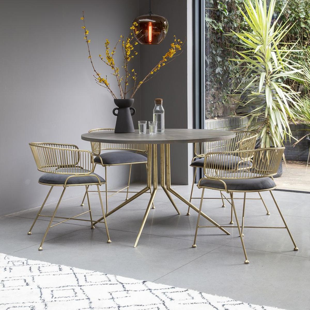 When Bought As A Set (Full RRP £1,565.00) A generously sized table perfect for sociable dining with family or friends, our Sunburst Round Dining Table has a grey wash applied to the tabletop that will complement any dining room or open-plan kitchen-dining space. This large round table features a parquet sunburst pattern on its surface which is made up of carefully arranged pieces of mango wood. The table is finished with four brass plated iron legs which are strong and sturdy. Your new Dining Room Set is complimented by 4 elegant metal and upholstered Ella Dining Chairs perfect for any occasion. Our Ella Metal Dining Chairs in Grey Velvet combines an ultra-comfortable seat pad upholstered in soft and luxurious cotton velvet with a curved wire back and refined brass legs.