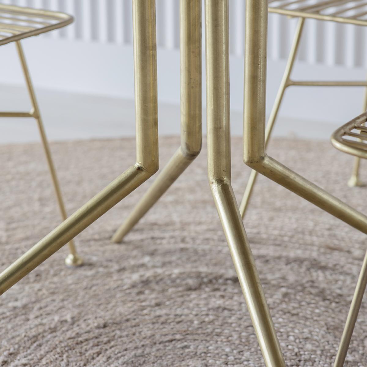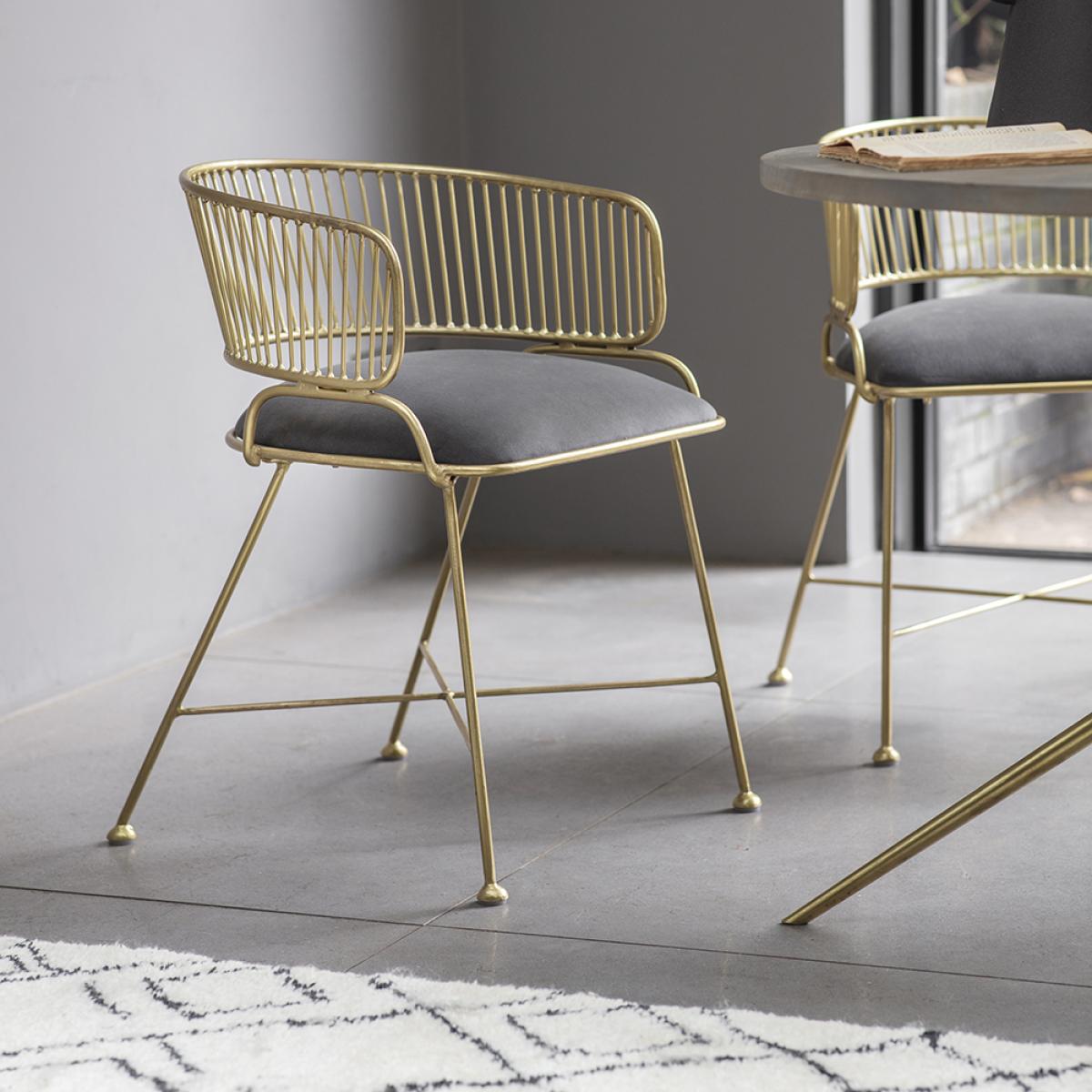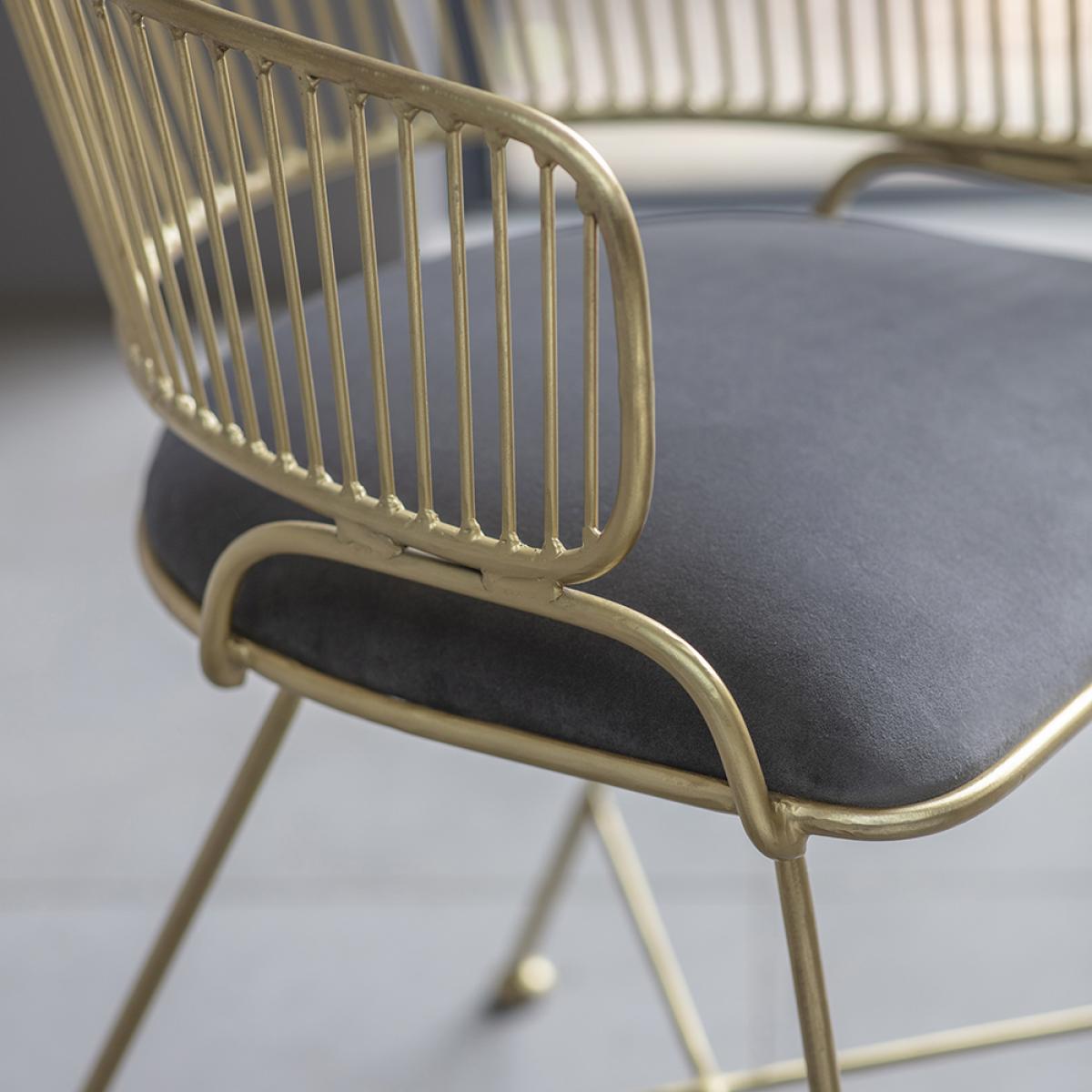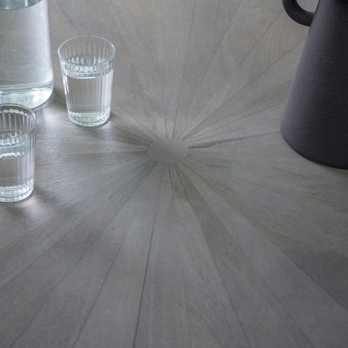 When Bought As A Set (Full RRP £1,565.00) A generously sized table perfect for sociable dining with family or friends, our Sunburst Round Dining Table has a grey wash applied to the tabletop that will complement any dining room or open-plan kitchen-dining space. This large round table features a parquet sunburst pattern on its surface which is made up of carefully arranged pieces of mango wood. The table is finished with four brass plated iron legs which are strong and sturdy. Your new Dining Room Set is complimented by 4 elegant metal and upholstered Ella Dining Chairs perfect for any occasion. Our Ella Metal Dining Chairs in Grey Velvet combines an ultra-comfortable seat pad upholstered in soft and luxurious cotton velvet with a curved wire back and refined brass legs.