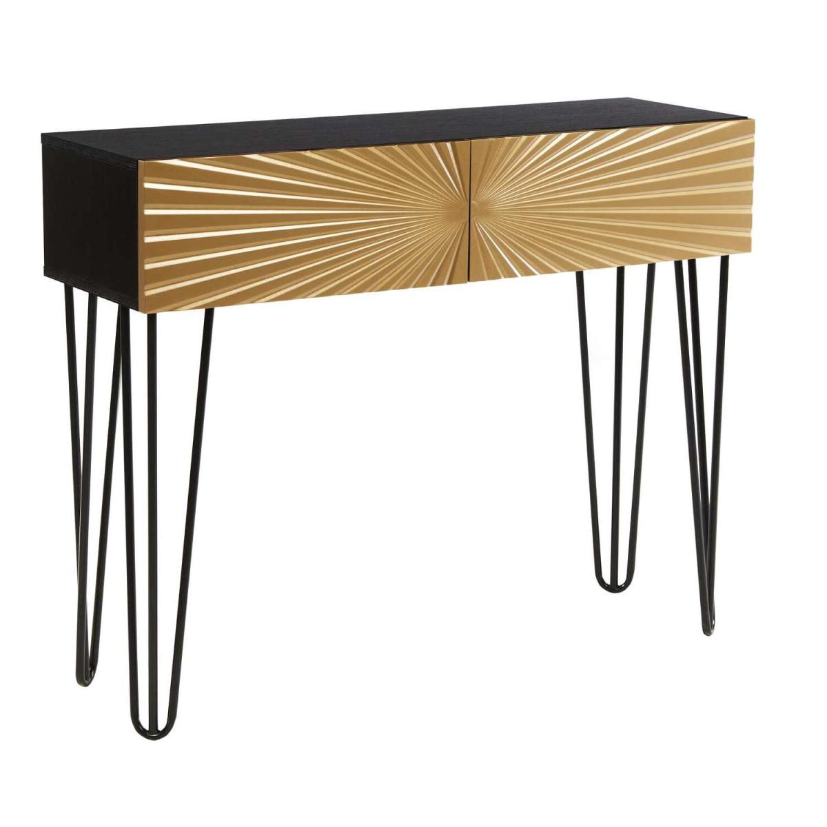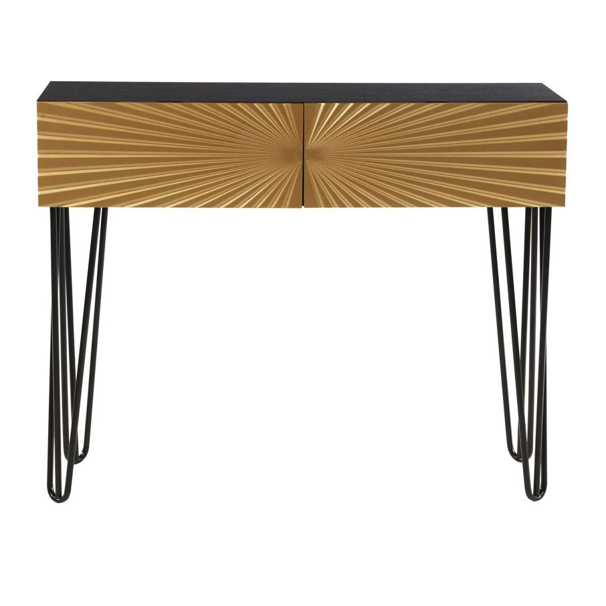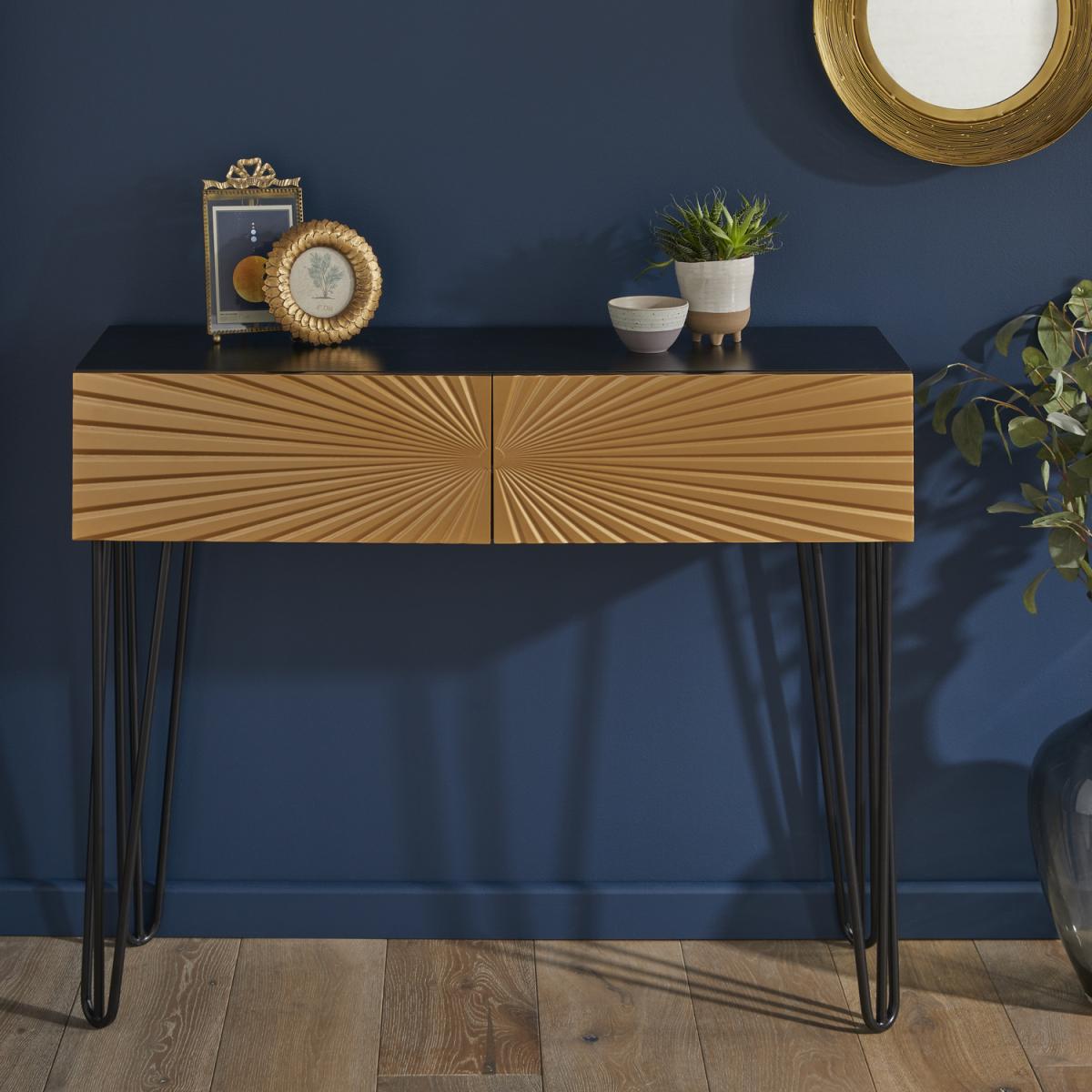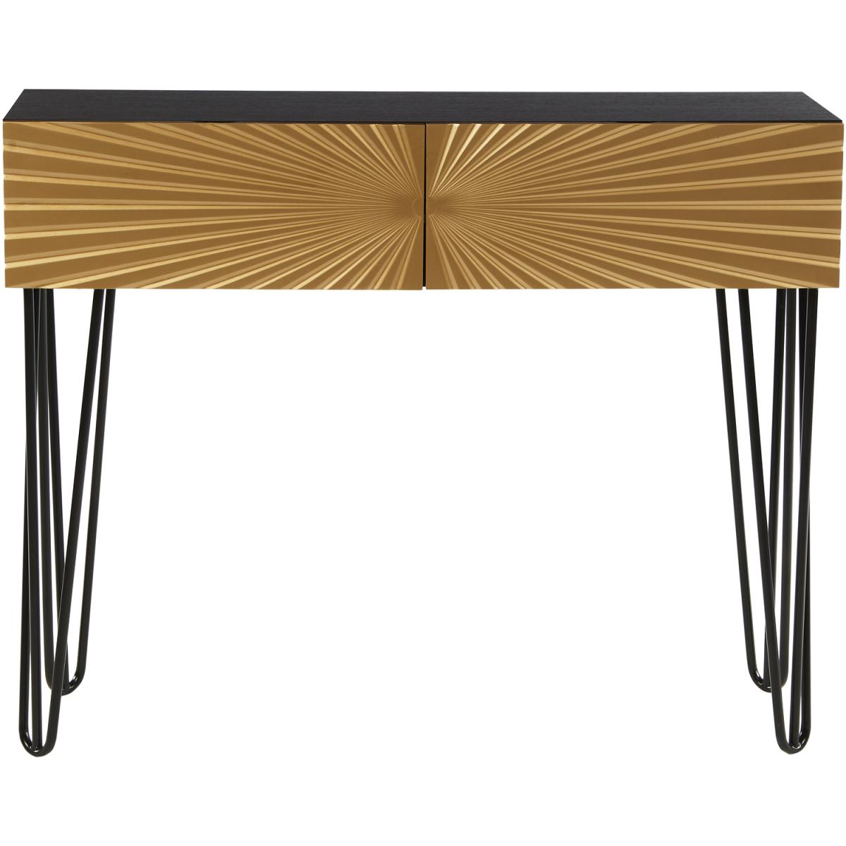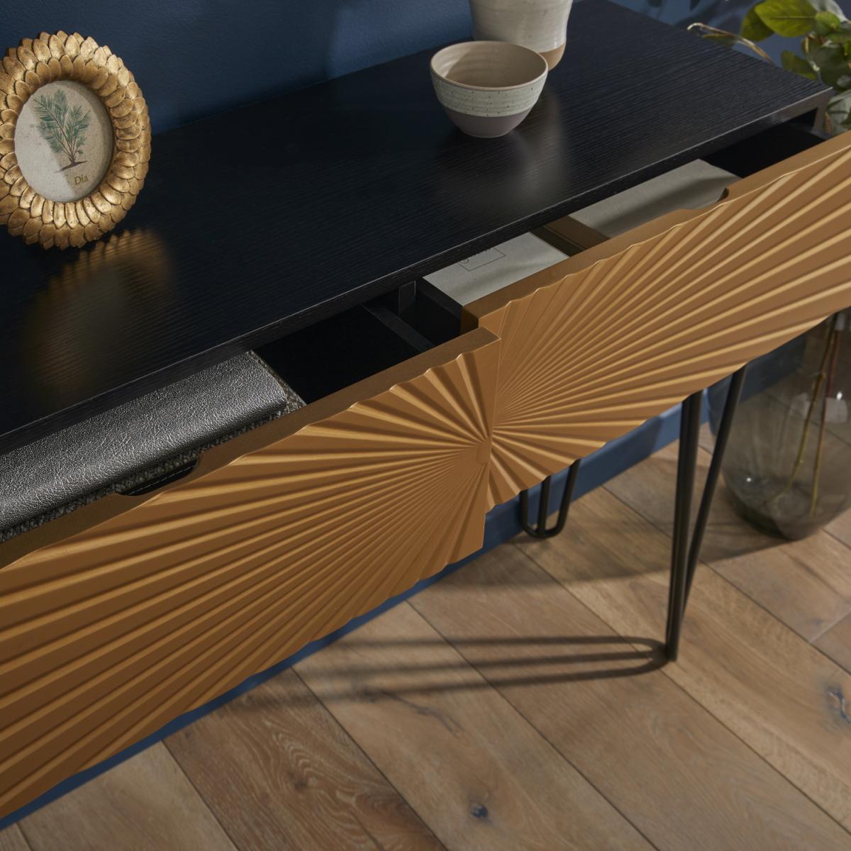 Inspired by on-trend vintage furniture, the black and gold Radiance collection features a radial sunbeam design with metal u-shaped legs. This console table has sturdy drawers to the front allowing you to store items inside and on top. Pair yours with the matching items in the range to create a stylish yet casual environment for any room.