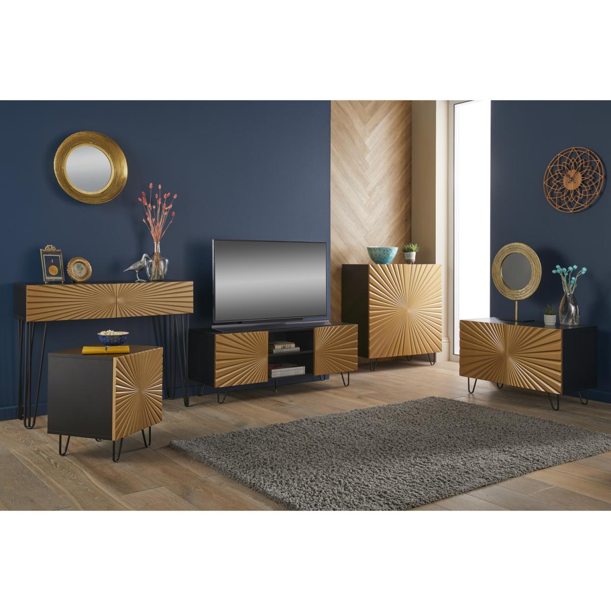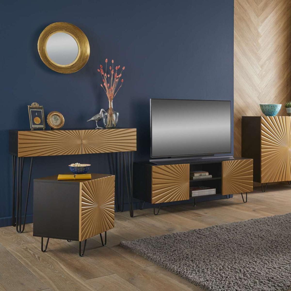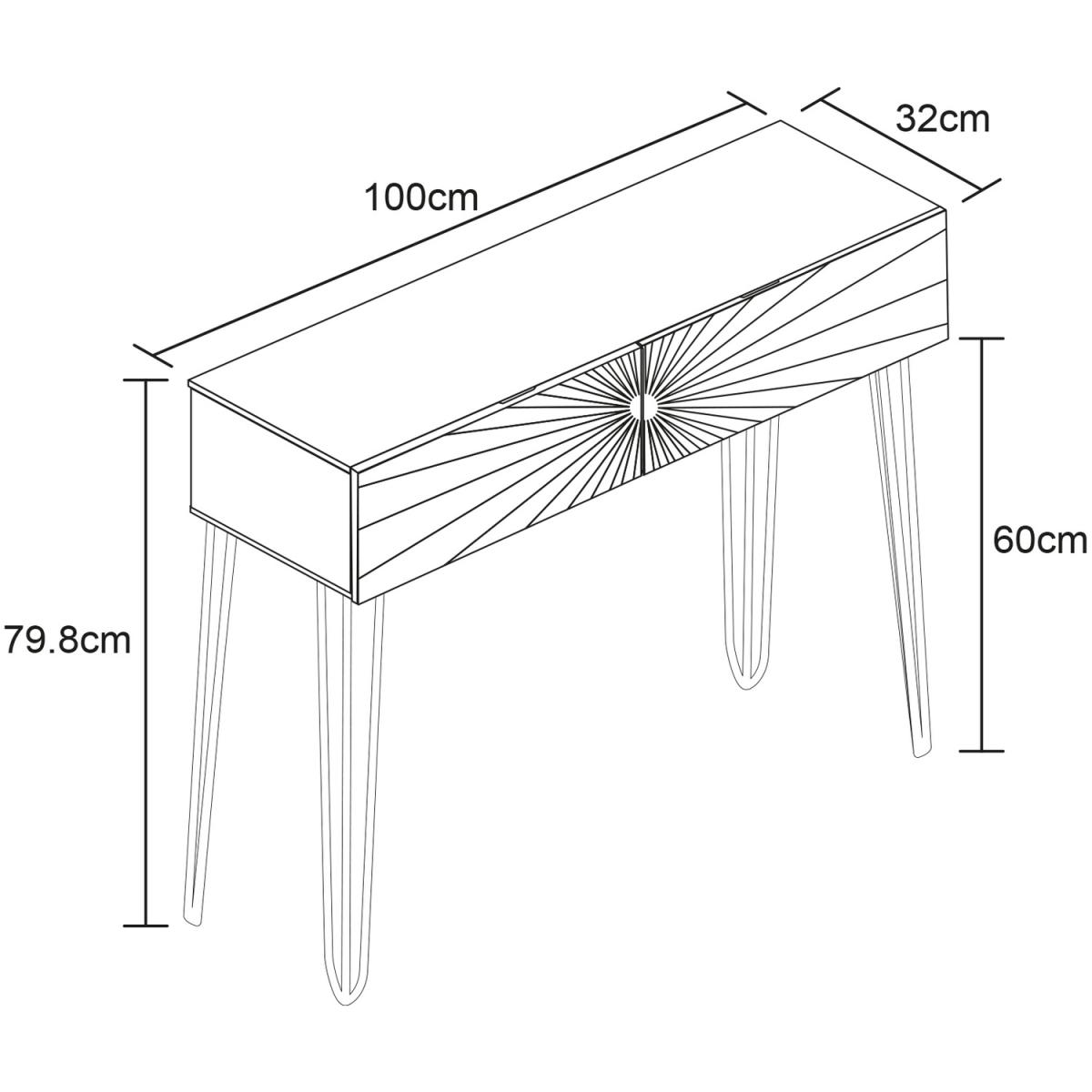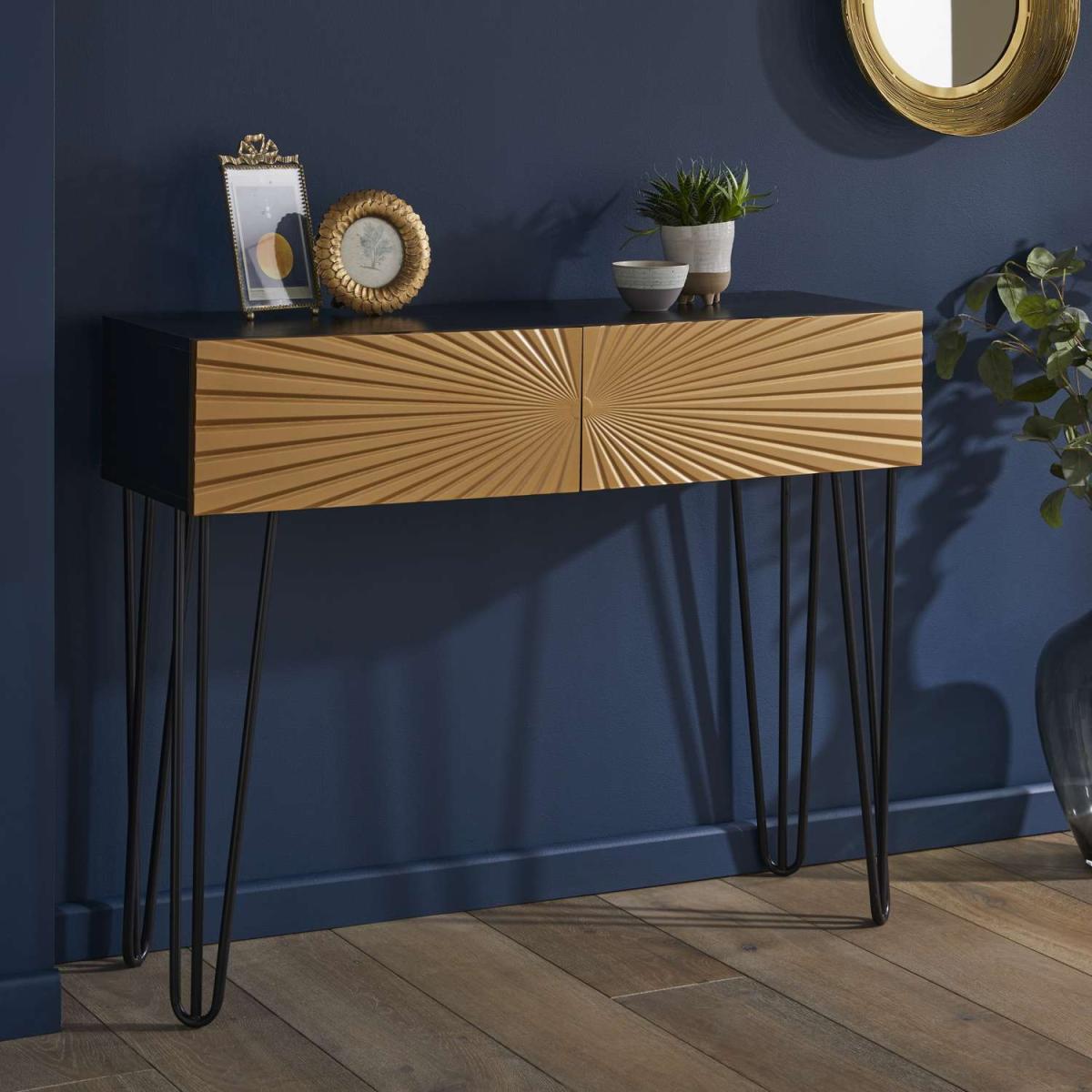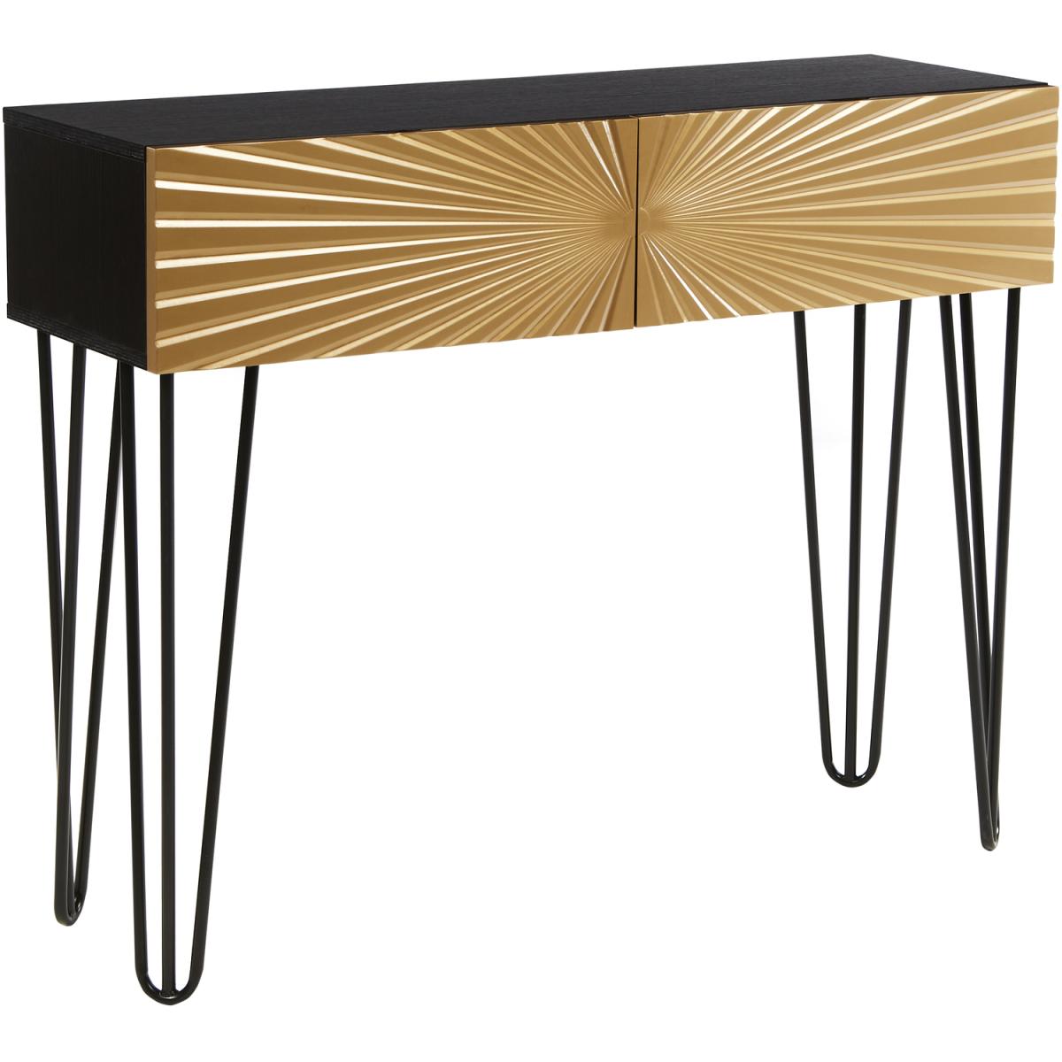 Inspired by on-trend vintage furniture, the black and gold Radiance collection features a radial sunbeam design with metal u-shaped legs. This console table has sturdy drawers to the front allowing you to store items inside and on top. Pair yours with the matching items in the range to create a stylish yet casual environment for any room.
