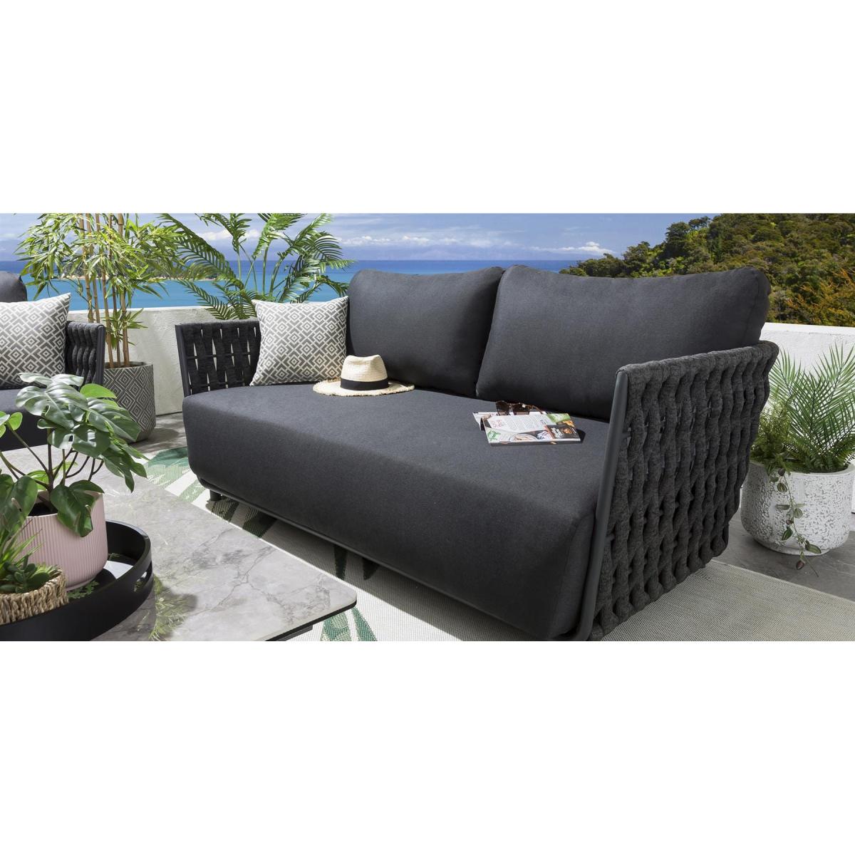 Elevate your outdoor lounging experience with the Sundowner garden sofa set. This modern outdoor sofa set includes a 3-seater sofa, two armchairs, and a round coffee table, all featuring a contemporary design with aluminium frames, premium cushions, and the signature Sundowner outdoor rope weave in charcoal grey. Crafted with durable aluminium frames, this garden sofa set exudes modern elegance. The sleek design of the 3-seater sofa, armchairs, and coffee table seamlessly complements any outdoor space. Whether you're hosting guests or enjoying a quiet moment, this aluminium garden furniture adds a touch of sophistication to your patio or garden. The signature Sundowner rope weave adorns our garden sofa set, adding texture and style. Paired with super soft, luxurious cushions, this set offers both comfort and aesthetic appeal. Whether lounging or entertaining, the rope weave and cushions create an inviting atmosphere for relaxation and enjoyment. Say goodbye to complicated assembly with this garden sofa set. Designed for convenience, this outdoor sofa set requires no assembly, allowing you to start enjoying it right away. Plus, with weather covers included, you can protect your furniture from the elements, ensuring it stays looking beautiful for years to come. Sofa Size W189cm D92cm H66cm Armchair Size W84cm D92cm H68cm Coffee Table Size W120cm D120cm H43cm