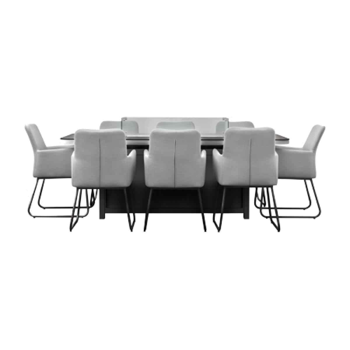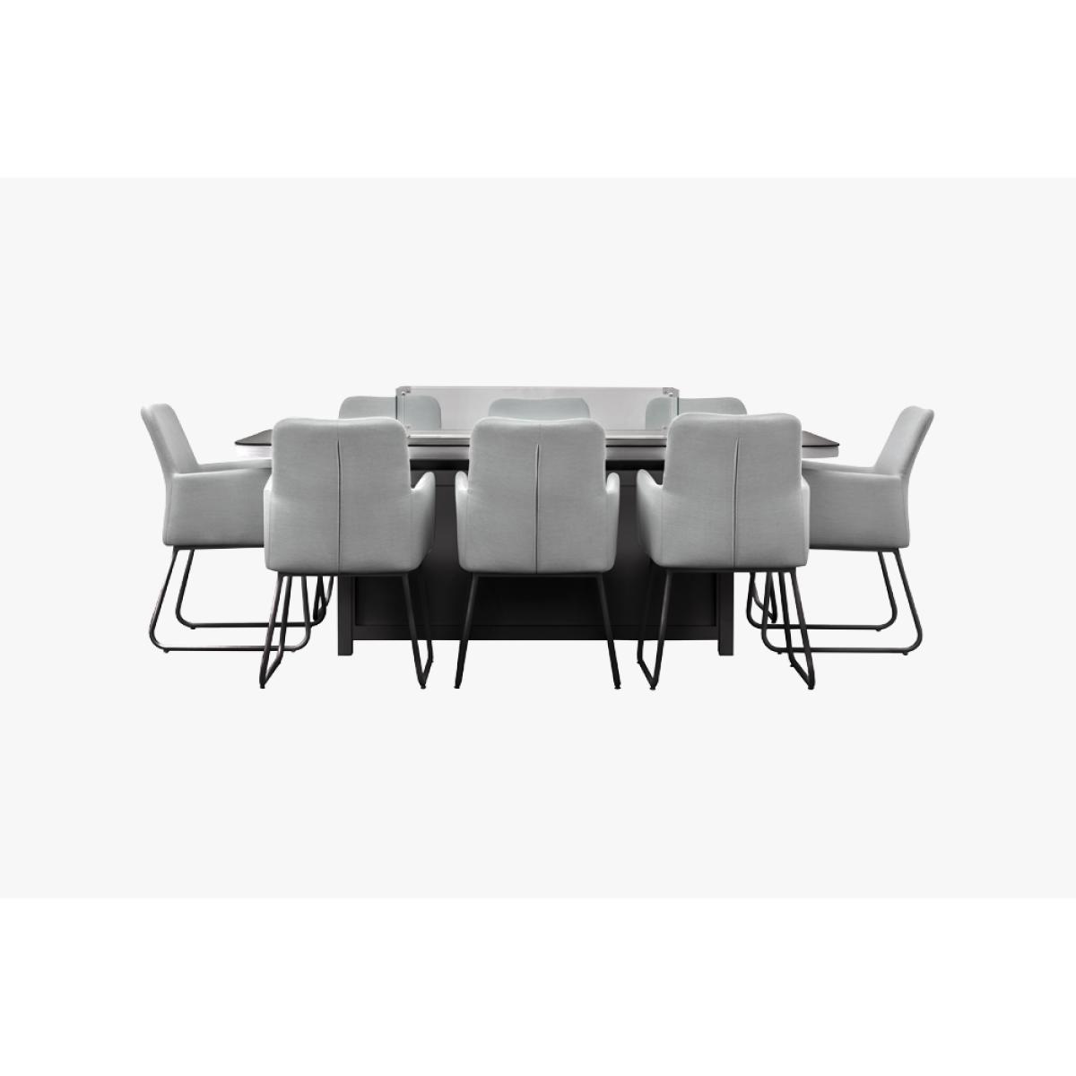 Make the most of your summer dining with an amazing fire pit built into the glass-topped dining table. With 8 seats upholstered in all-weather fabric and comfy quick dry foam padding plus free covers to help keep your set neat, you can relax with no worries.