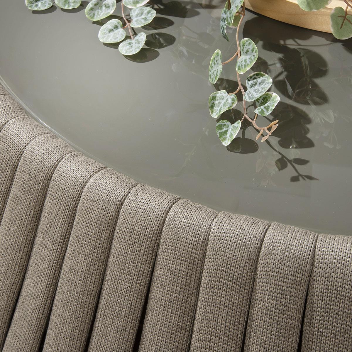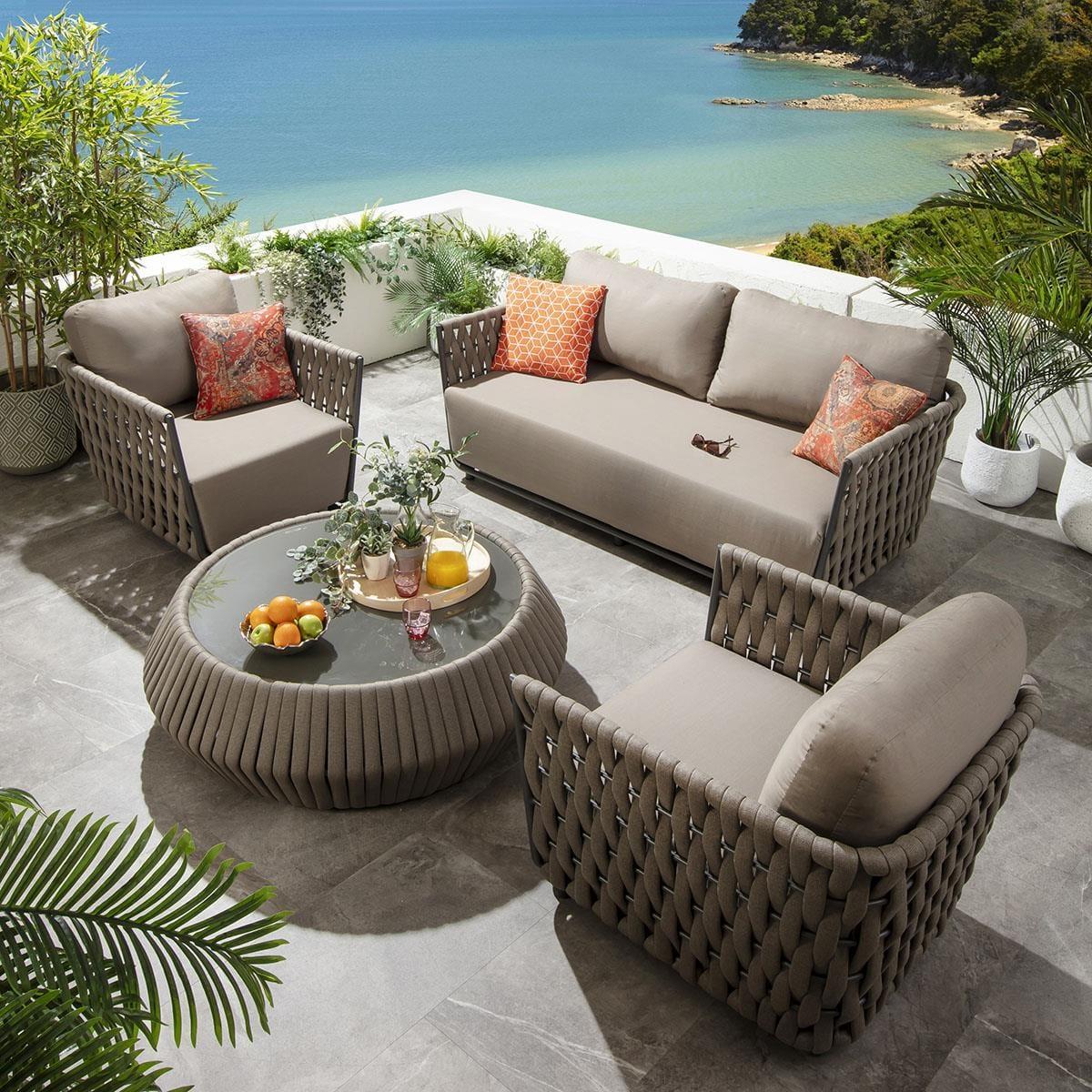Elevate your garden lounging with our 120cm wide round outdoor coffee table. Crafted with a weather-resistant aluminium frame, it features a sleek glass top and is adorned with our signature Sundowner rope weave in coffee beige. Pair it effortlessly with matching furniture from the Sundowner collection. Our outdoor coffee table boasts a modern design, combining a sturdy weather-resistant aluminium frame with a stylish glass top. Built to withstand the elements, it provides the perfect surface for drinks, snacks, and decor in your garden or patio setting. Adding a touch of elegance, our coffee table is adorned with the distinctive Sundowner rope weave. This intricate detail not only enhances its aesthetic appeal but also adds texture and visual interest to your outdoor space. Complete your outdoor oasis by coordinating this coffee table with matching furniture pieces from the Sundowner collection. Whether it's loungers, chairs, or sofas, create a cohesive and inviting atmosphere for gatherings, relaxation, and enjoying the great outdoors. W120cm D120cm H43cm Aluminium frame Pair with matching Sundowner garden furniture