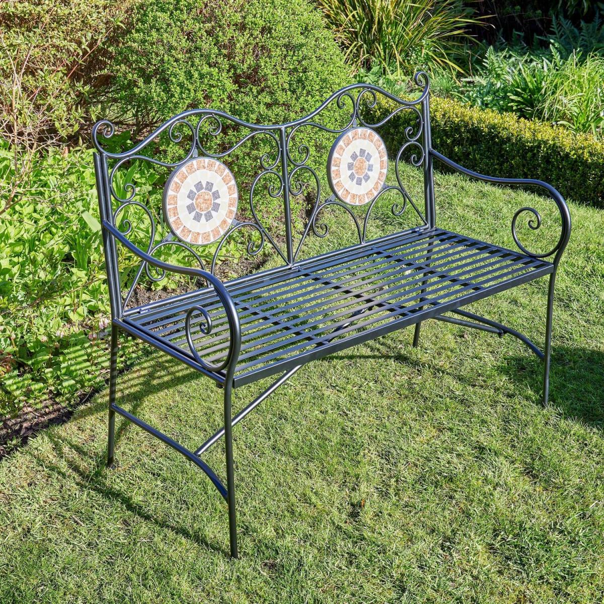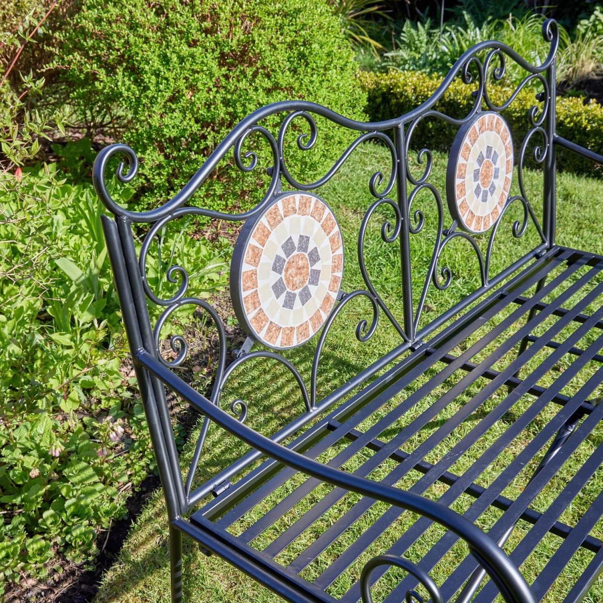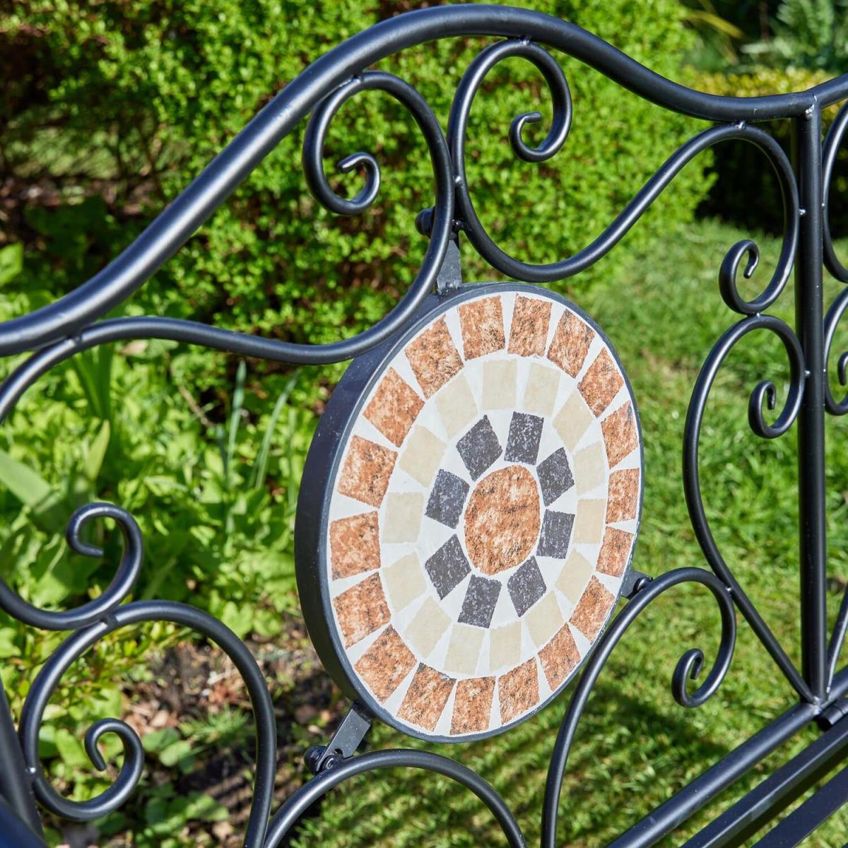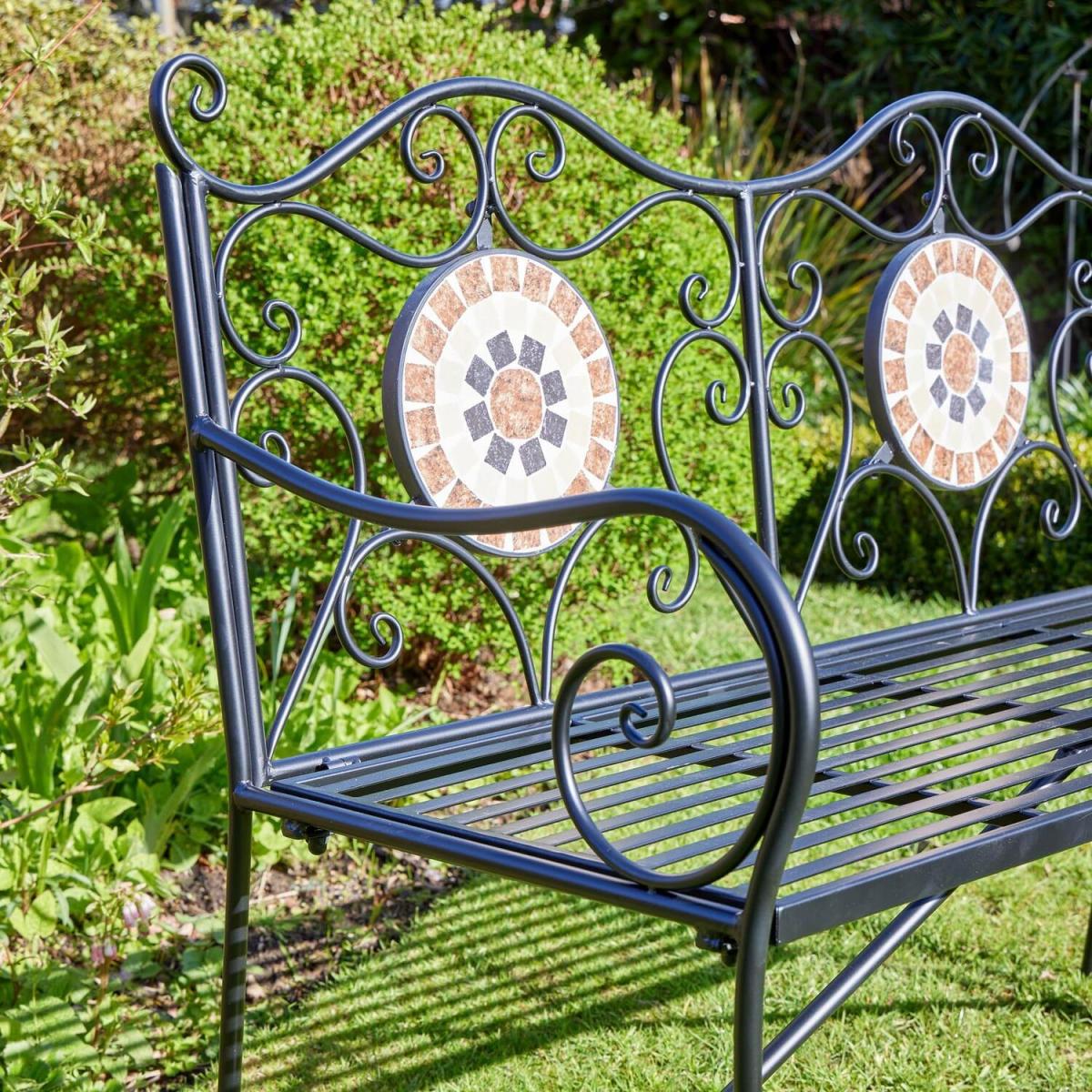 This delightful sunflower bench is made in black metal with scroll design arms and back. The mosaic tile insets in the back give a Mediterranean feel and create a holiday vibe in your home or garden. The ideal place to sit and have a quiet moment and relax after a long day.