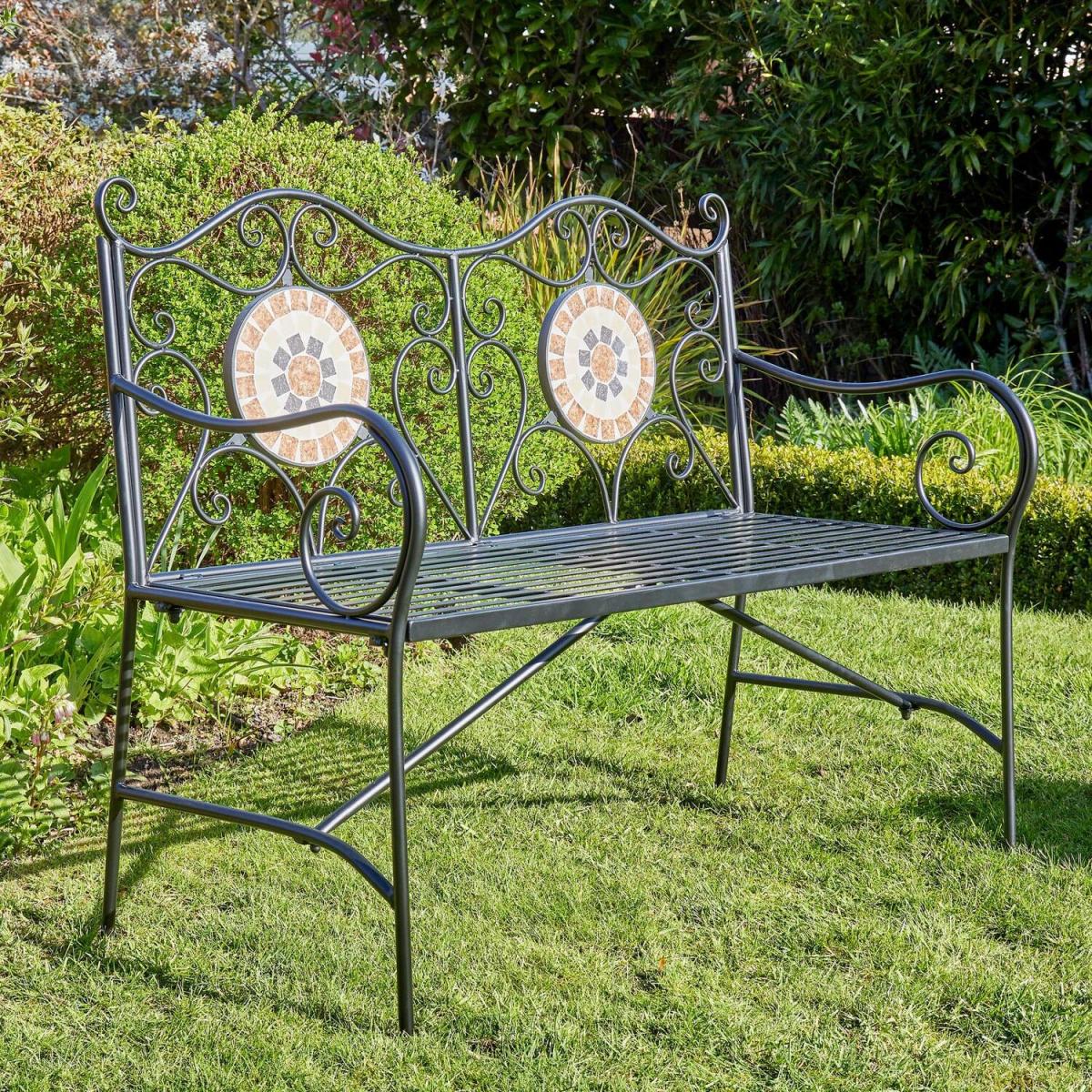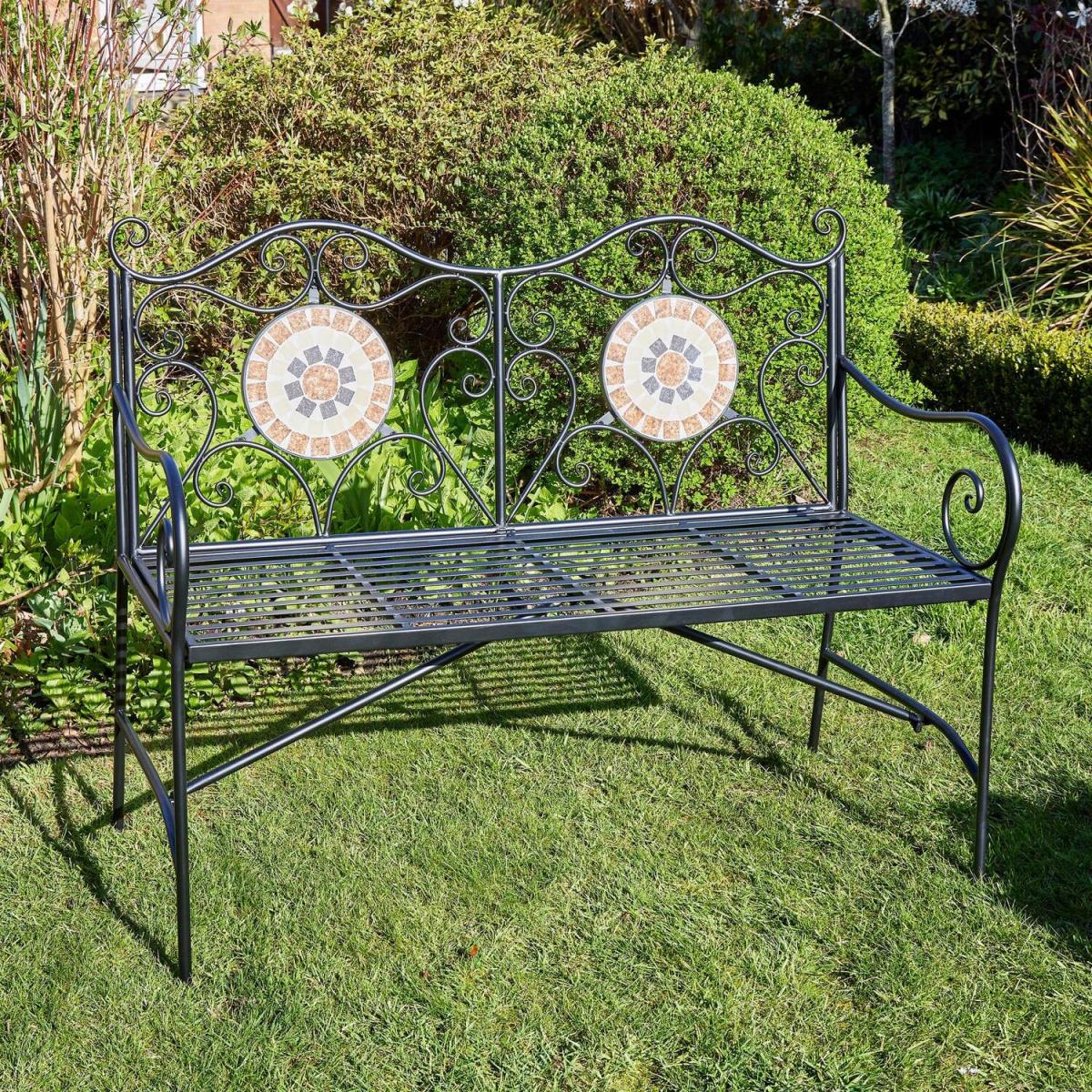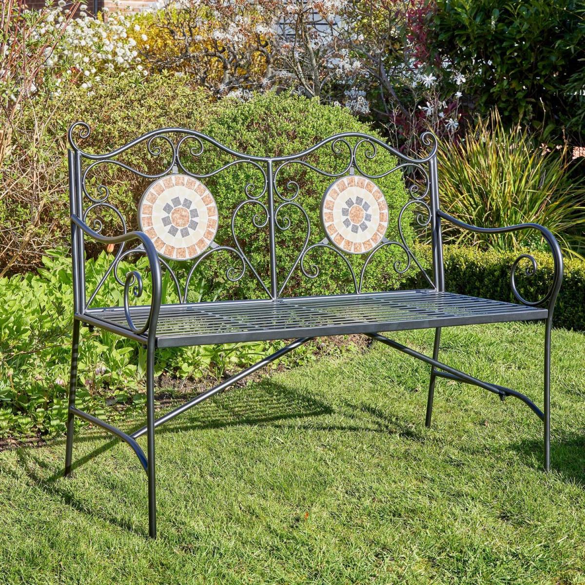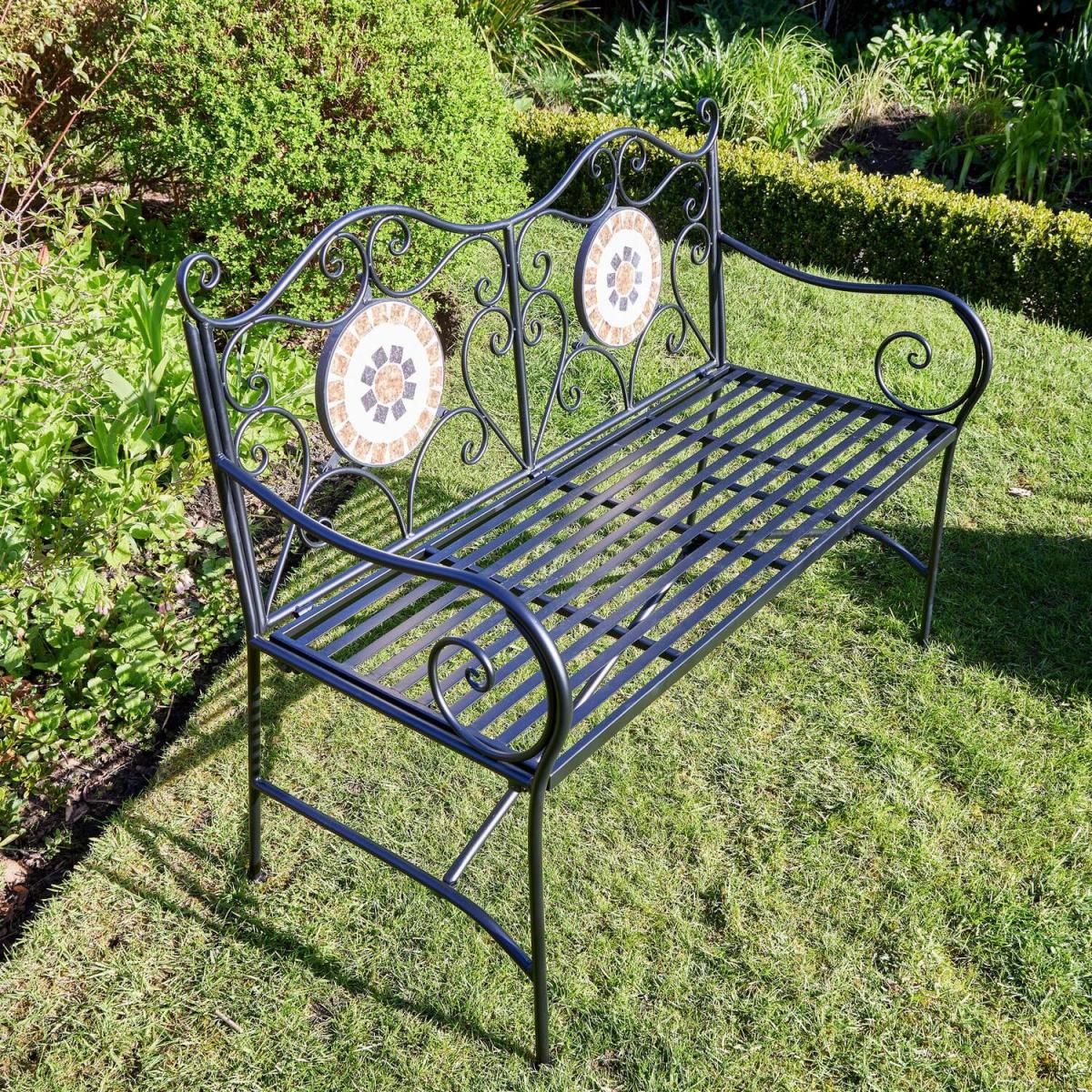 This delightful sunflower bench is made in black metal with scroll design arms and back. The mosaic tile insets in the back give a Mediterranean feel and create a holiday vibe in your home or garden. The ideal place to sit and have a quiet moment and relax after a long day.