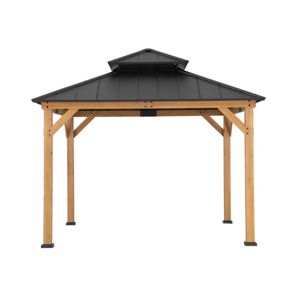 Expand your living space by bringing the indoors outside and create a sheltered outdoor gathering place and invite family and friends to linger with you in your garden. This 330x330x304 cm hardtop gazebo from the world's leading ready to assemble outdoor structure maker, Sunjoy, creates the perfect outdoor setting for a gathering any time of the year. Spend all four seasons enjoying your covered area outdoors under a cedar wood frame gazebo with a sturdy powder coated steel roof top that will stand the test of time. The 2 tier roof provides just the right amount of airflow while simultaneously keeping occasional inclement weather at bay. Set the mood by suspending a chandelier from the incorporated ceiling hook for functional light and a touch of elegant design. With straight-forward, easy-to-follow assembly instructions you'll soon be relaxing in your favorite new outdoor living space, and for years to come.
