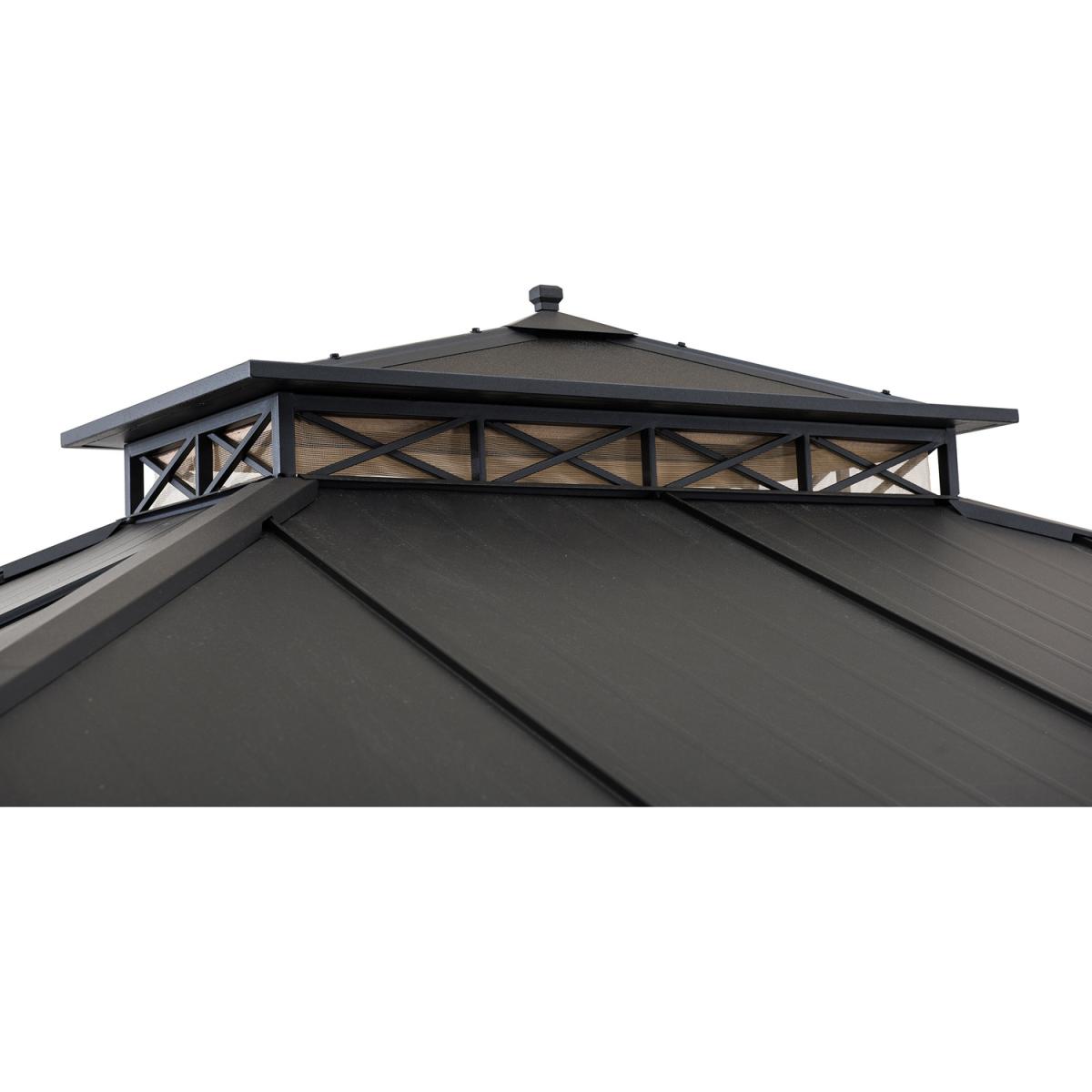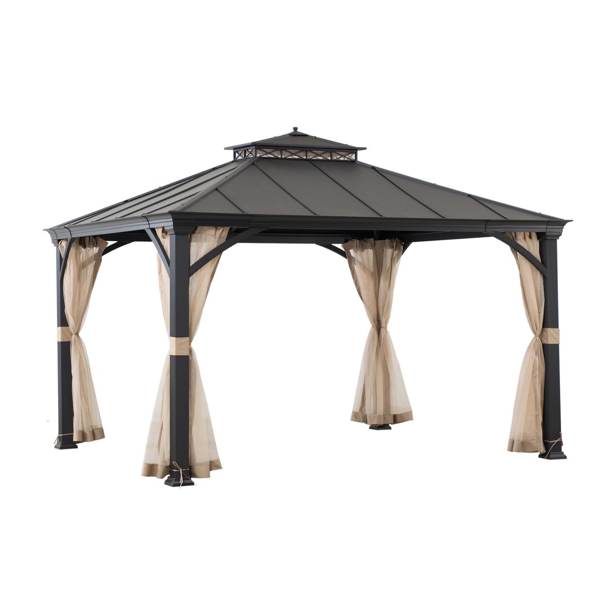 Create a sheltered outdoor gathering place and invite family and friends to linger with you in your garden. The 385x324cm gazebo from Sunjoy helps you to protect your retreat. Enjoy cool moments under the two-tier, ventilated hood supported by a rust-resistant steel frame. Give your gazebo the final design touch by attaching a chandelier to the built-in ceiling hook. Use the net to keep mosquitoes and bugs away. With easy-to-follow assembly instructions, you'll be relaxing in your new favorite outdoor living space in no time.