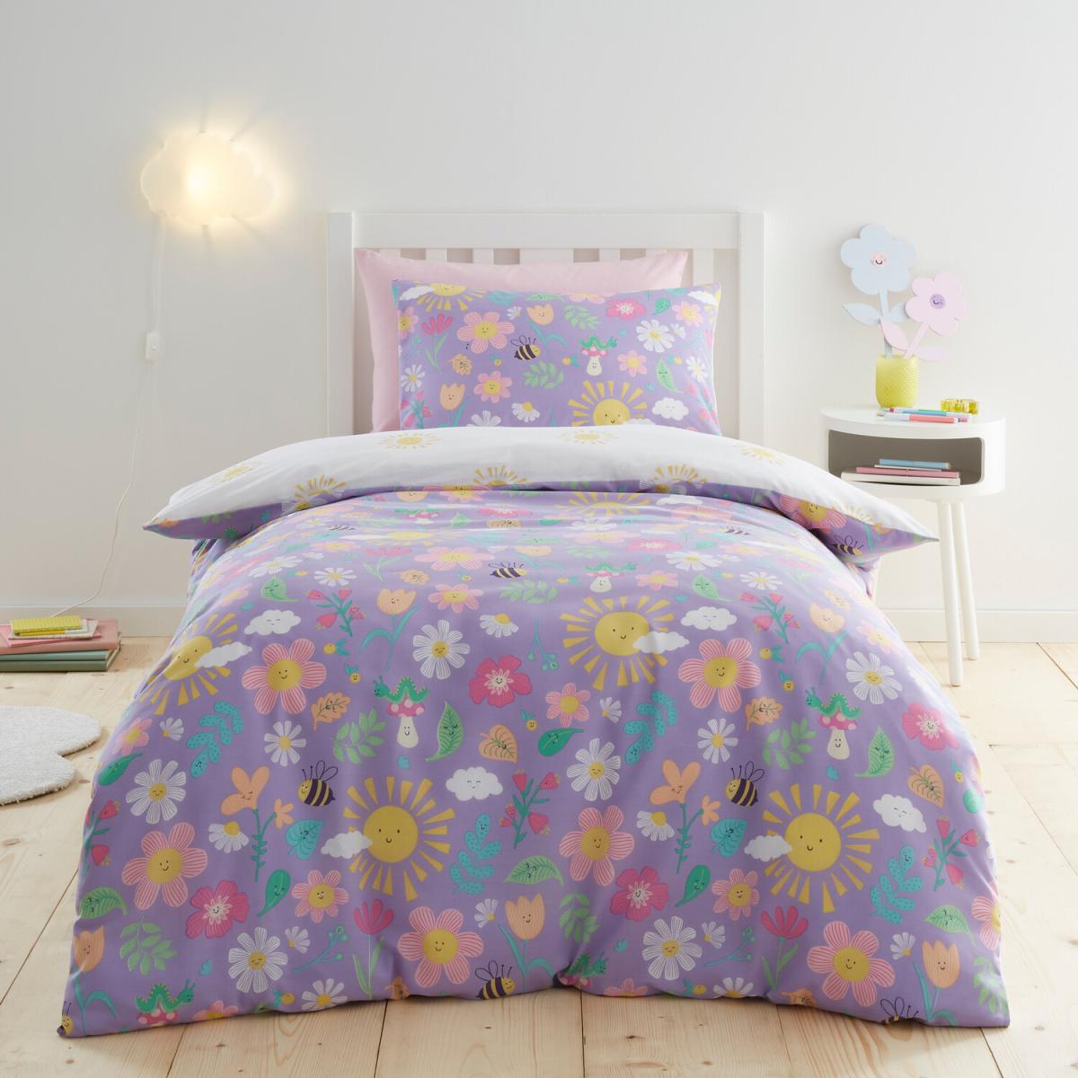 The Sunny Days duvet looks great for adding a cheerful splash of colour to a child's bedroom or a playful guest room. Its purple base with bright floral and bee motifs makes it versatile for both fun and more youthful interiors, especially when paired with complementary colourful cushions or throws. To style it effectively, consider layering with plain bed linens in soft pastel shades or neutral tones to let the duvet’s lively pattern shine. It works well in contemporary spaces that embrace bold prints or in eclectic bedrooms that mix patterns for a quirky look. Practical tip: keep accessories minimal but colourful, and choose simple, modern bedside furniture to balance the vibrant duvet.
