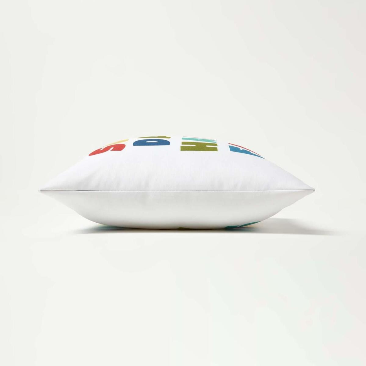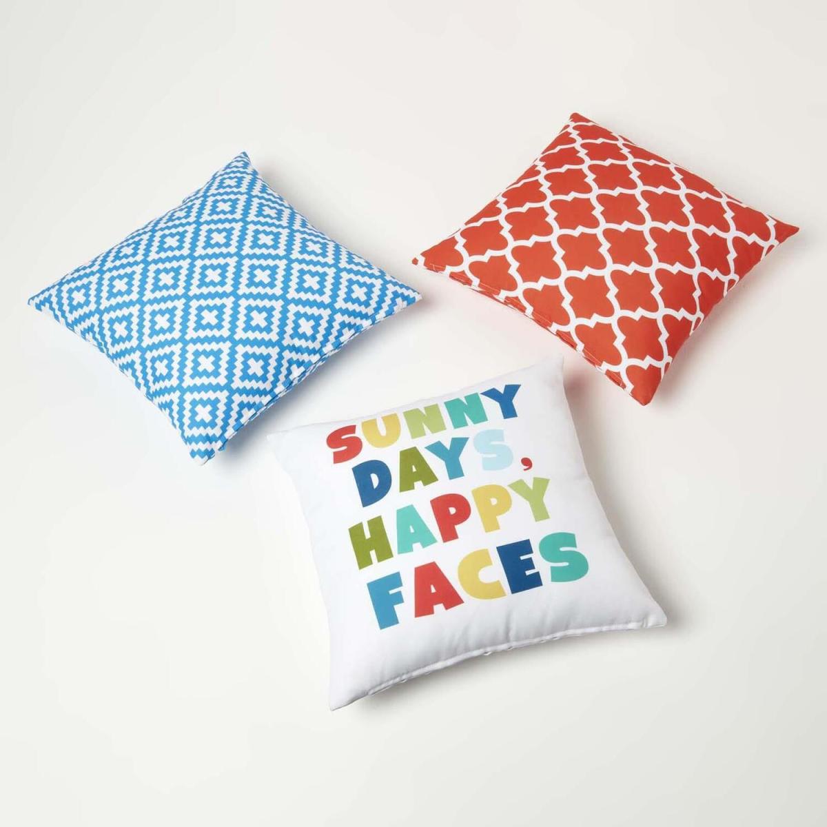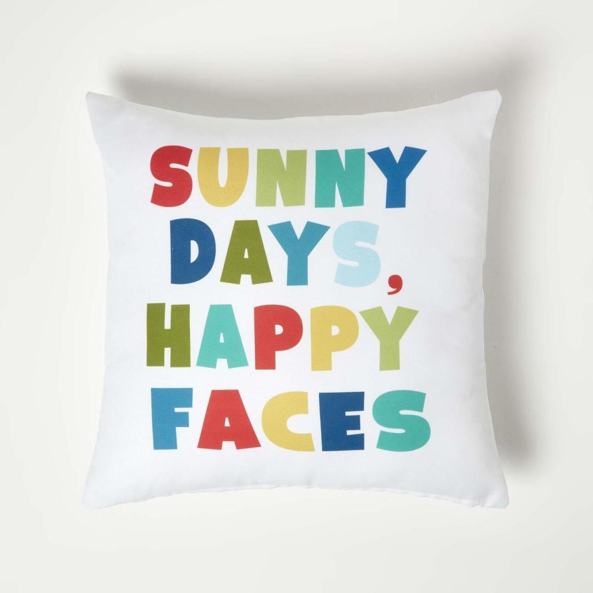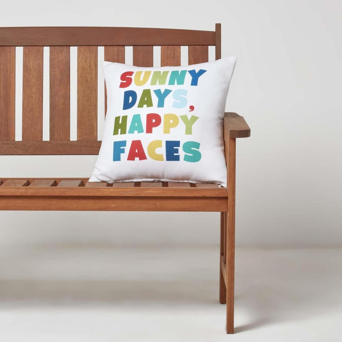 A fun and colourful outdoor cushion measuring 45 x 45 cm. This quirky garden cushion features the slogan Sunny Days, Happy Faces and is finished in multi colours. Adding a splash of colour to your outside space this modern style cushion will complement all garden styles and is sure to be a favourite among friends and family. Woven from a thick and durable water-resistant polyester, these durable cushions are perfect for styling outdoors. And provide extra comfort and support to your garden chairs, garden sofas and benches. A versatile cushion they can be used around your outside spaces as well as in conservatories, summer houses or even around the home. Prefilled with a bounce-back, super microfibre hypoallergenic cushion insert these cushions will remain plump and comfortable even with regular use. We recommend that you always store your cushions indoors when not in use and keep them out of direct sunlight and heavy rain. Spot clean with mild soapy water and leave to dry naturally. Part of Homescapes exclusive garden and outdoor accessories, the collection includes garden seat pads and bench cushions, garden accessories and a colourful range of outdoor rugs available in a range of colours and sizes.