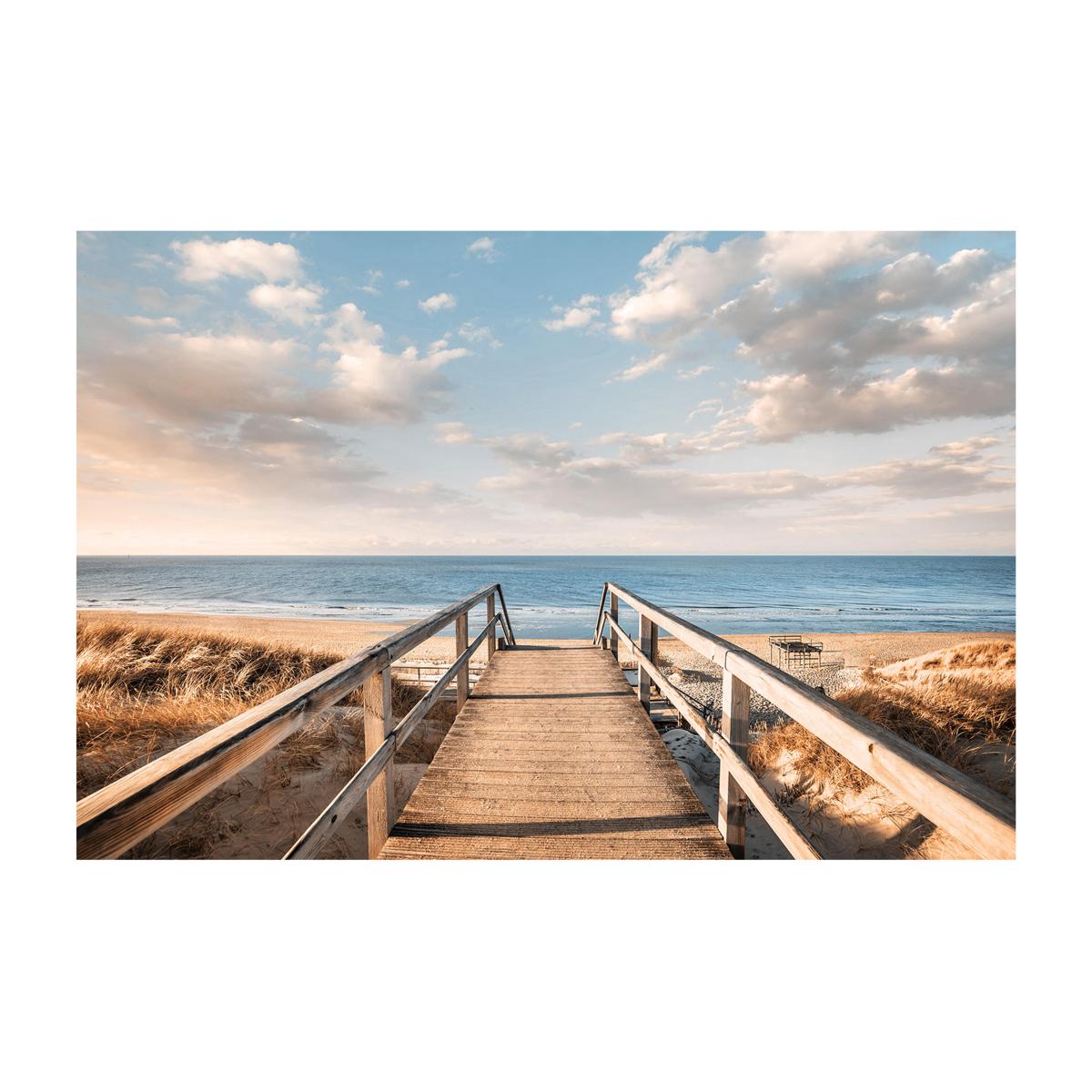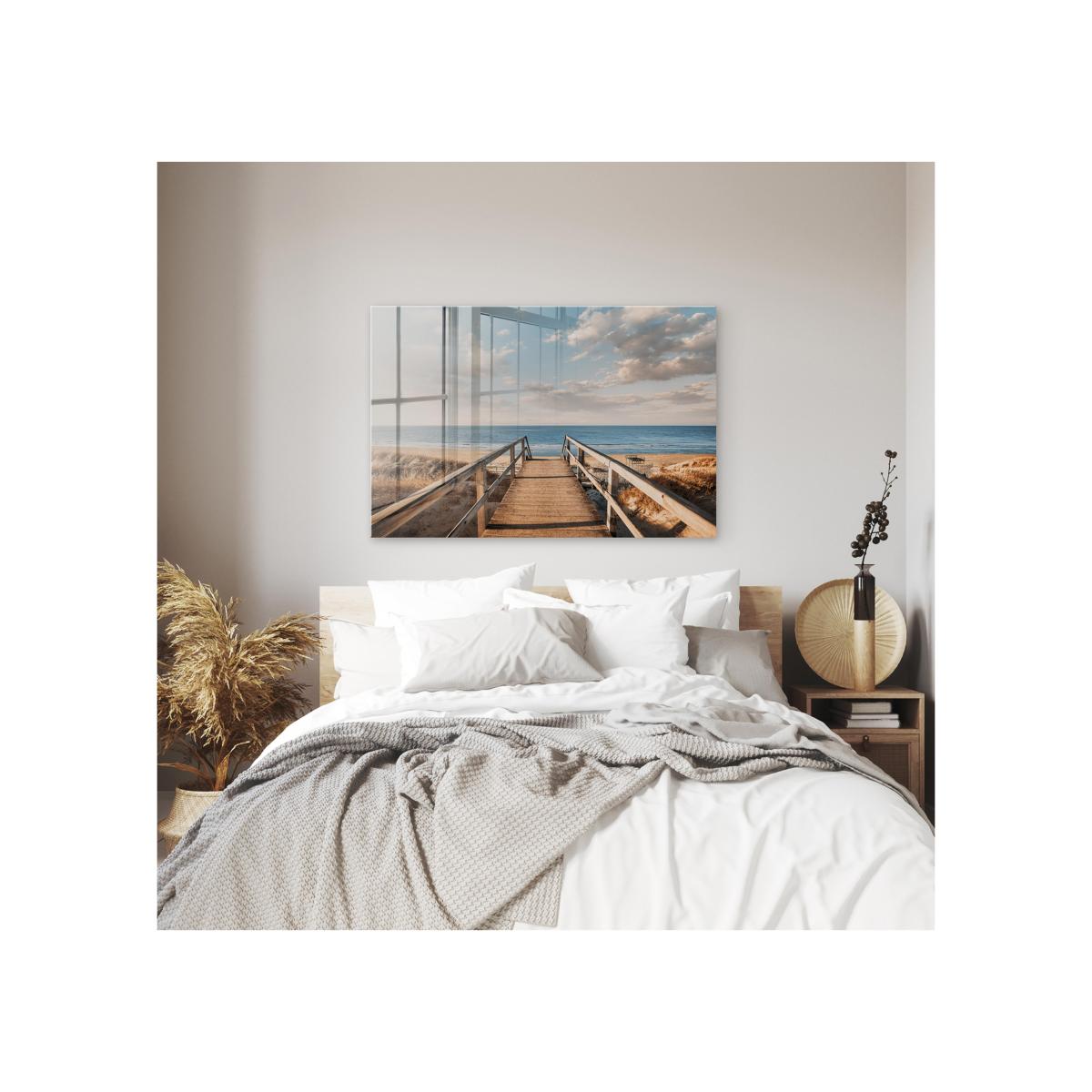 Enjoy a beach view every day with this beautiful glass wall art. Gaze out to sea as the wooden walkway invites you down to the sun-soaked sands. Why you'll love it. Feel the sun’s warmth year-round with this bright wall art. The printing technology used ensures an extraordinary depth of colour. A stunning photograph reproduced on 6 mm toughened glass. Smart hanging mounts allow this wall art to be hung completely flat. This piece of glass art is part of the Furniture Village wall art collection. What you need to know. Hanging fittings are included. Dust with a soft, clean, lint-free cloth. Dimensions. Width: 120 cm (48 inches). Height: 80 cm (32 inches).