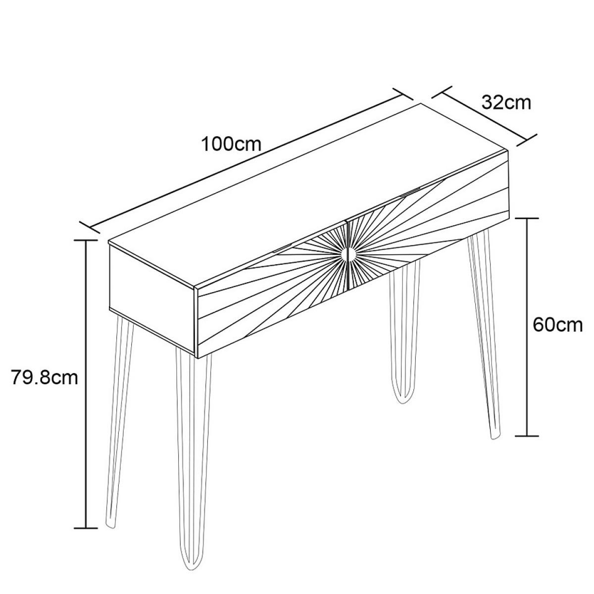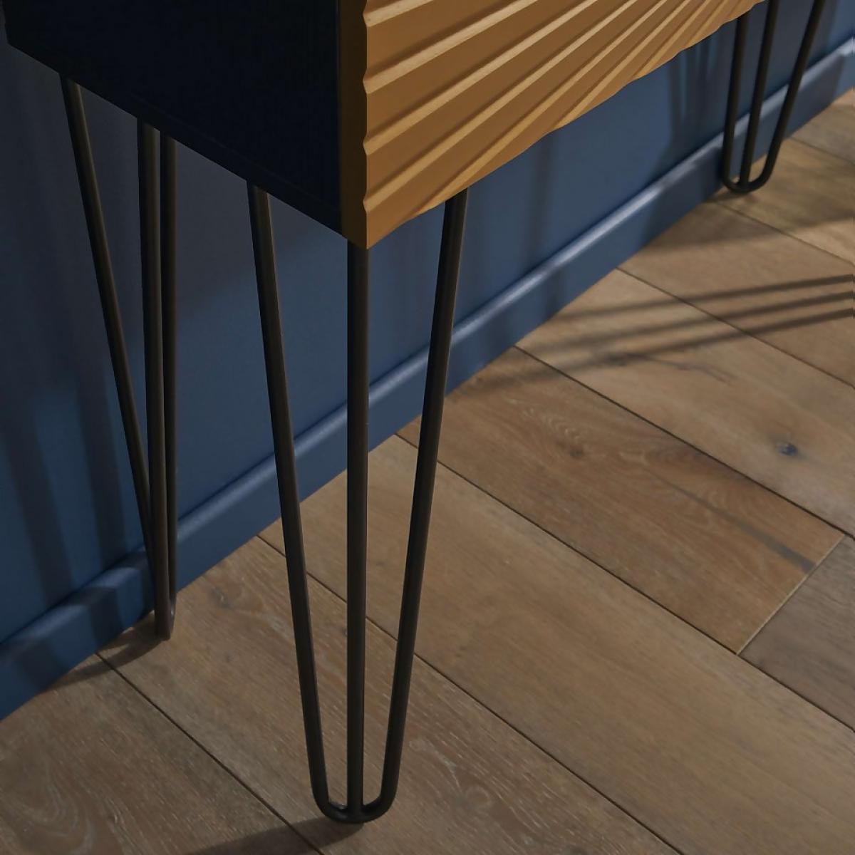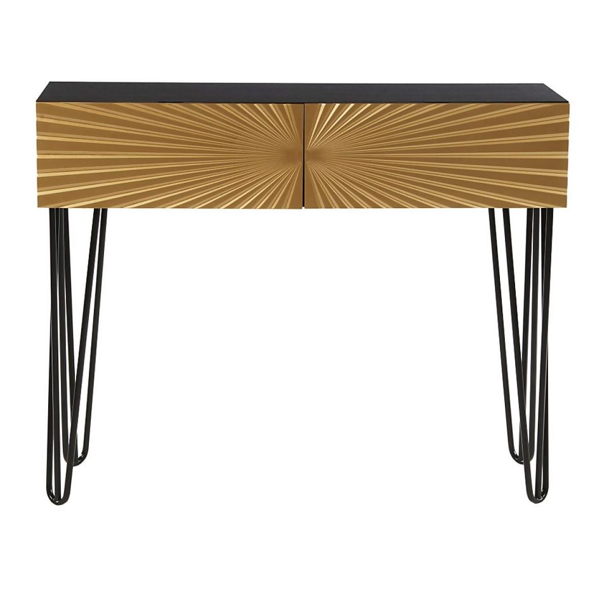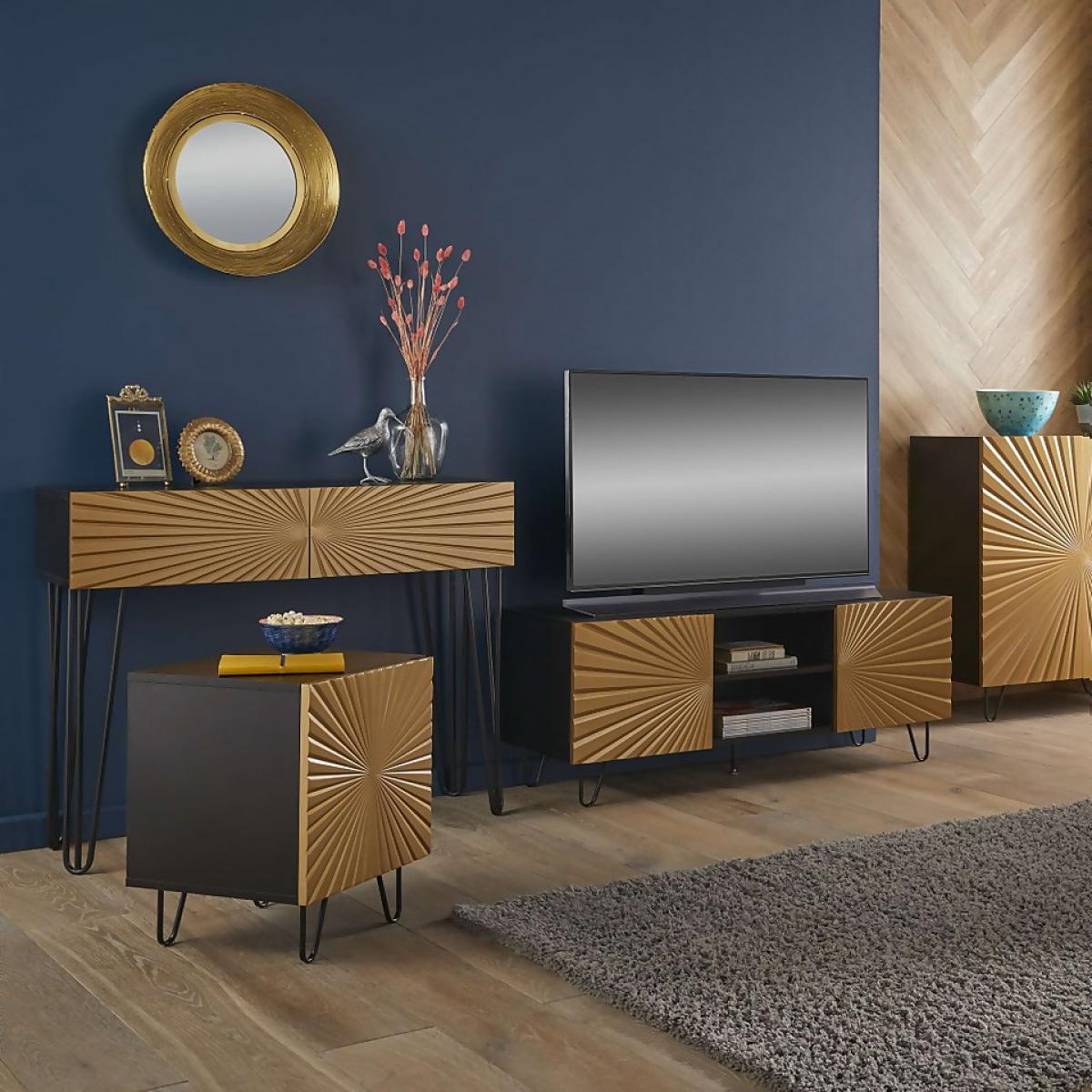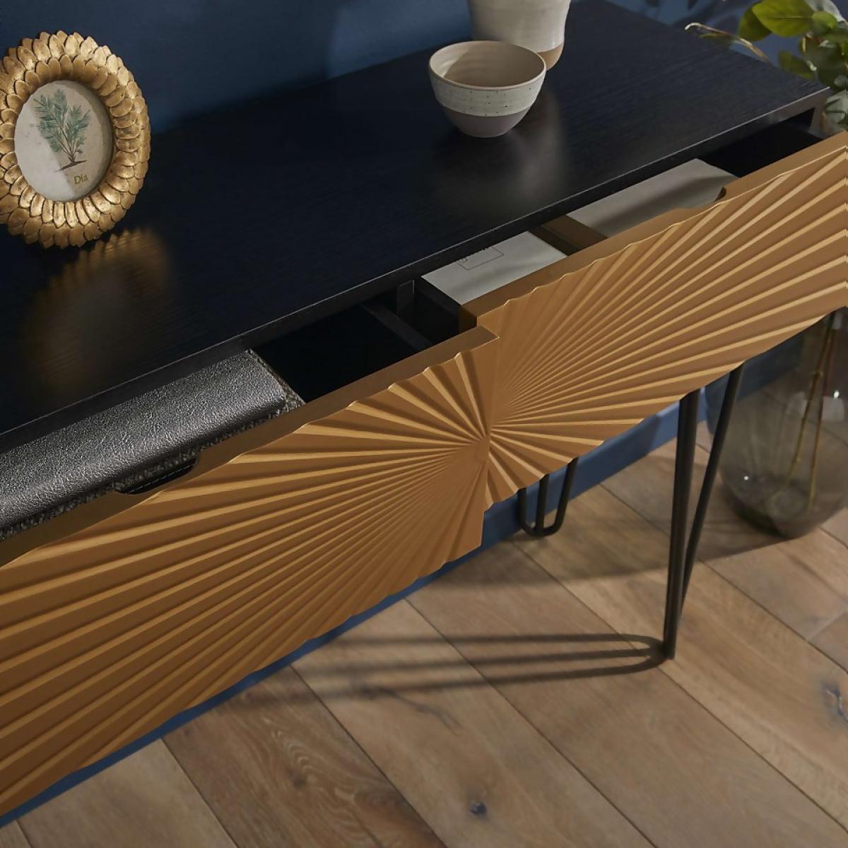 Inspired by on-trend vintage furniture, the black and gold Sunrise collection features a radial sunbeam design to the front with metal u-shaped legs.
