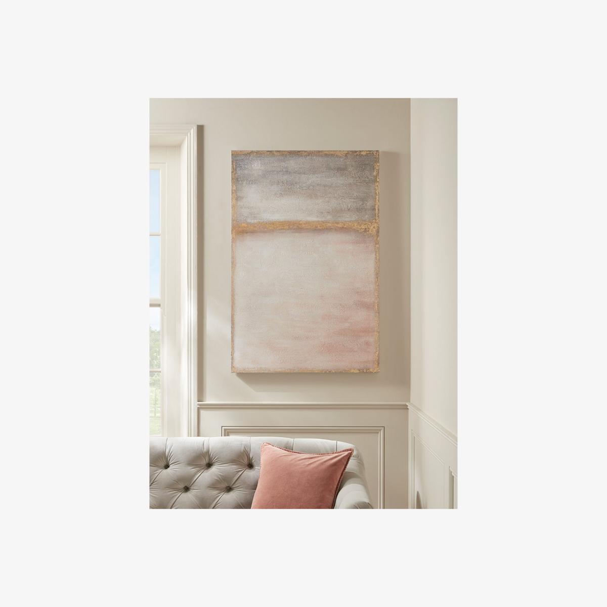 Awash with subtle blush and faded charcoal tones, framed by metallic golden highlights, this abstract sunrise will bring an uplifting but considered tinge of colour to your walls. Each of these hand-finished canvases is unique.