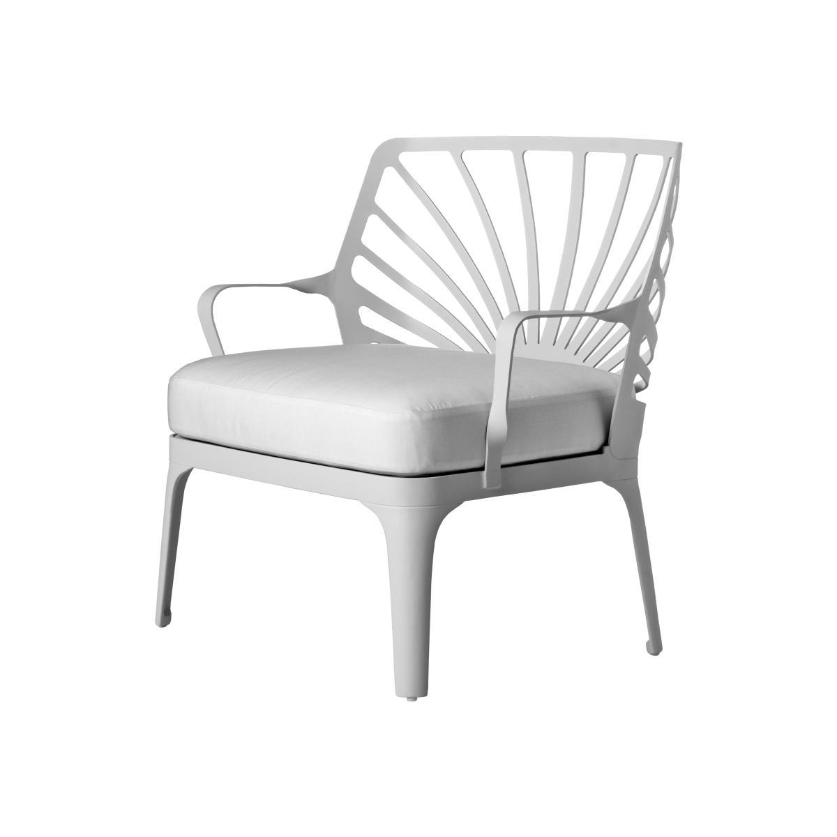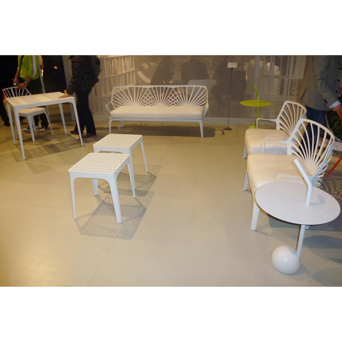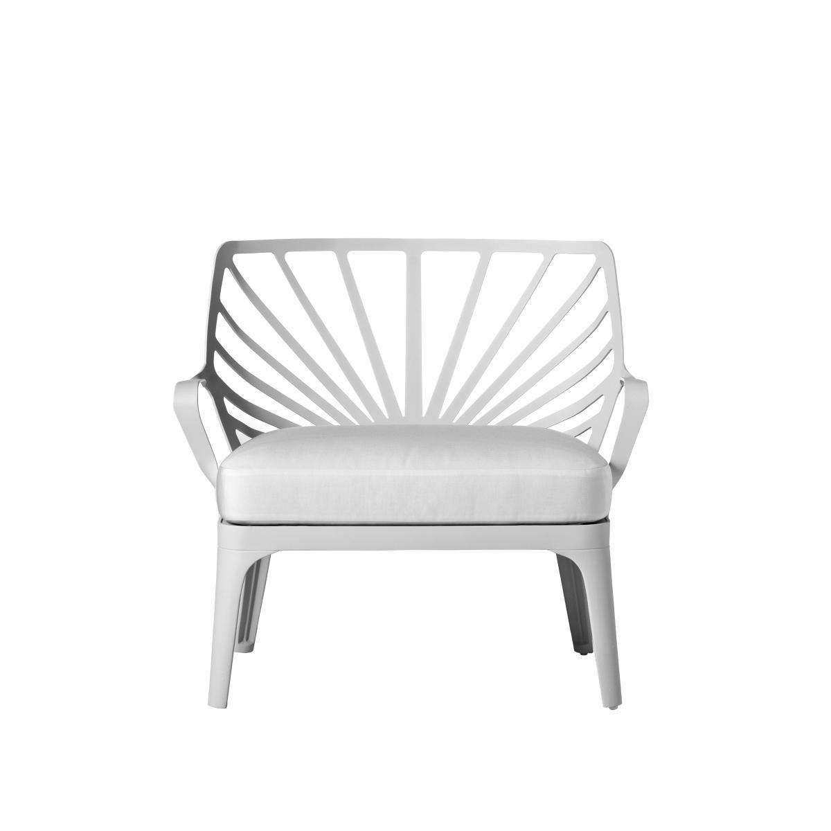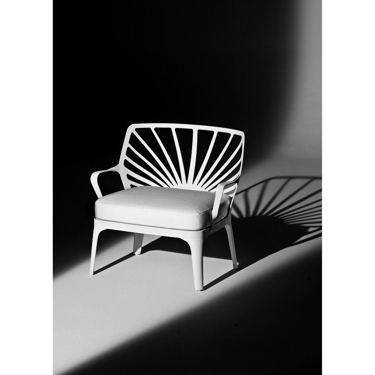 The sunrise outdoor collection by driade is showing references to classical outdoor cast iron furniture and modern use of an abstract symbol of a rising sun for the backrests. The sun is transformed in an ornamental pattern for the grid of the table top. The mix of classical and modern design features gives the collection a timeless look. The aluminium structure has been anodized and coated with white lacquer, which gives maximum outdoor durability. The collection consists of a chair, esay chair, stool, armchair, sofa and tables. White painted aluminum structure, seat and back. Chair, esay chair, armchair and sofa are equipped with a removable quick dry foamed white cushion.