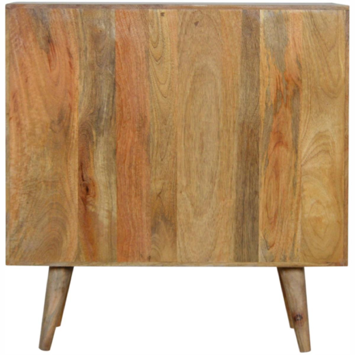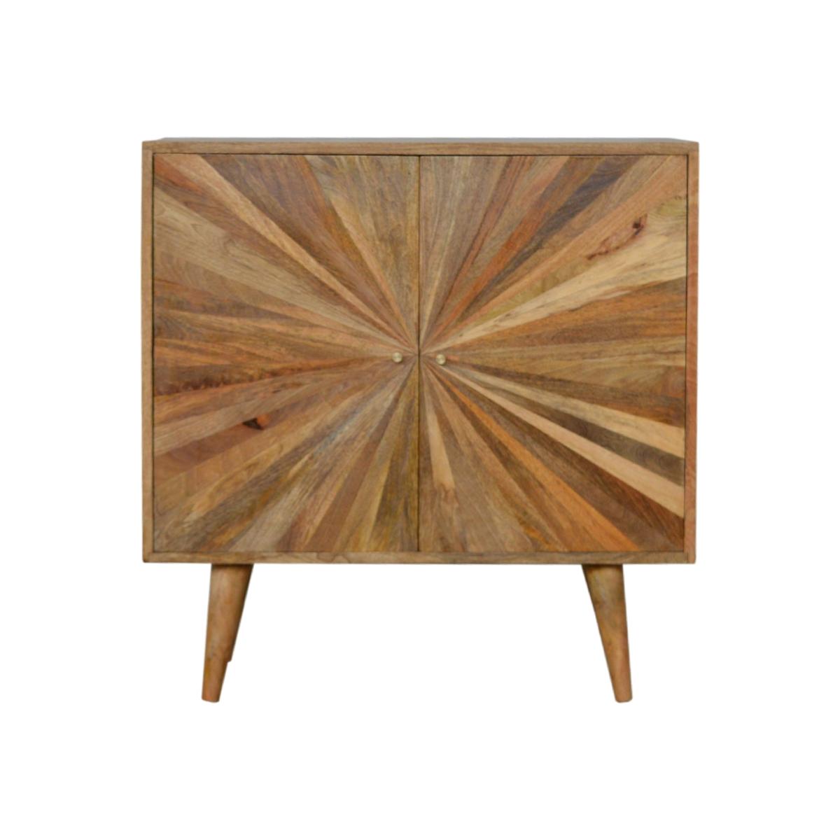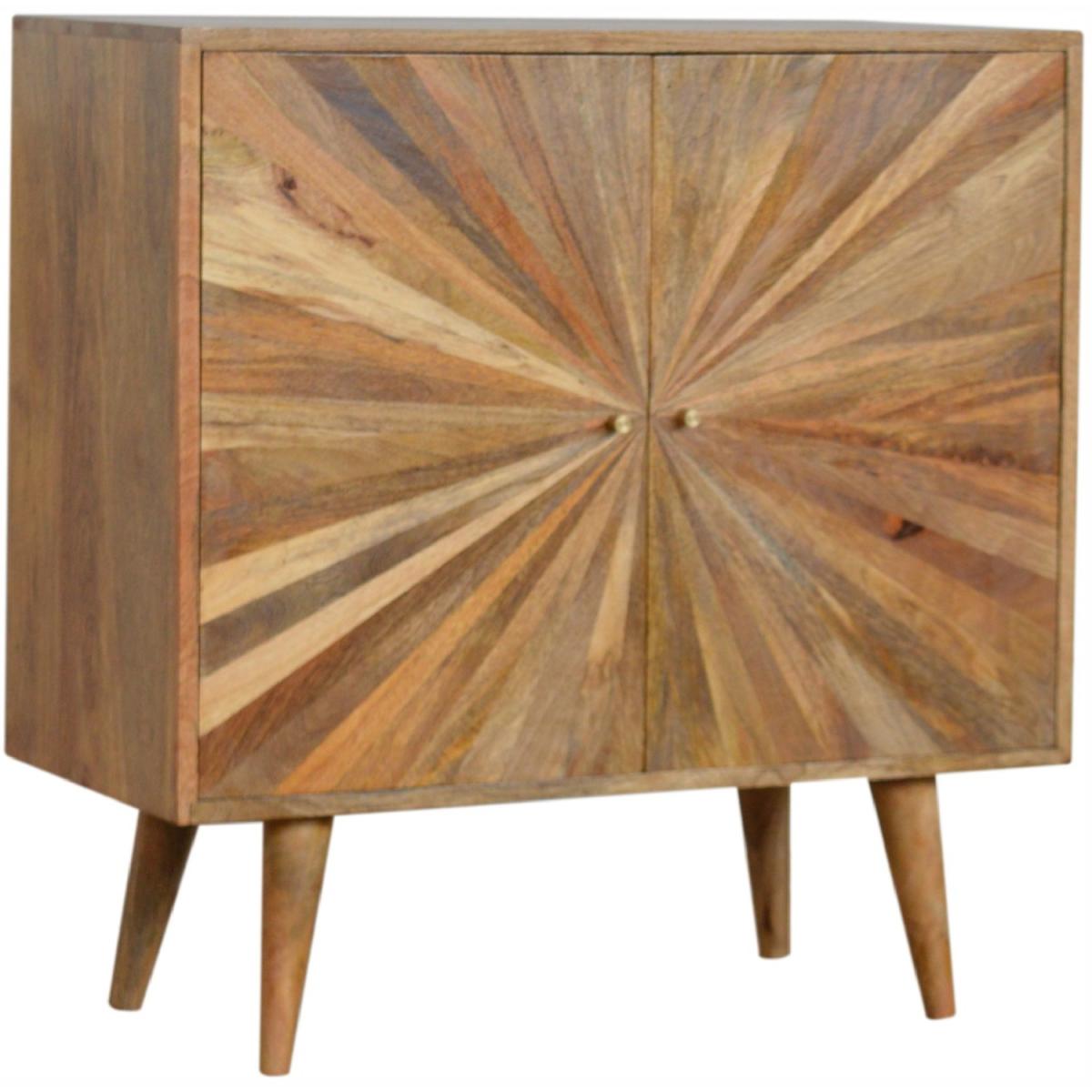 This cabinet has been designed to provide convenient storage space for your home. It has been constructed from 100% solid mango wood in an oakish finish with a sunrise pattern followed by shiny candle knobs. Offering a modern retro aesthetic, this cabinet is both a handy and timeless option for your home.