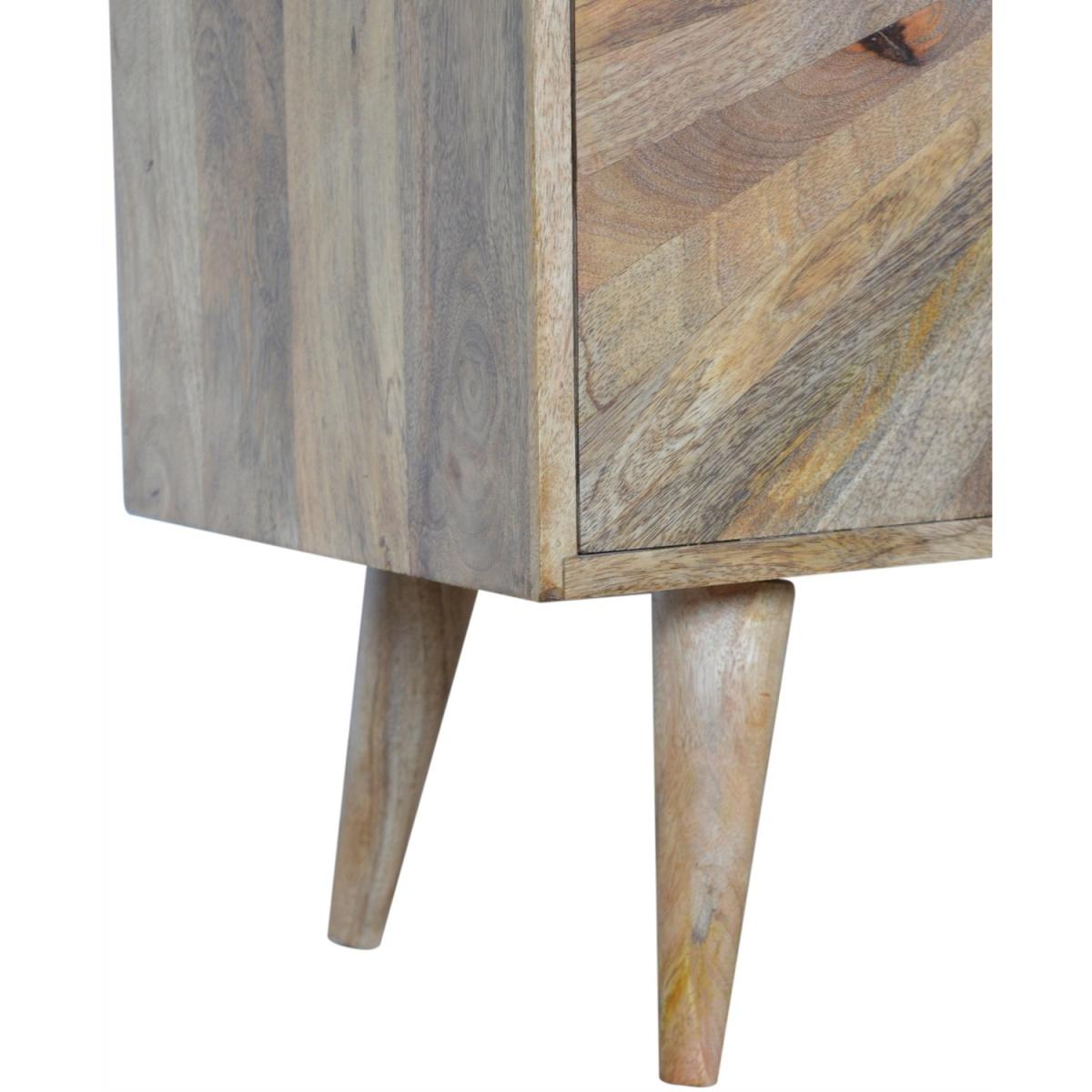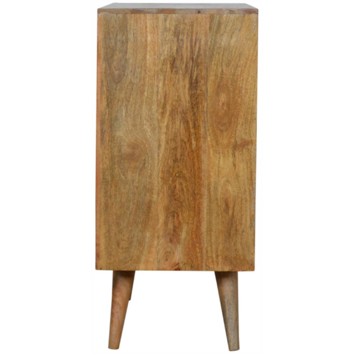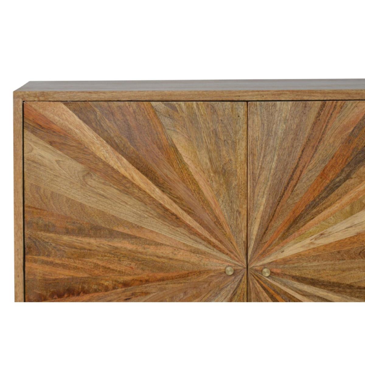 This cabinet has been designed to provide convenient storage space for your home. It has been constructed from 100% solid mango wood in an oakish finish with a sunrise pattern followed by shiny candle knobs. Offering a modern retro aesthetic, this cabinet is both a handy and timeless option for your home.