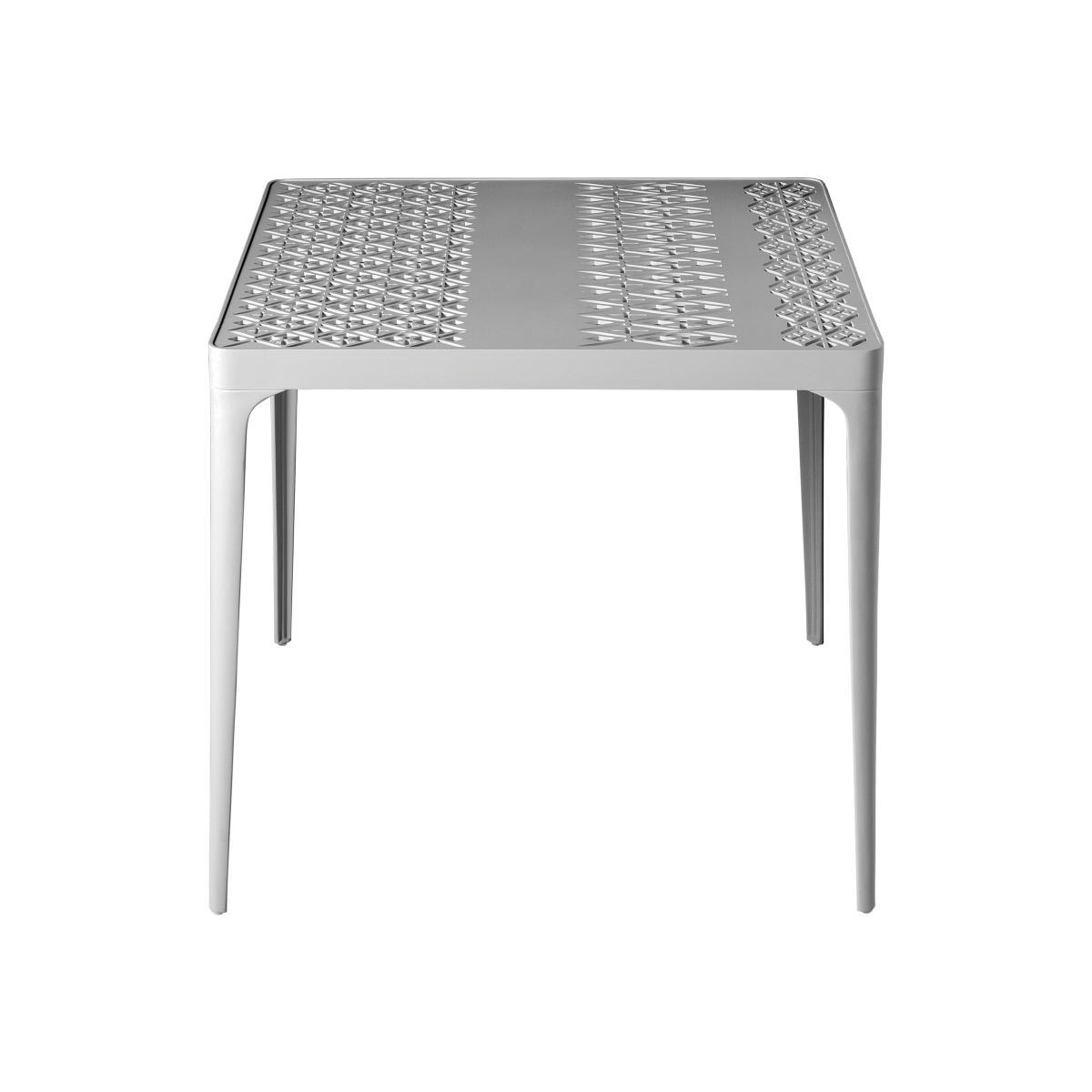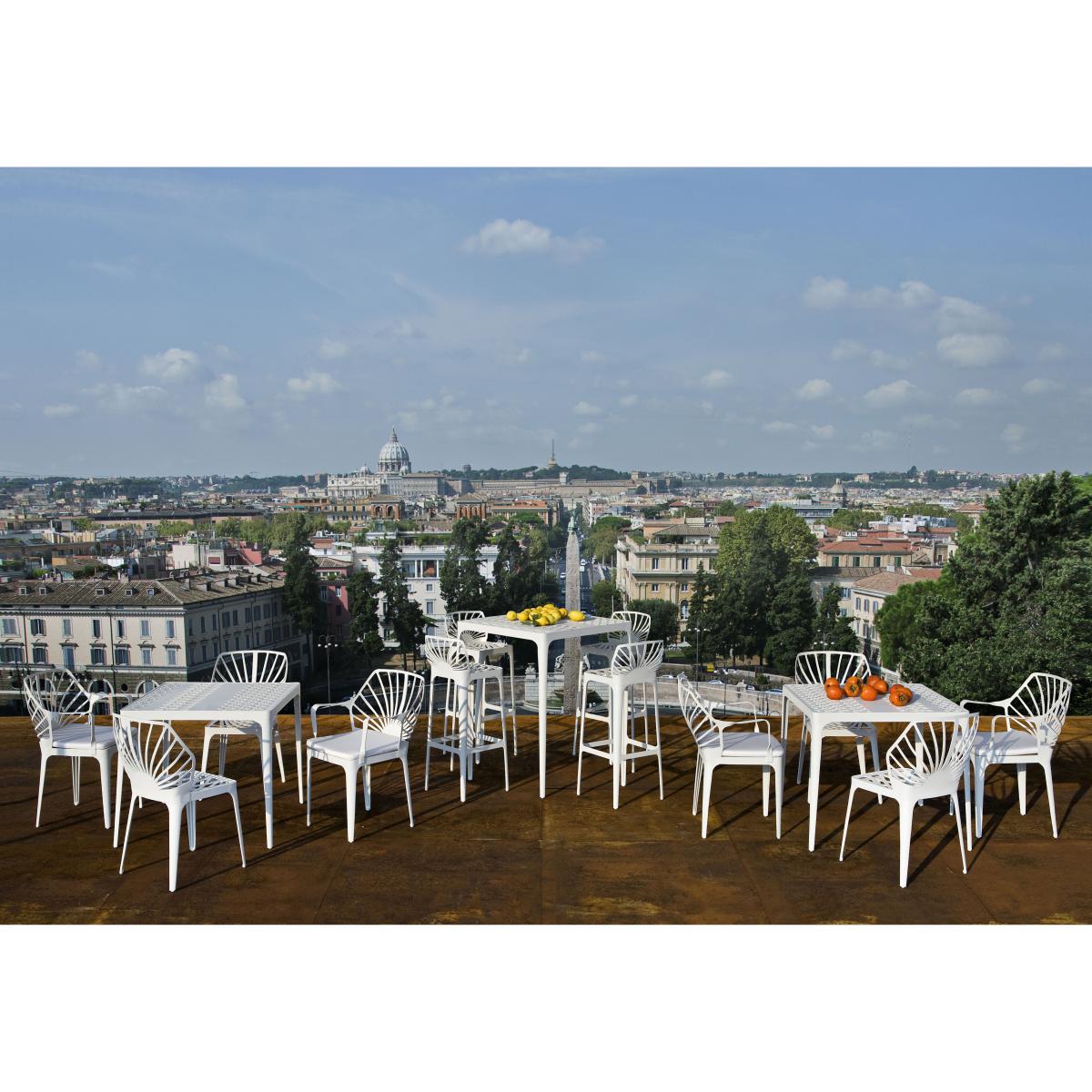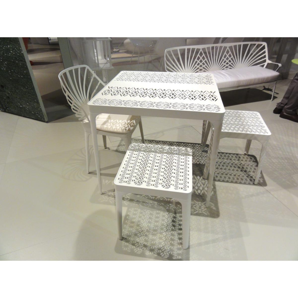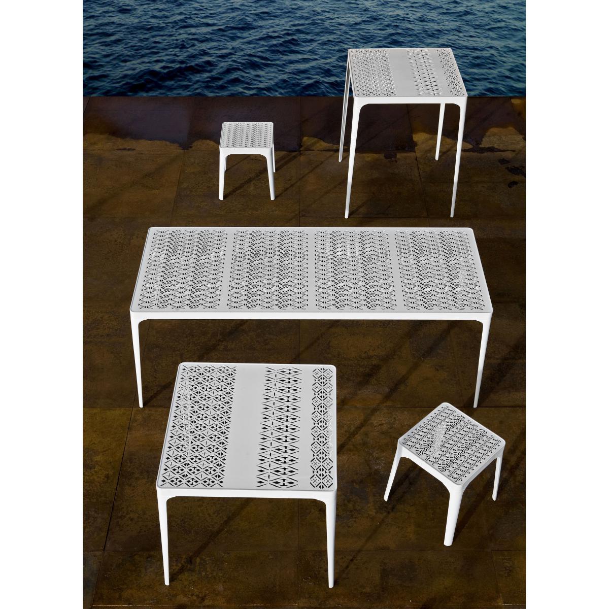 The sunrise outdoor collection by driade is showing references to classical outdoor cast iron furniture and modern use of an abstract symbol of a rising sun for the backrests. The sun is transformed in an ornamental pattern for the grid of the table top. The mix of classical and modern design features gives the collection a timeless look. The aluminium structure has been anodized and coated with white lacquer, which gives maximum outdoor durability. The collection consists of a chair, esay chair, stool, armchair, sofa and tables. White painted aluminum structure, seat and back. Chair, esay chair, armchair and sofa are equipped with a removable quick dry foamed white cushion.