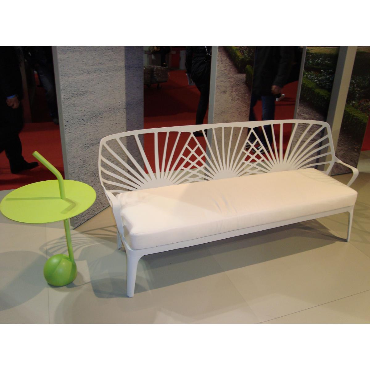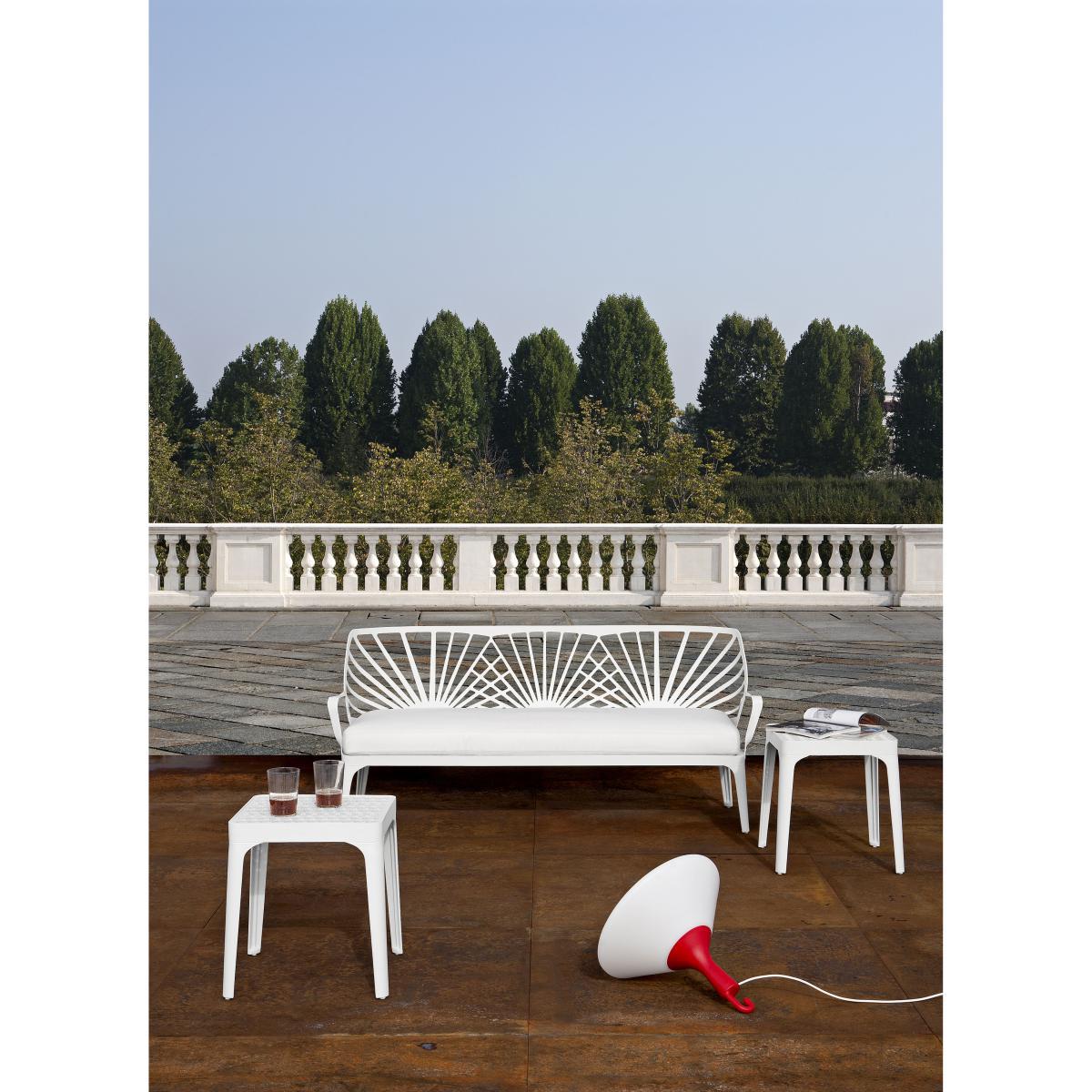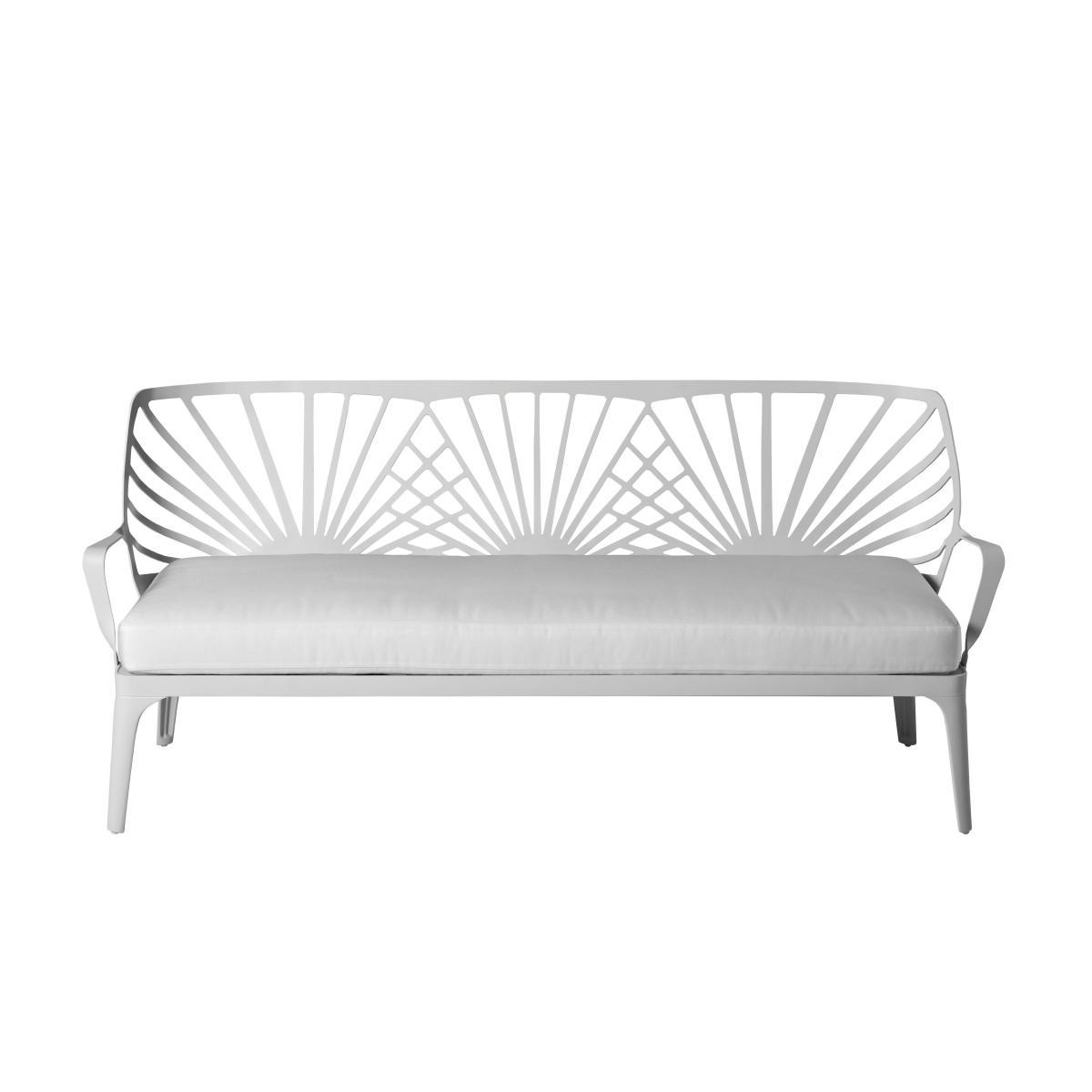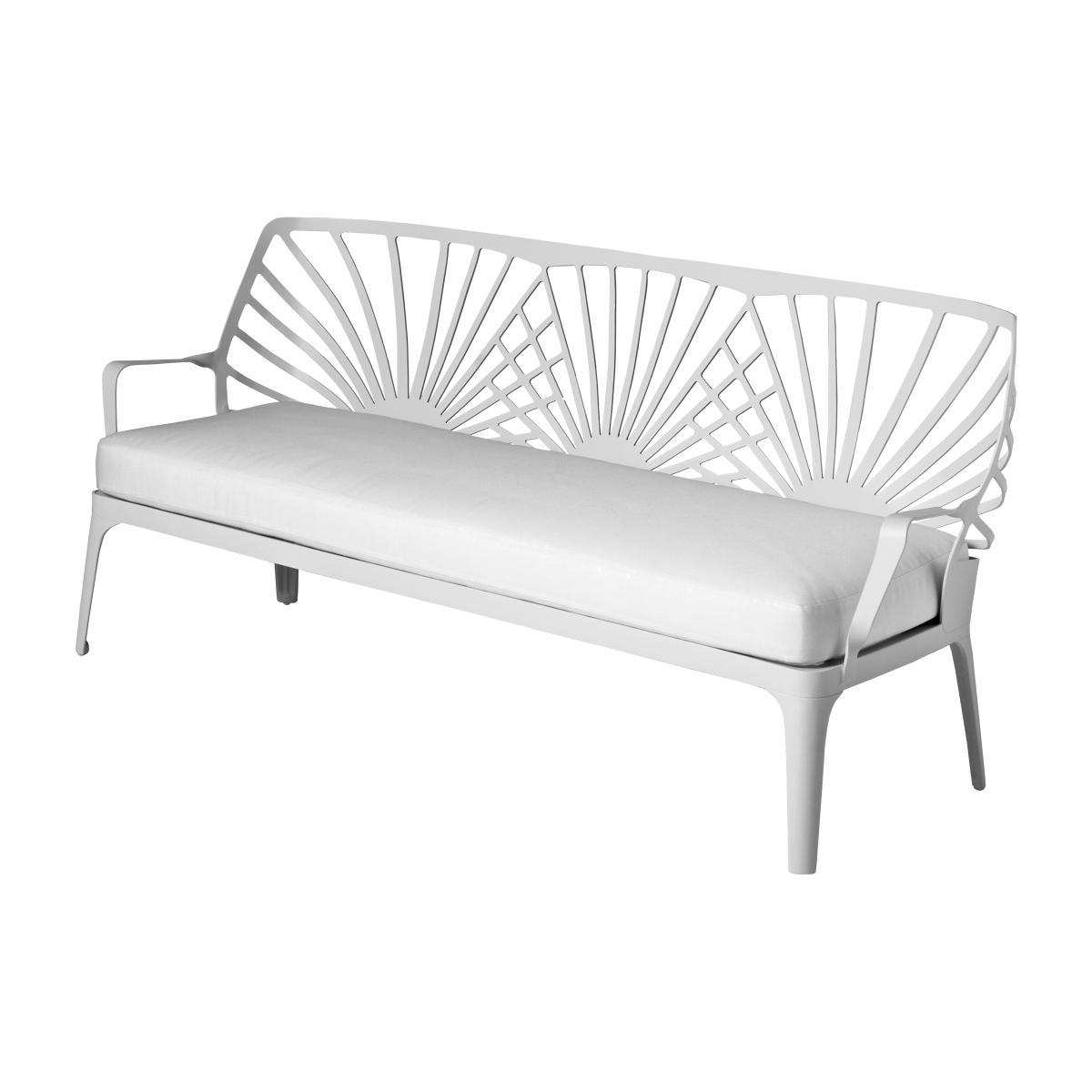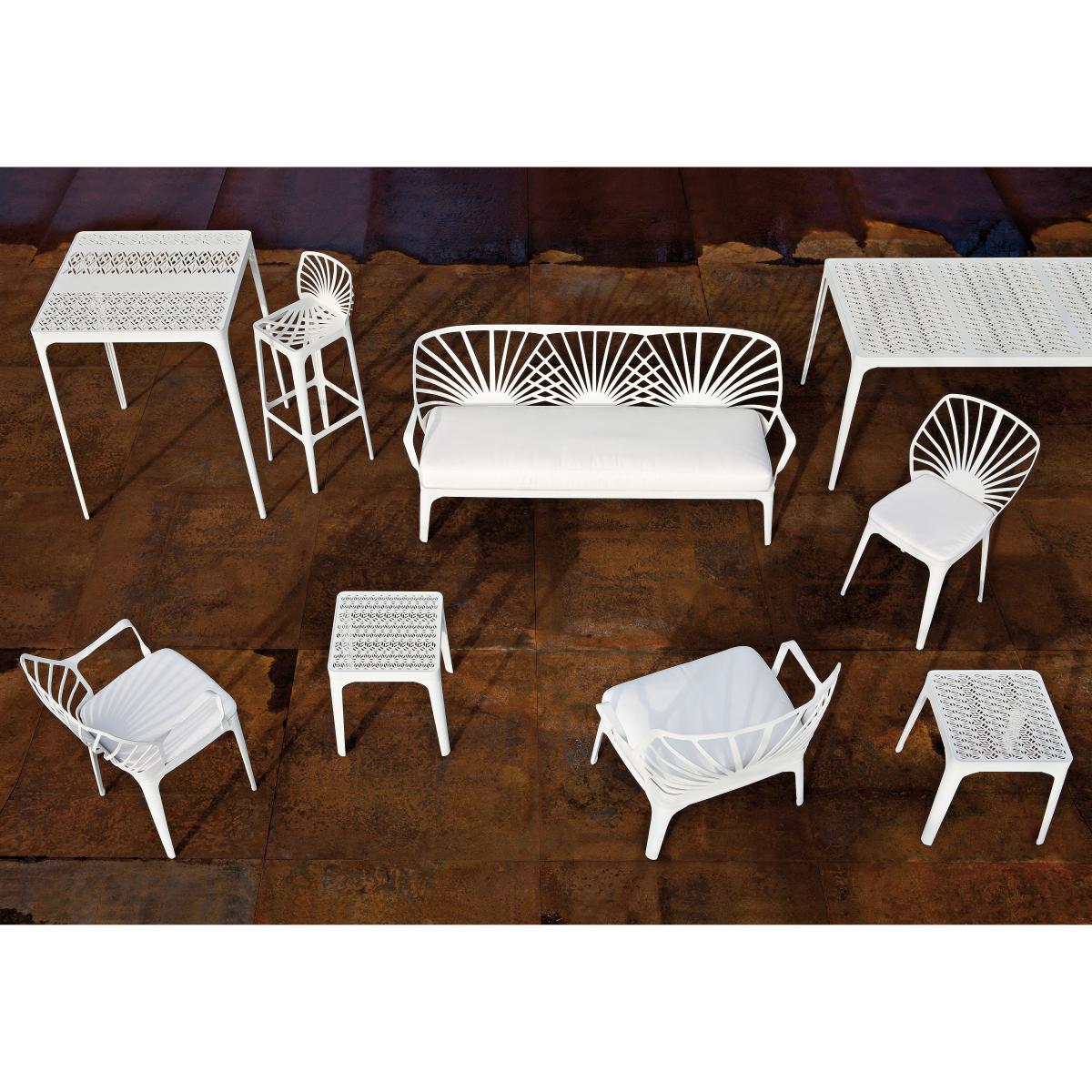 The sunrise outdoor collection by driade is showing references to classical outdoor cast iron furniture and modern use of an abstract symbol of a rising sun for the backrests. The sun is transformed in an ornamental pattern for the grid of the table top. The mix of classical and modern design features gives the collection a timeless look. The aluminium structure has been anodized and coated with white lacquer, which gives maximum outdoor durability. The collection consists of a chair, esay chair, stool, armchair, sofa and tables. White painted aluminum structure, seat and back. Chair, esay chair, armchair and sofa are equipped with a removable quick dry foamed white cushion.