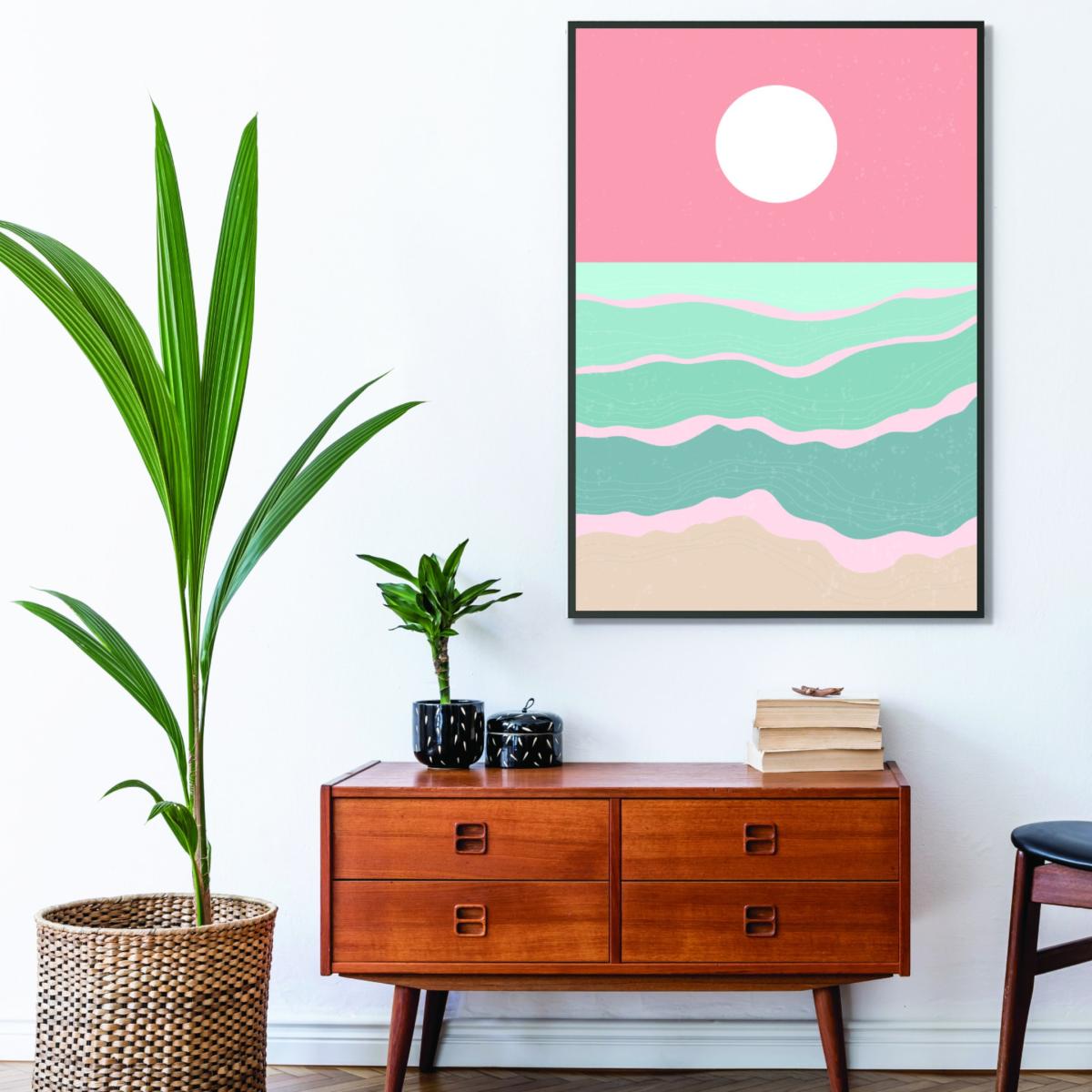 I love this print for its calming colour palette and minimal design, making it versatile for various interior styles. It works particularly well in relaxed spaces like seaside-themed rooms, bedrooms, or living areas with pastel or neutral tones. To style it effectively, consider pairing with light wood or modern white frames to keep the look fresh and understated. It’s also worth placing it above a simple console or floating shelf, where its tranquil scene can be appreciated without overwhelming the space. Overall, it’s a subtle statement piece that adds a touch of serenity to any room.