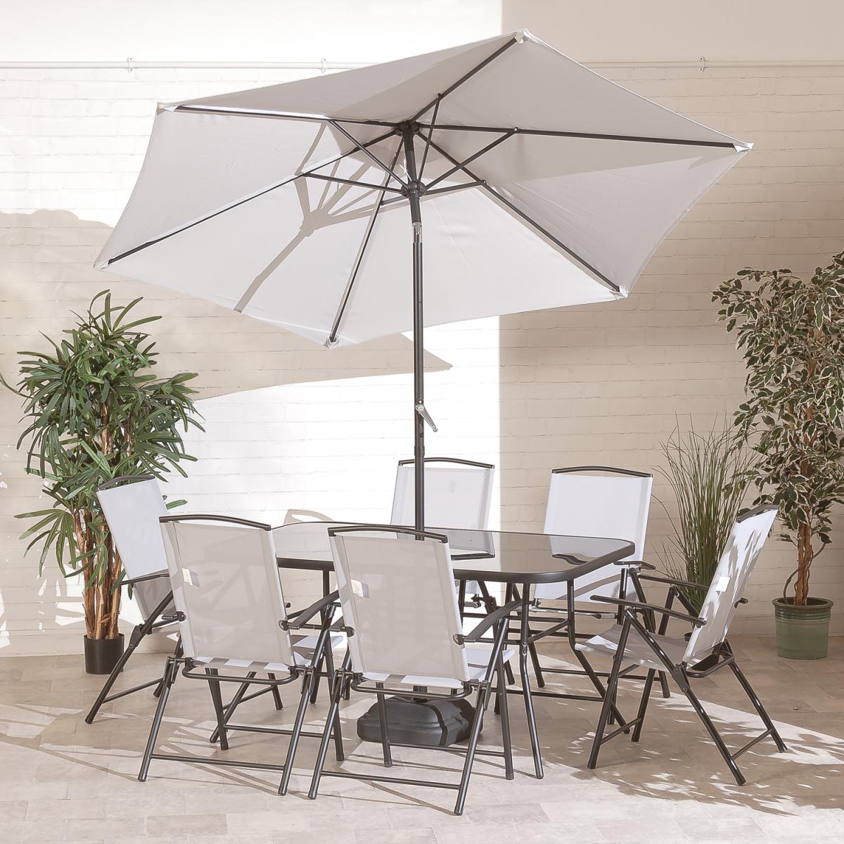 Introducing our Suntime New Memphis 8pc Dining Set, a perfect addition to your outdoor space. This set combines style, durability, and functionality to create a comfortable and inviting environment for relaxation and entertainment. The Steel Glass Rectangular Table is designed with a sleek and modern aesthetic. Its black powder-coated steel frame ensures sturdiness and longevity, while the black printed glass tabletop adds a touch of elegance. With a size of dia 140x90x70cm, it provides ample space for dining or gathering with friends and family. The inclusion of a parasol hole allows for easy setup and use with an umbrella to provide shade on sunny days. The accompanying Steel Textelene Reclining Chairs offer both comfort and versatility. Featuring a 2-position reclining mechanism, these chairs allow you to find the perfect lounging angle. The black powder-coated steel frames provide stability, while the textelene seating offers a combination of durability and comfort. With a size of 56x72x90cm, these chairs are designed to fit most body types and provide a relaxing seating experience. Completing the set is the Steel Parasol. With a size of 240x230cm, it provides ample shade coverage for your outdoor activities. The black powder-coated steel pole and ribs ensure stability and durability. The parasol features a crank and tilt mechanism, allowing for easy adjustment to block out the sun at different angles. Whether you're hosting a barbecue, enjoying a family meal, or simply lounging in the sun, this set will enhance your outdoor experience. *Parasol base sold separately