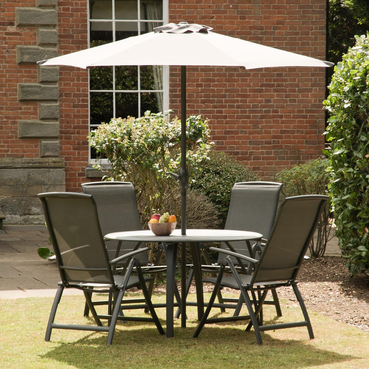 Our Havana Dining Set is a great option for your outdoor space this summer, with reclining chairs and the addition of a stylish parasol this set is great value for money. This set includes 4 texteline reclining chairs, 1 tempered glass table, and a parasol in polyester grey. This sophisticated set has a texteline fabric and is enhanced by the matt, rust-free aluminium framework. Extremely comfortable and hard-wearing, this furniture will be the focal point of your patio or lawn. Suntime Havana 1.2m Painted Reclining Dining Set - Charcoal