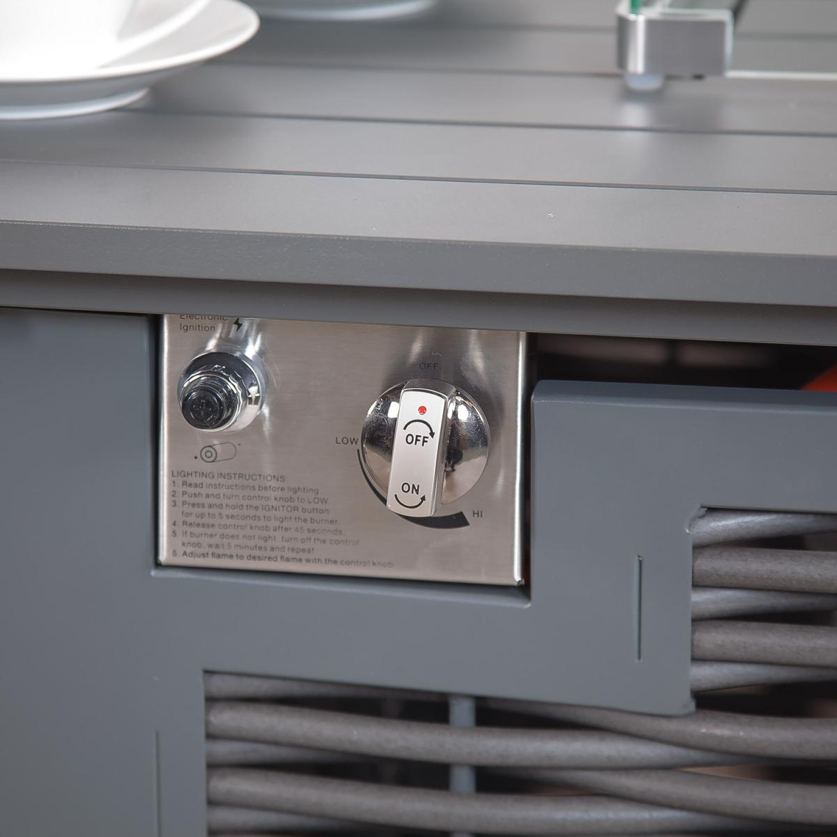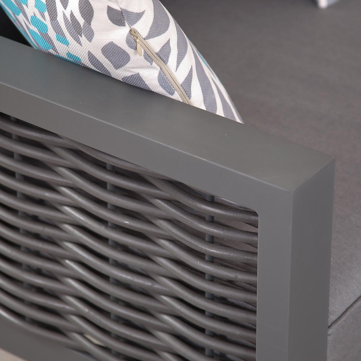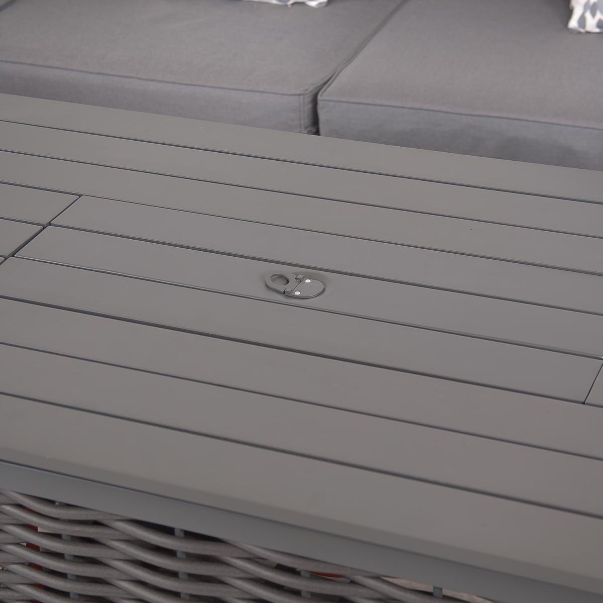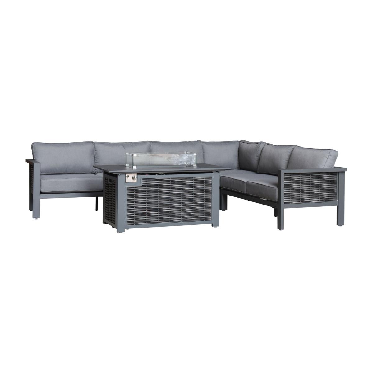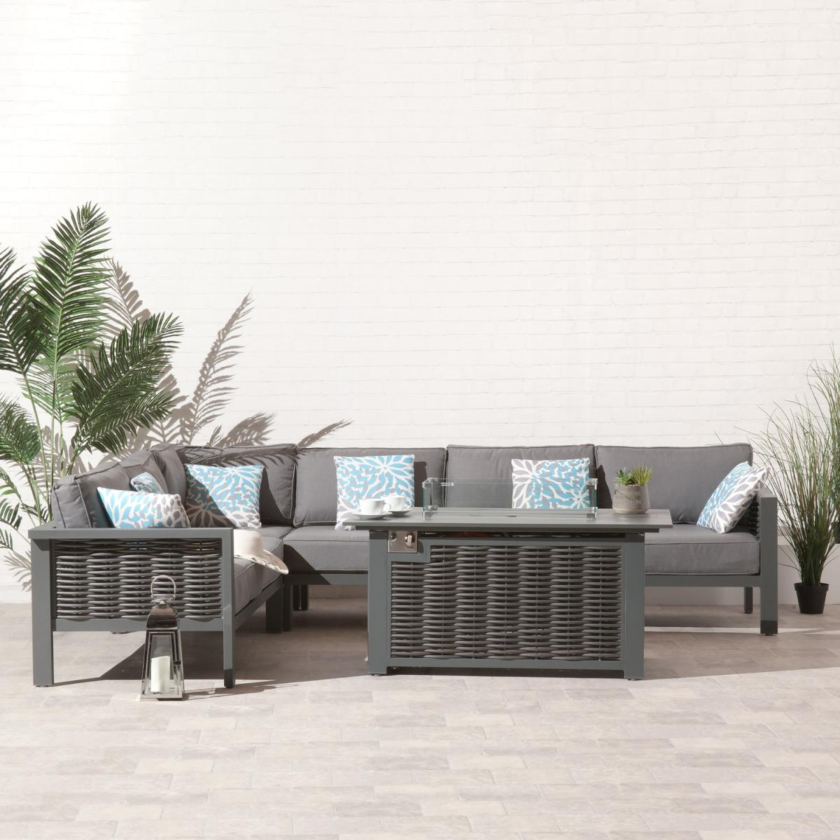 Introducing the Suntime Dallas Corner Sofa Set with Firepit Table, the perfect addition to your outdoor space! This elegant and modern set comes with everything you need to create a cosy and inviting atmosphere for your family and friends. Crafted from high-quality materials, this set features powder-coated aluminium frames and PE rattan weaving for added durability. The included firepit table is made with fire glass and a glass wind guard, making it safe and easy to use. With the UKFR standard for all glass and cushions, you can enjoy your outdoor space with peace of mind. The set includes a left-arm sofa, a right-arm sofa, a middle single sofa, and a single corner sofa, all complete with comfortable polyester and fawn cushions made with the high-density sponge and PP cotton. Additionally, the set comes with six matching pillows, each measuring 40x40x12cm, to provide extra comfort and style.
