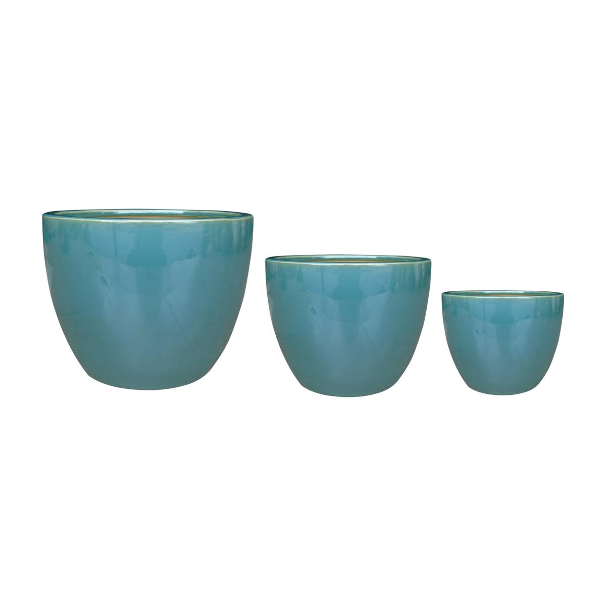 Introducing the Suntime Set of 3 Ceramic Indoor Pots, the perfect addition to your indoor gardening collection! Made with high-quality white clay material and finished with a stunning blue/green glossy finish, these pots are sure to add a touch of elegance to any room in your home. The set includes three different sizes of pots to accommodate various plant sizes and arrangements. The largest pot measures 29 x 29 x 23cm, the second pot measures 21 x 21 x 18cm, and the smallest pot measures 15 x 15 x 13cm. Each pot also comes with holes for proper drainage, ensuring your plants receive the proper amount of water without the risk of overwatering.