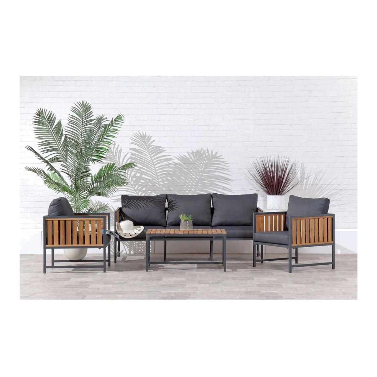 Enhance your outdoor living space with the sophisticated charm of the Suntime Turin Sofa Collection. This exquisite four piece coffee set, crafted from FSC certified acacia wood, combines sustainability with durability. The wood's high quality oil finish provides a stunning teak look, enhancing its natural beauty. The anthracite powder coated aluminium frame, reinforced with steel galvanised hardware, ensures a sturdy and rust resistant foundation that stands the test of time. Luxurious comfort is at the heart of this collection featuring plush thick seat cushions and back cushions in sleek black fabric. These cushions are designed for exceptional comfort, making every seating experience indulgent. The set includes a spacious sofa, two matching chairs, and a stylish coffee table. The contemporary aesthetics and streamlined silhouettes of the anthracite frame add modern elegance to any outdoor setting.