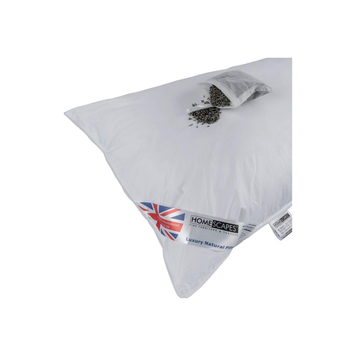 Drift off to sleep with the soothing scent of lavender infused inside this super soft and comfortable Microfibre pillow. This pillow comes with an inserted pouch of dried lavender to create a calming aroma and promote a restful night's sleep. Homescapes super Microfibre pillow is a synthetic alternative to natural fillings, meaning that it is hypoallergenic and suitable for allergy sufferers. The spongey filling has a bounce-back quality, so it offers excellent support and cloud-like comfort. It is cased inside 100 microfibres, a breathable fabric that will allow the soothing lavender aromas to infuse throughout the night. Dried lavender is contained within a secure cotton pouch and is placed inside this pocketed pillow.