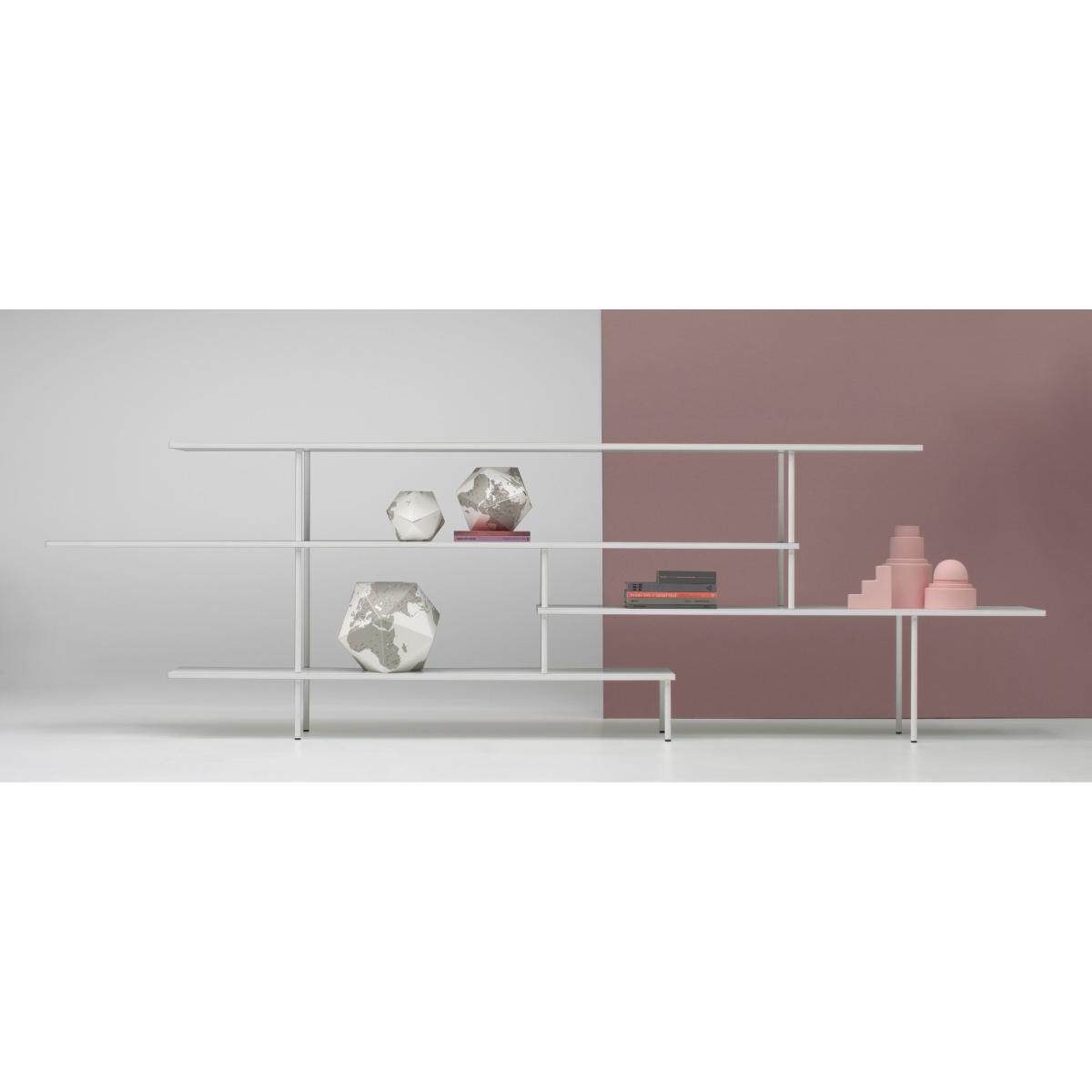French architect and designer Jean Nouvel is behind many essential creations in France and around the world. For MDF Italia, he created Super_position: a deconstructed bookcase with a graphic look and incredible formal lightness. Entirely made of extruded aluminium, Super_position presents a tree-like array of shelves connected by round, vertical uprights. The fine, clean lines bring great lightness to this large structure. This large bookcase brings originality and modernity to your walls. Jean Nouvel on the Super_position bookcase: “This layering [superpositions] is a hymn to the lightness of horizontality. Cut through by the discontinuity of uninterrupted uprights, the flat sections are small diving boards that venture into the ambient void. Objects, vases and sculptures can express their different scales in the empty spaces, niche spaces in the centre or at the ends of the overlapping lines. ” Entirely made of aluminium, the Super_position bookcase is 100% recyclable. Super_position consists of extruded aluminium uprights and shelves, assembled using an invisible joining system, capable of ensuring structural stability and special load capacity. This bookcase comes disassembled (assembly instructions provided). It’s essential to fix the bookcase to the wall.