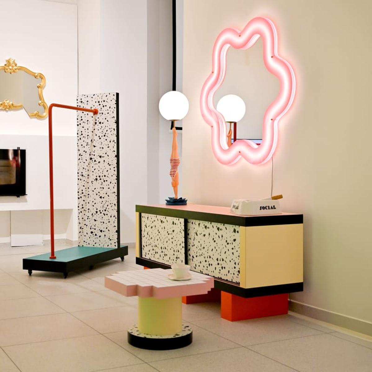 The audacity of radical Italian design revisitedWith Superfurniture, Seletti and the anonymous Hello Again collective of designers and artists brilliantly reinterpret the radical Italian design of the 60s and 70s. A tribute to the Memphis movement, this bold furniture collection shakes up aesthetic conventions by combining striking geometric shapes, vibrant pop colors and expressive graphic motifs. In the tradition ofEttore Sottsass, Superstudio and the Memphis Milano group, Superfurniture celebrates design where creativity takes precedence over pure functionality. Gone are the wise lines and austere minimalism of this collection, which assumes an exuberant, free-spirited language in the image of 80s postmodernism. The terrazzo motif and the grid pattern on a white background are direct references to the icons of radical design, evoking in particular Superstudio' s famous Quaderna collection for Zanotta. With its bold colors and ironic visual language, Superfurniture revives the provocative spirit of radical design, making it current, punchy and accessible. This project embodies the perfect synergy between thevisionary energy of this movement and Seletti 's core values: creativity, curiosity and daring in the face of convention. Sculptural design and a strong signature A tribute to the Memphis movement: a blend of pop culture, graphic experimentation and architectural audacity. Statement furniture: eye-catching pieces that breathe creative energy into contemporary interiors. Premium materials: structures in MDF, wood and laminate, combining solidity and meticulous finishing. Unconventional design: between radical design heritage and contemporary reinterpretation, a collection that energizes every space. More than just a piece of furniture, Superfurniture is a true statement of intent aimed at lovers of avant-garde design. With this collection, Seletti and Hello Again extend the heritage of Memphis Milano and reaffirm the importance of design as an artistic playground and a space for creative freedom. Dare to be radical and turn your home into an art gallery! In detail: Variation : About Terrazzo Brand : Seletti Designer :Hello Again Type : Rack Colour : Multicoulered Material : MDF - Metal - Stratified - Wood Dimensions : 120 x 48.3 x H 173 cm Weight :101.2 lb Characteristics : Rack with mirror (mirror included) - Casters for easy movement - Tribute to radical Italian design of the 60s and 70s - Memphis inspiration Show less