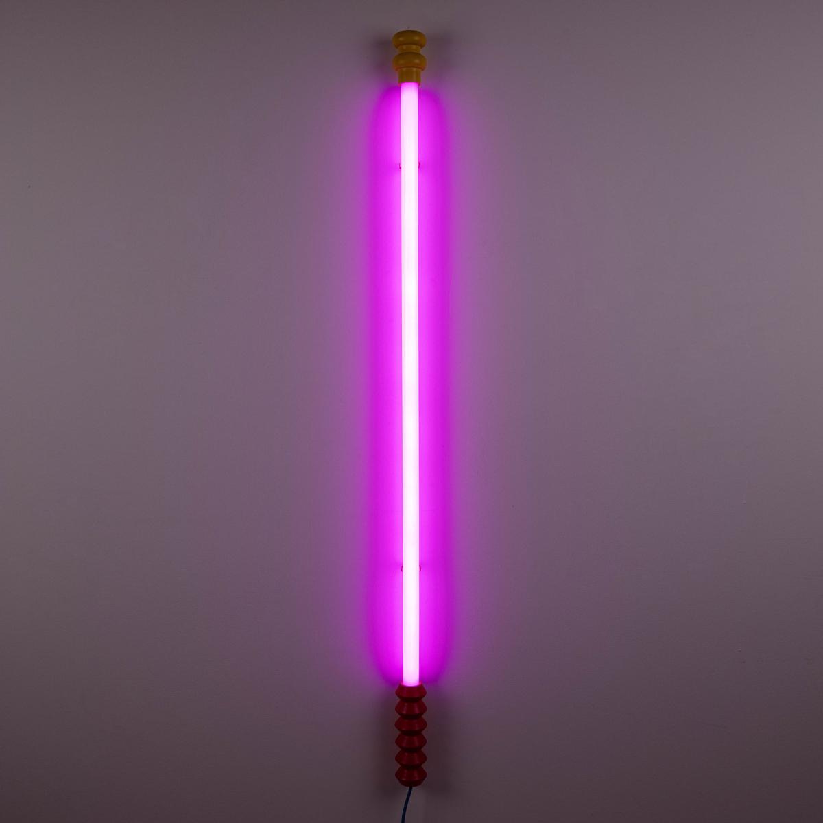 A pop style for these neon-style wall lights with their flashy colours. The ends of these long glass tubes are covered with fun painted wooden tips. Extravagant and full of energy, Superlinea wall lights enliven and colour your space. They create a very trendy "arty" atmosphere in the bedroom, living room or entrance. This tube can be attached to the wall using the mounting rings (included) which hold the tube in the desired position (straight or at an angle) and provide secure stability. This wall light comes with a cable with a plug to connect to the mains. On/off switch on cable.