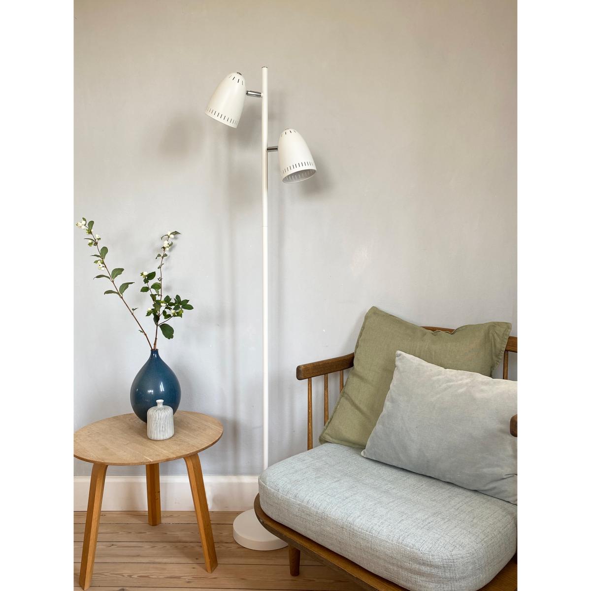 Dynamo Twin floor lamp by Superliving is designed by Anette Stabel and manufactured with two adjustable shades that have a decorative perforated edge, creating a soft and pleasant light distribution. The sleek design makes it easy to place in different rooms, whether used as a reading lamp by the armchair or to provide directed light at a workspace. The stable lamp base and flexible swivel function offer both functionality and character, perfect for a timeless and well-considered home.