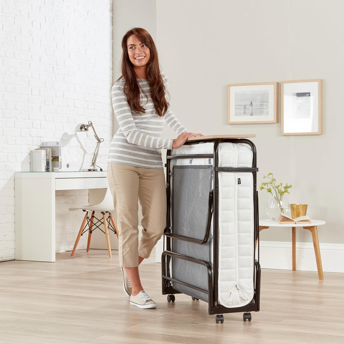 Resting on the exclusive Jay-Be J-Tex™ sprung base system the Micro e-Pocket mattress encapsulates over 400 individual micro pocket springs with the additional benefit of a comfort layer made from the exclusive Jay-Be Rebound e-Fibre™. Each spring works independently with the premium fillings to adapt to the contours of your body offering luxurious comfort for a quality night’s sleep. Developed with our planet in mind, this ultra-comfortable Rebound e-Fibre support layer is created by bonding specially engineered fibres made from recycled plastic materials - preventing them from going to landfill or into our oceans. The Rebound e-Fibre support layer is also 100% recyclable again after use, so that your mattress can be responsibly disposed of. For ultimate convenience the 360° castors on this guest bed make manoeuvring around the room easy and the fully automatic leg mechanism makes it even easier to open and close in seconds. The addition of a headboard secures your pillow and the foot end helps keep the mattress in place for an undisturbed night’s sleep. All Jay-Be Folding Beds achieve British, European and Internationally recognised safety standards and come with a free lifetime frame guarantee for your complete quality assurance.