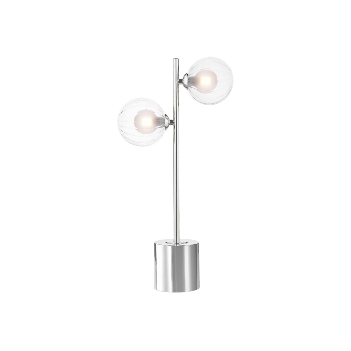 Understated glam style is the motif of our Suri two-light table lamp. A beautiful combination of polished chrome metal and opal glass, it brings warm light to any room. Why you'll love it Elegant and glam 2-light table lamp. With 2 ribbed glass light shades with opal inners to reduce glare. Polished chrome stem and cylindrical base. A stylish addition to any living room. Ideal as bedroom lighting in a modern space. This table lamp is part of the Furniture Village lighting collection. What you need to know Steel base, glass shades. Supplied with 150 cm cable. Requires 2 x G9 max. 40 W bulbs (not included). Please do not exceed this wattage. To clean, wipe gently with a clean soft cloth. Be sure to disconnect from the power outlet before cleaning. Dimensions including shade Height: 48 cm (19 in). Diameter: 22 cm (9 in). Item code: SURI2TBLCRM-001