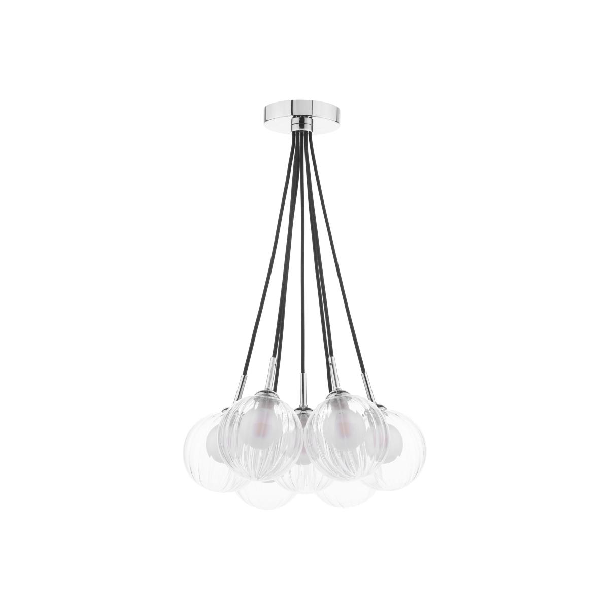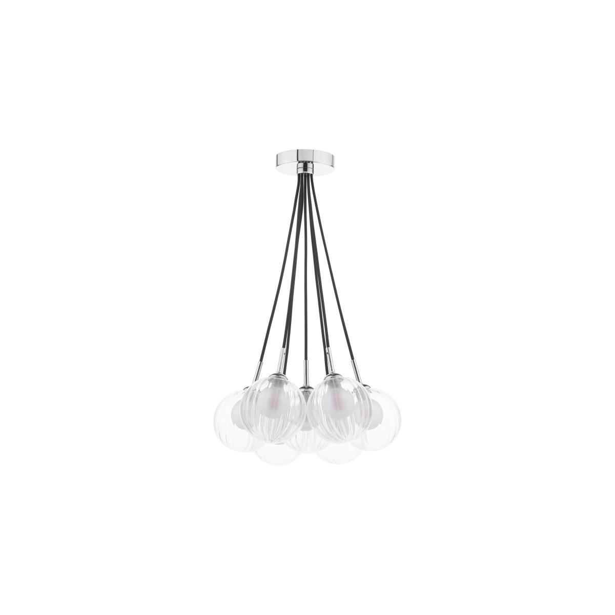 Our Suri cluster ceiling pendant is a beautiful centrepiece over a dining room table or an eye-catching focal point in a stairwell. The glass shades can be adjusted to hang at different lengths. Why you'll love it Elegant and glam 7-light cluster ceiling pendant. With 7 ribbed glass light shades with opal inners to reduce glare. With professional help, shade cables can be adjusted to vary the hanging length. Polished chrome ceiling rose and details. Perfect for stairwells and dining rooms. Height-adjustable at installation. This ceiling cluster pendant is part of the Furniture Village lighting collection. What you need to know Steel base, glass shades. Professional installation advised. Requires 7 x G9 max. 25 W bulbs (not included). Please do not exceed this wattage. To clean, wipe gently with a clean soft cloth. Be sure to disconnect from the power outlet before cleaning. Dimensions Height: 108 cm (43 in). Diameter: 30 cm (12 in). Item code: SURI7PNDCRM-001