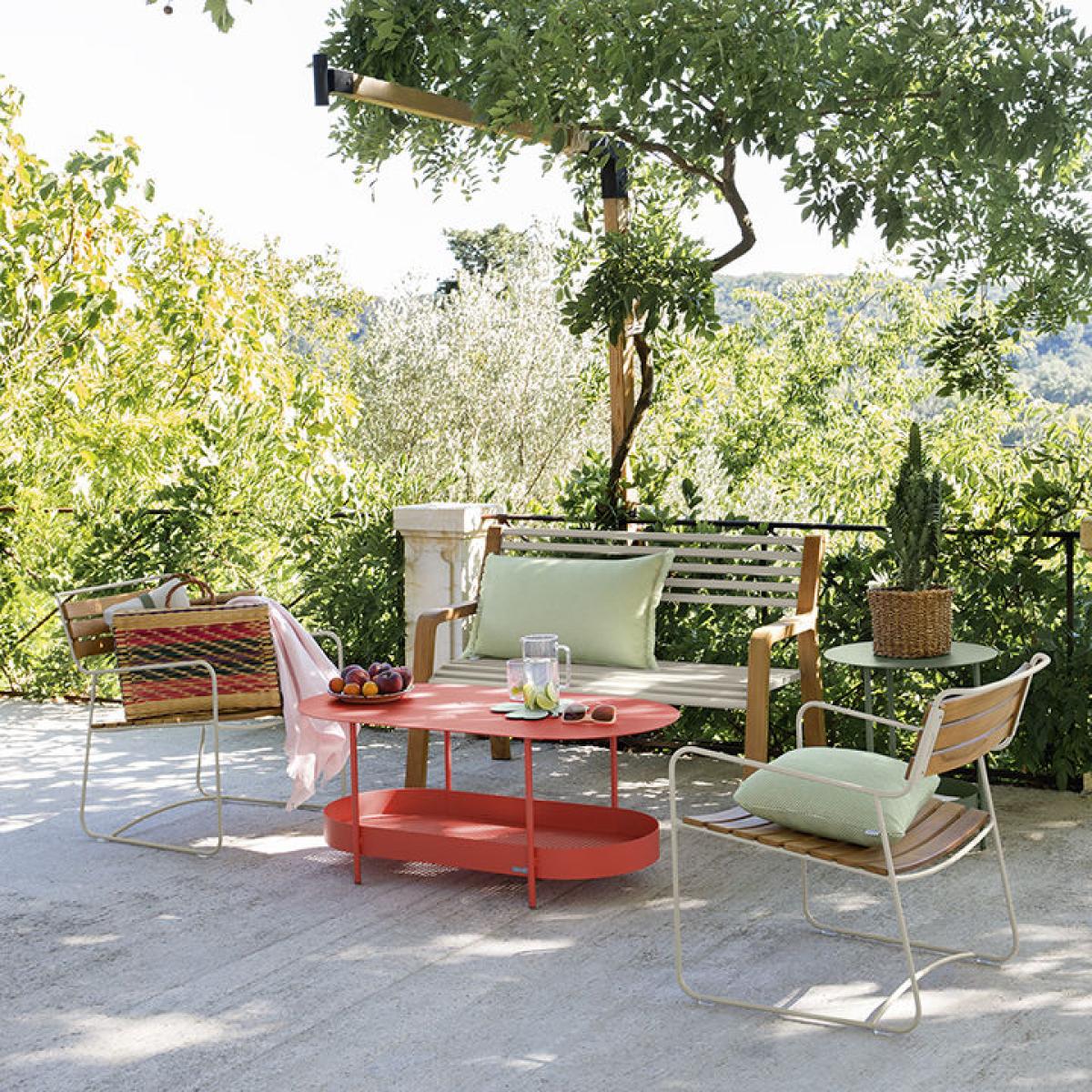 The Surprising low armchair perfectly embodies the essence and charm of this collection: natural teak slats, a stylish steel-rod frame and ergonomic design for maximum comfort. This combination of robust metal and warm wood perfectly showcases Fermob’s material expertise and demonstrates its desire to broaden its range. The result is a bold, very contemporary outdoor piece with a colourful frame, enhanced by elegant teak. A low wood and metal armchair for both indoor and outdoor use.