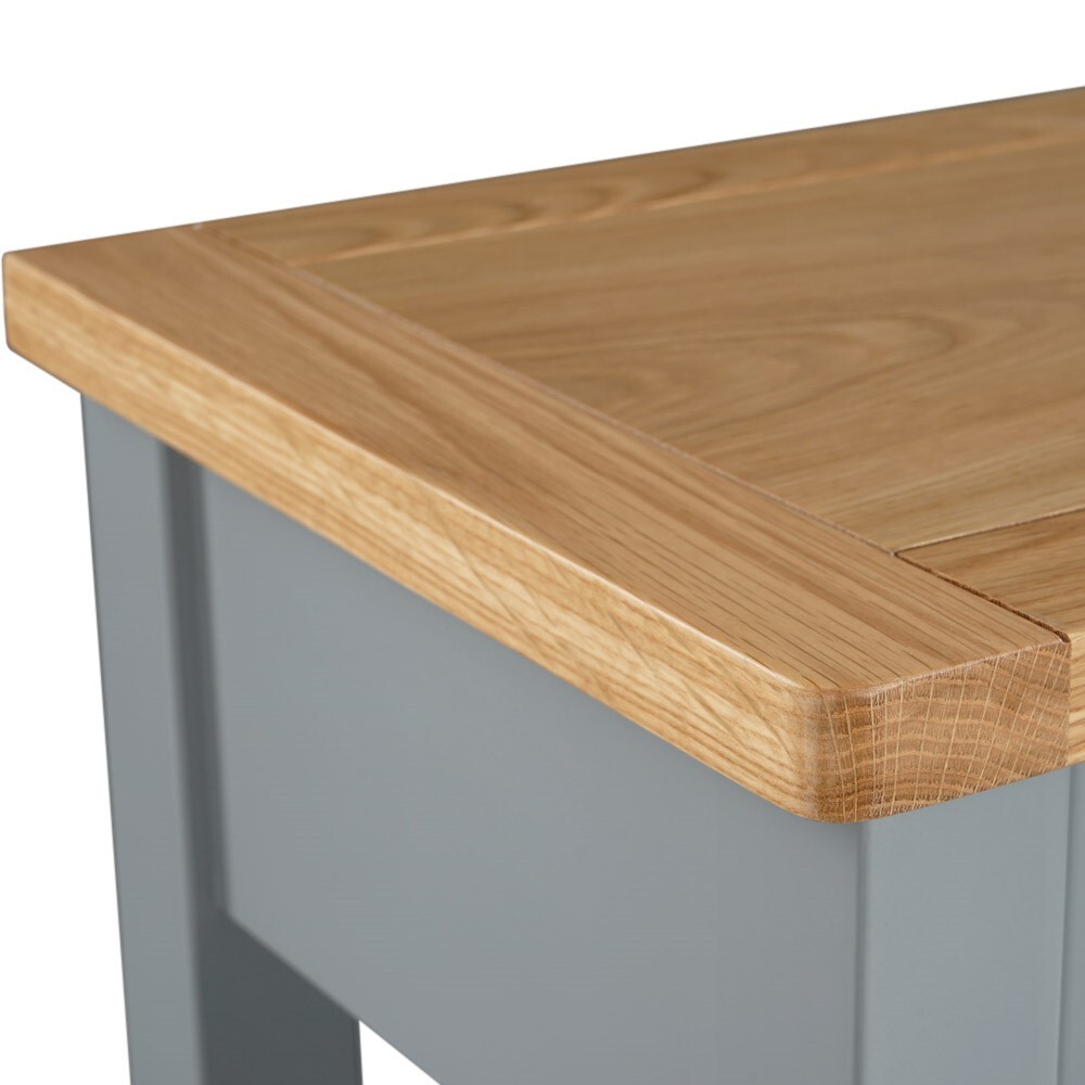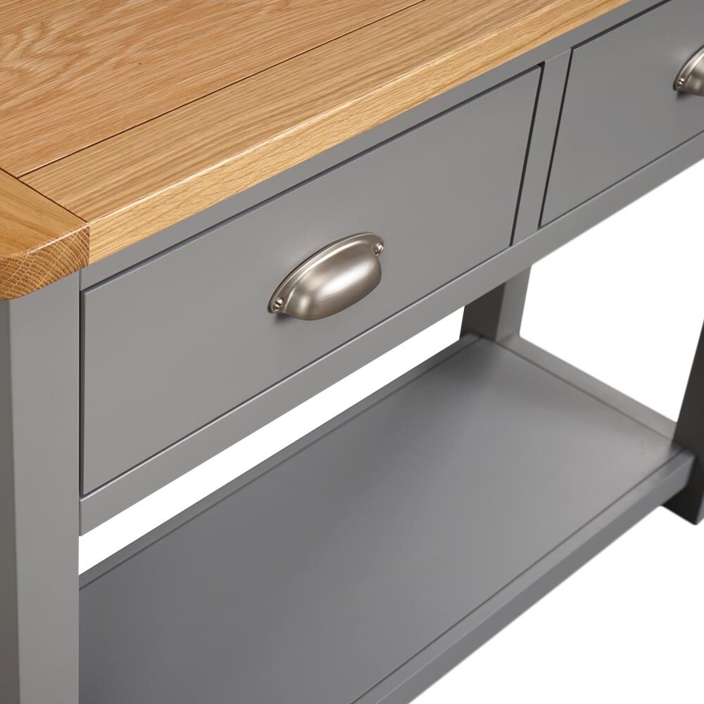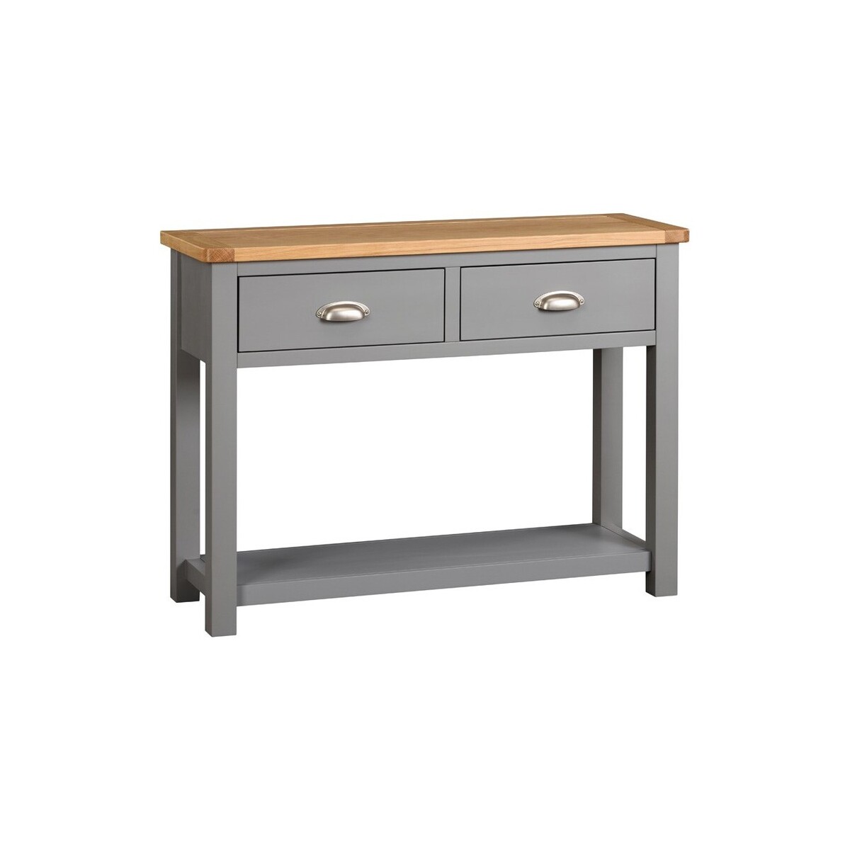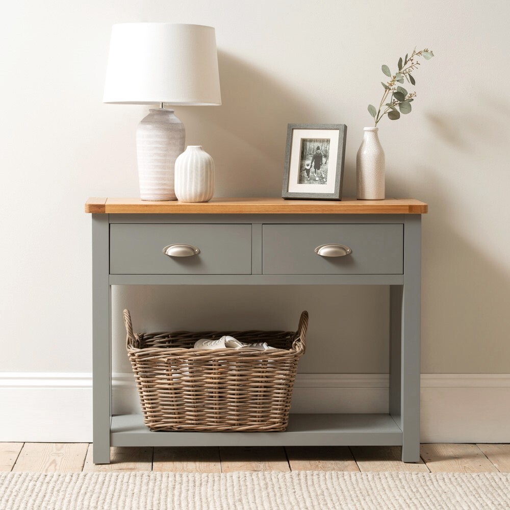 Liven up your hallway with the stunning grey painted finish on this console table. Its been compared to Farrow & Ball's Plummett, so you can go to town on the decor too. Stand a vase of your favourite blooms on its solid oak and oak veneered top, and keep clutter free with the handy drawers featuring brushed steel handles for that contemporary flourish.